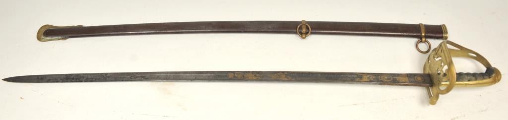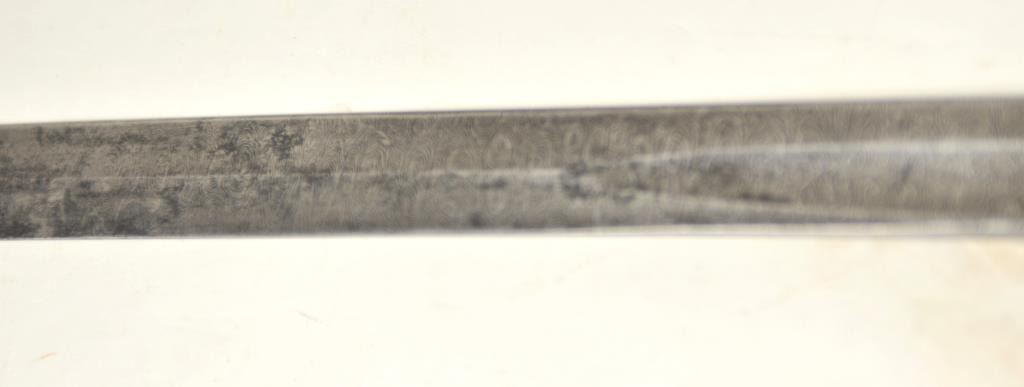 Imported Civil War Variant Patter Officer’s sabre with pierced guard showing standing liberty. The blade is Damascus patterned with panel that reads, “Most Respectfully dedicated by Wm. Walshed Sword CutletSolingen”. The reverse reads in similar panel “Wagner and Malscheid Agents, 51 Mairen Lane New York” shows Walsheid Solingen maker’s mark. The condition is very good plus and may clean to fine. Most likely a display sampleor exhibition piece for sales purposes. Est.: $1500-$300