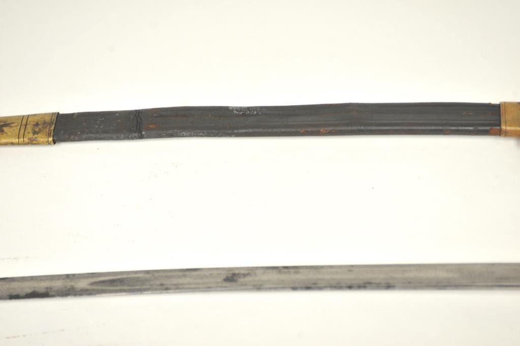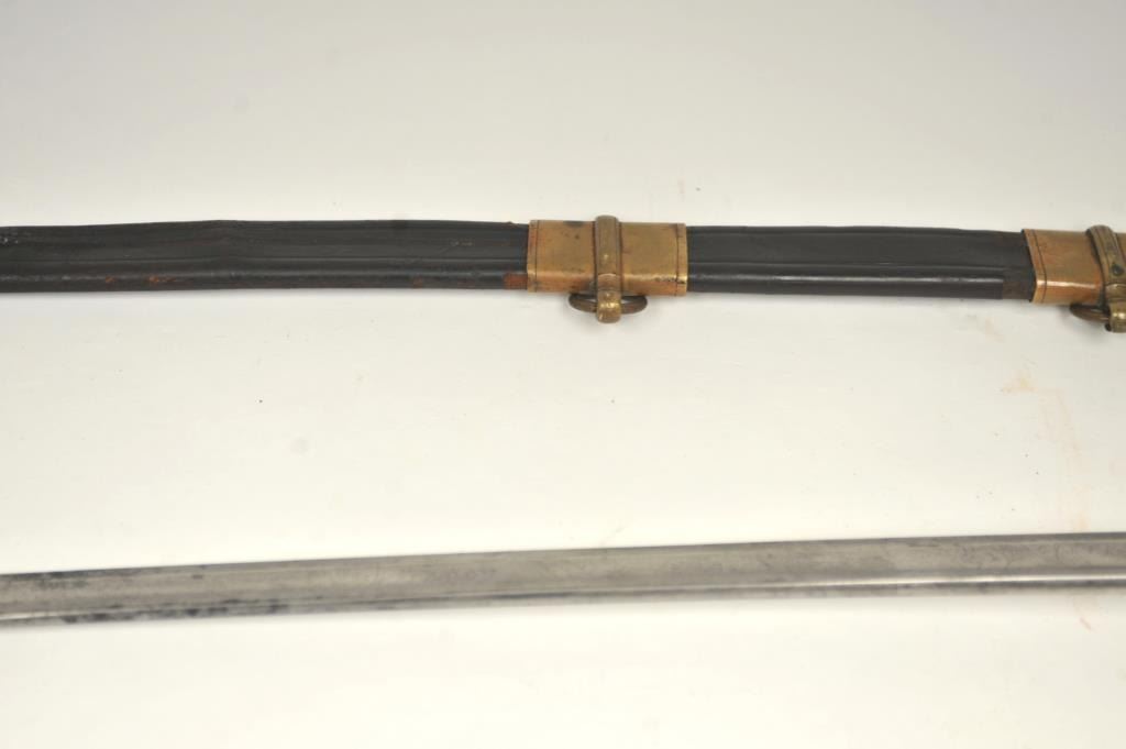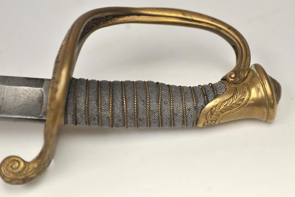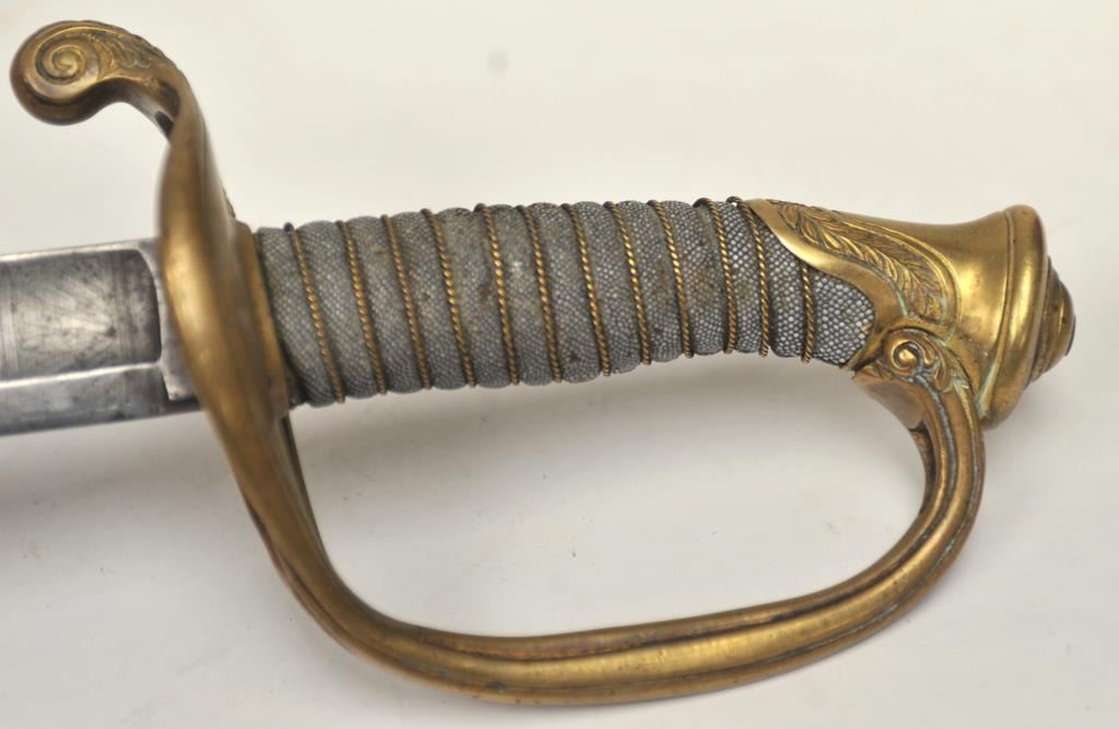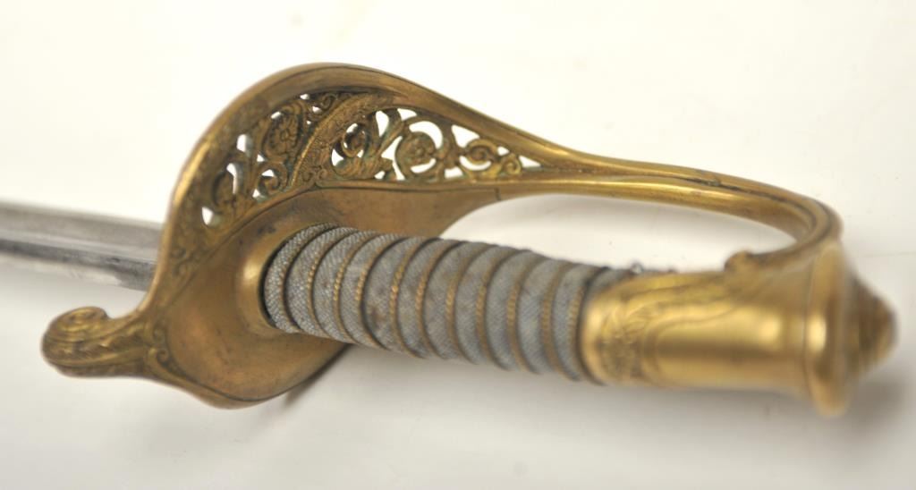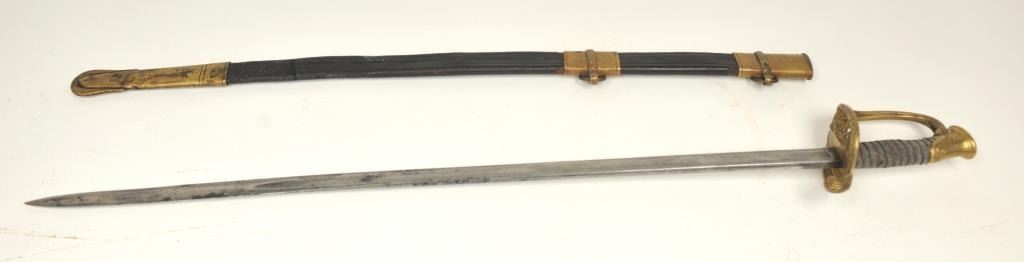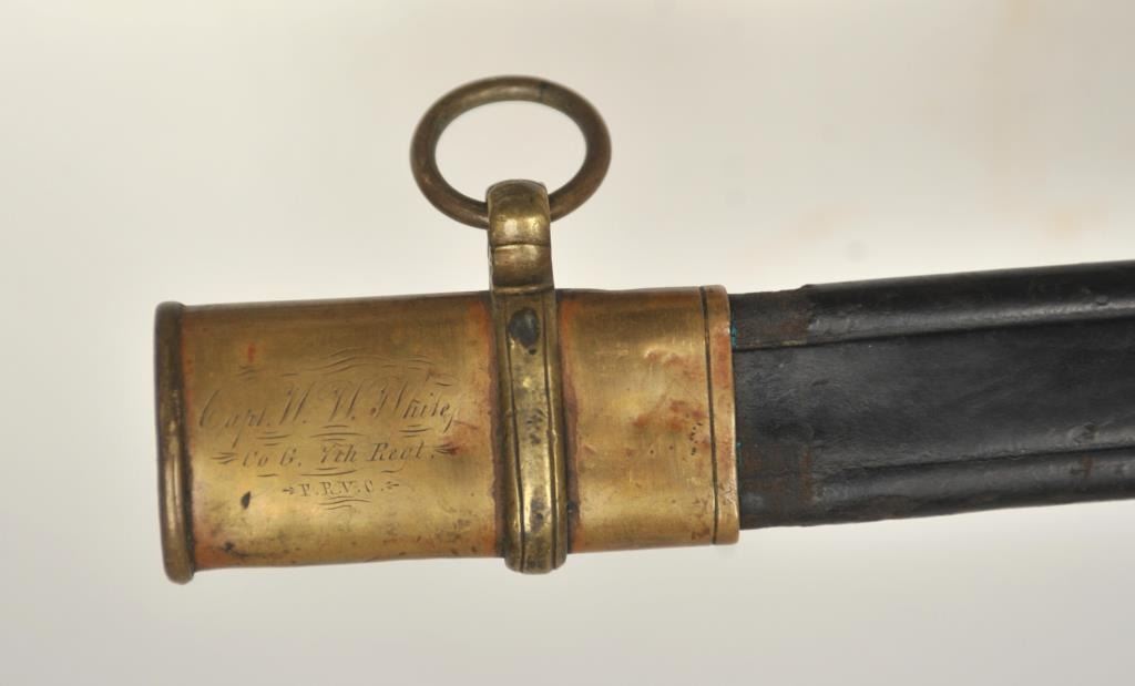 U.S. Model 1850 Officer’s Sword with scabbard which is period engraved in script “Capt. W.W. White Co. 7th Reg’T, P.R.V.C.” the word is unmarked and no proofs. Etched blade in typical stands of flags, scrolls and U.S. incenter panel on the reverse. Single branch floral D”D guard with wire wrapped sharkskin grip. The condition is good to very good overall with some damage and age to the scabbard which is a quarter inch too shortfor blade possibly due to repair at the end, shrinkage or replacement from another sword but seems to match condition wise. Est.: $1400-$2800