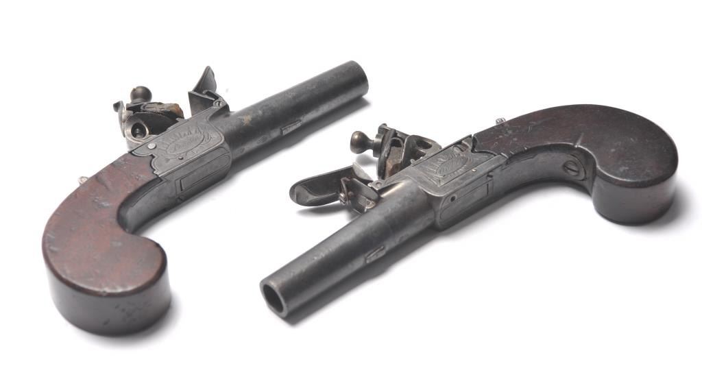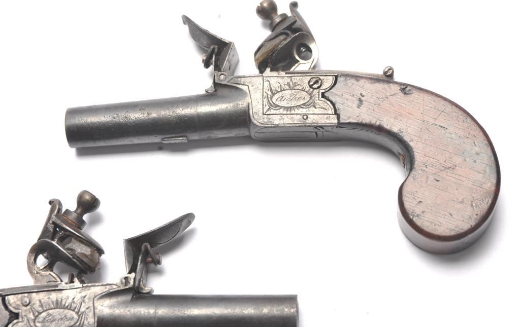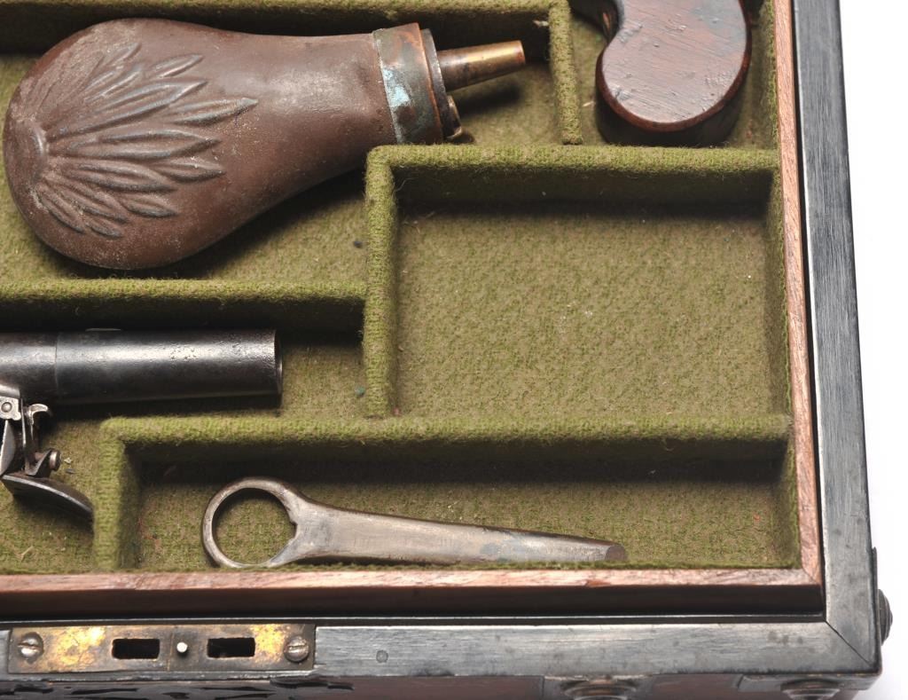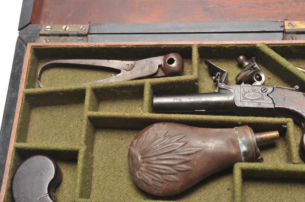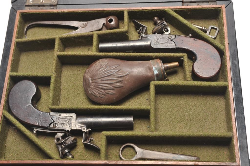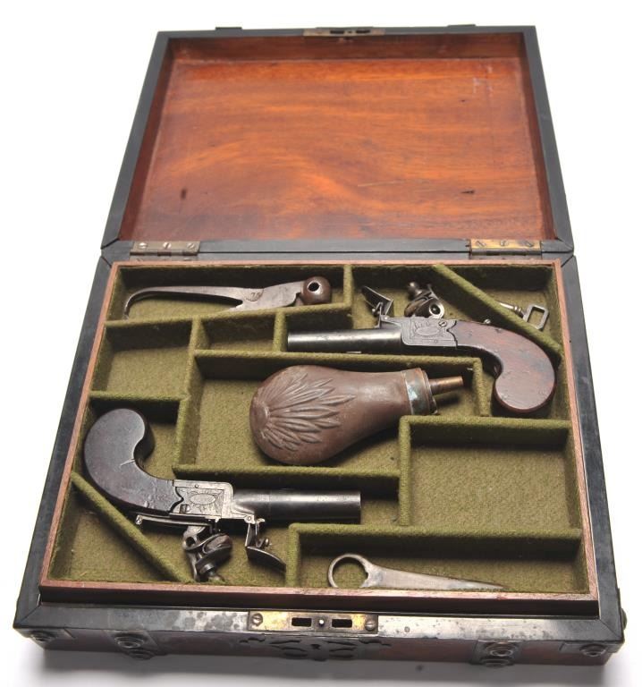 Pair of center hammer flintlock muff pistols signed “Archer, London” contained in deluxe brass bound and burl wood veneered casing lined in partition style with typical green felt. The upper portion of the case lifts out so the bottom can be used for letters, documents, currency or writing utensils and etc. the pair are in good to very good condition with normal aging, minor wear and imperfections. A flask, mold and crude barrel key are included. The exterior of the casing is also good and shows good patina on the ornate brass straps and raised studs. Made circa about 1800-1820. (Antique) Est.: $900-$1800