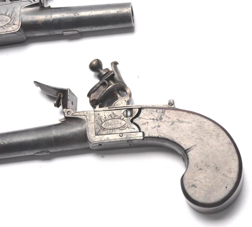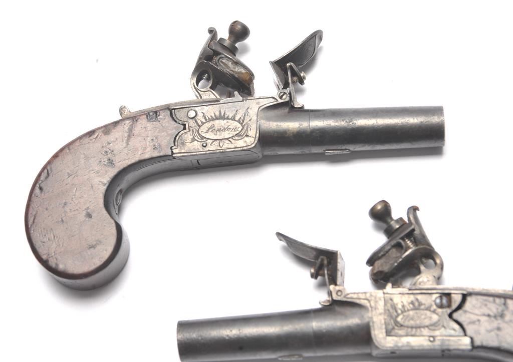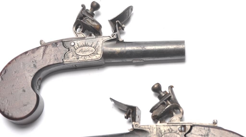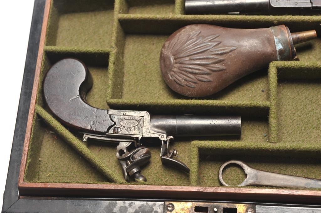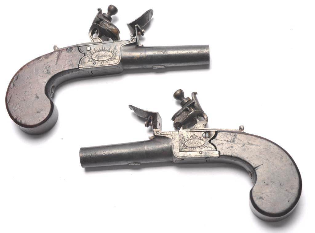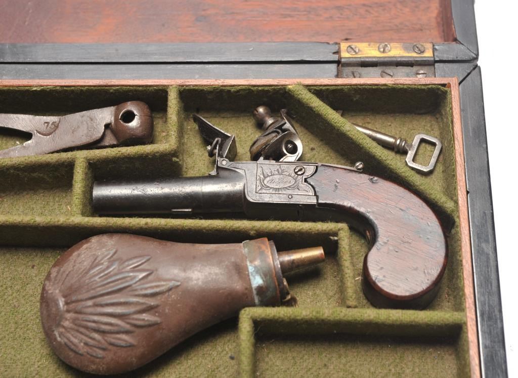 Pair of center hammer flintlock muff pistols signed “Archer, London” contained in deluxe brass bound and burl wood veneered casing lined in partition style with typical green felt. The upper portion of the case lifts out so the bottom can be used for letters, documents, currency or writing utensils and etc. the pair are in good to very good condition with normal aging, minor wear and imperfections. A flask, mold and crude barrel key are included. The exterior of the casing is also good and shows good patina on the ornate brass straps and raised studs. Made circa about 1800-1820. (Antique) Est.: $900-$1800