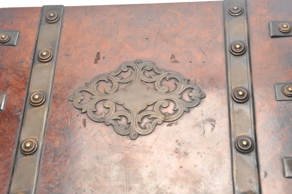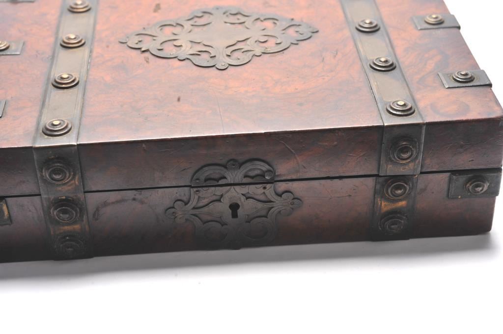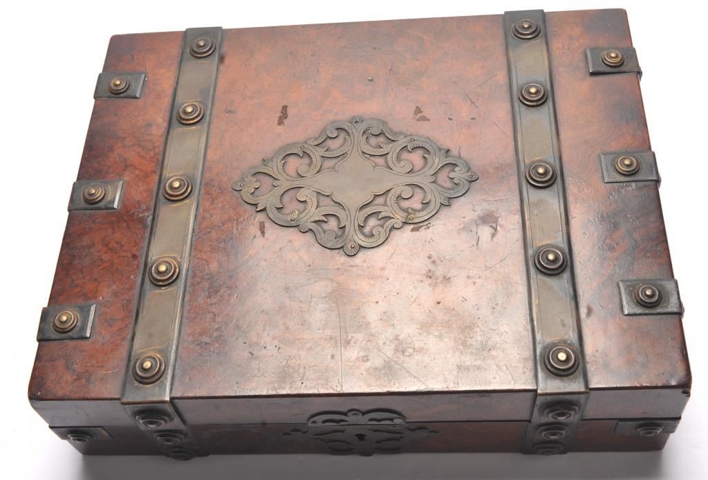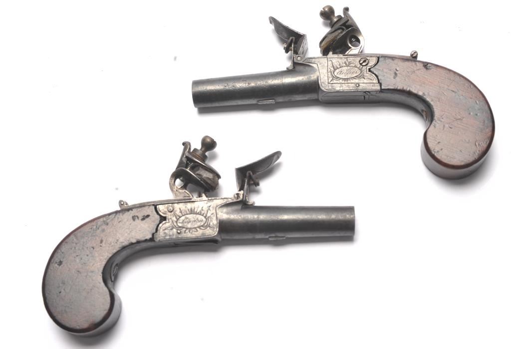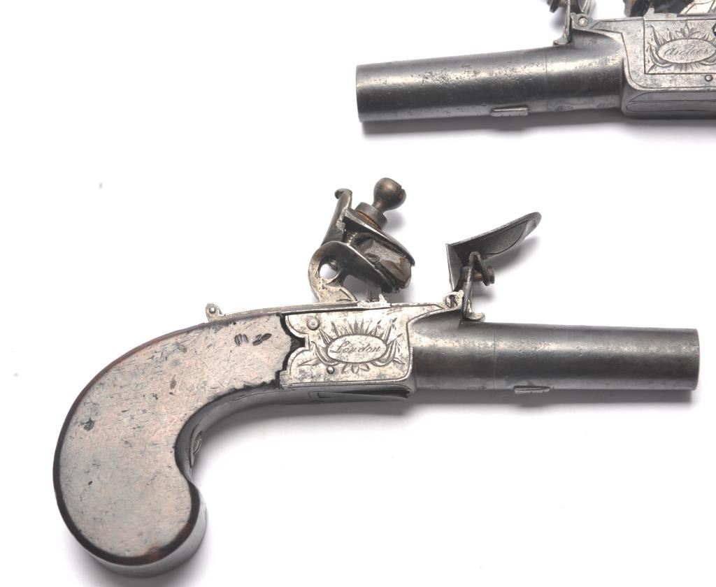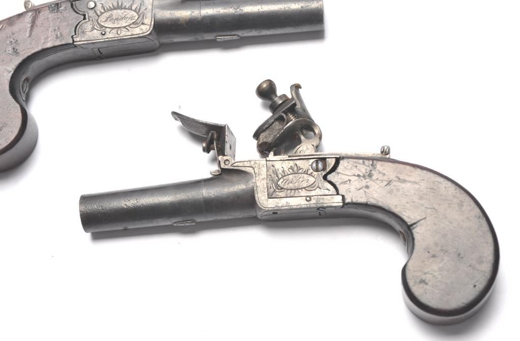 Pair of center hammer flintlock muff pistols signed “Archer, London” contained in deluxe brass bound and burl wood veneered casing lined in partition style with typical green felt. The upper portion of the case lifts out so the bottom can be used for letters, documents, currency or writing utensils and etc. the pair are in good to very good condition with normal aging, minor wear and imperfections. A flask, mold and crude barrel key are included. The exterior of the casing is also good and shows good patina on the ornate brass straps and raised studs. Made circa about 1800-1820. (Antique) Est.: $900-$1800