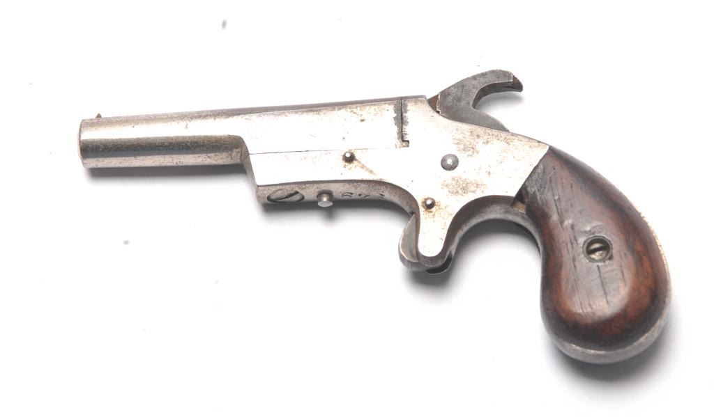 “Union” marked .22 caliber eclipse style cartridge derringer in good to very good condition. Minor rust and erosion. The bore is dark. Cocks and locks tight. (Antique) Est.: $175-$350