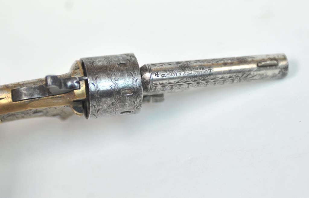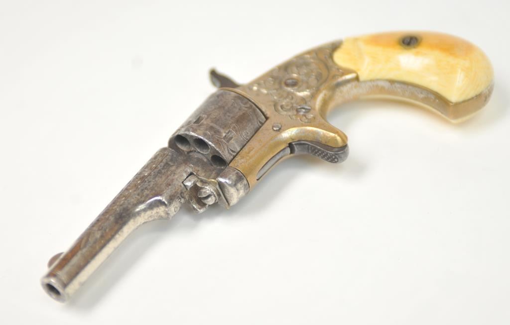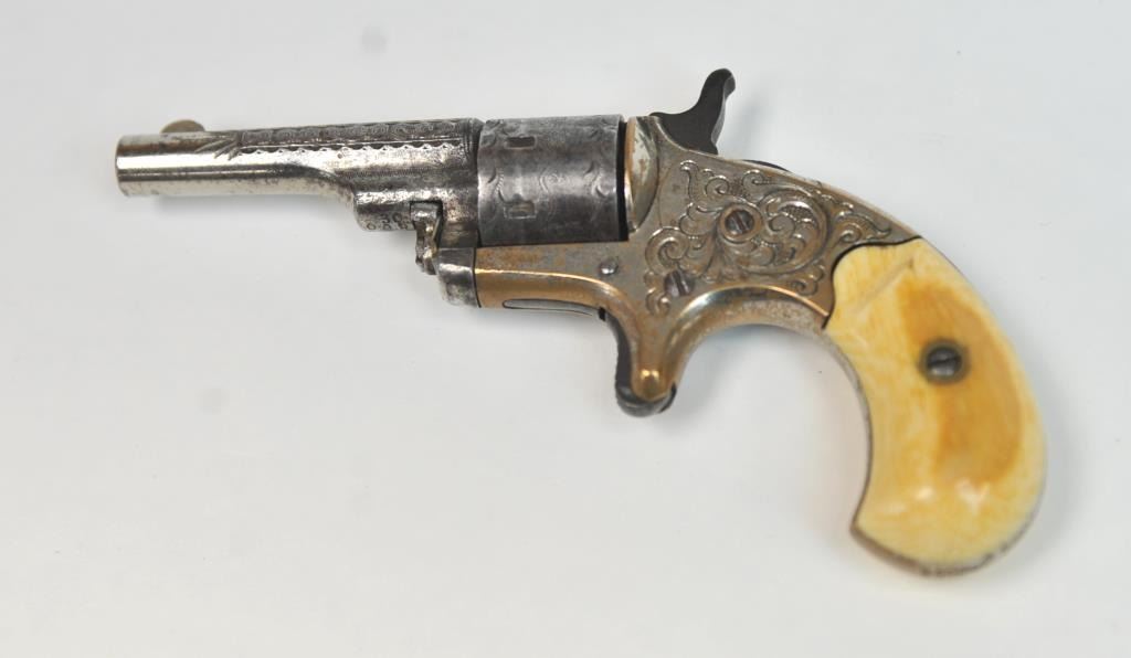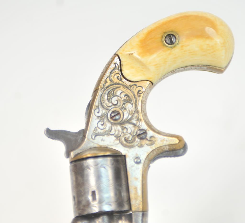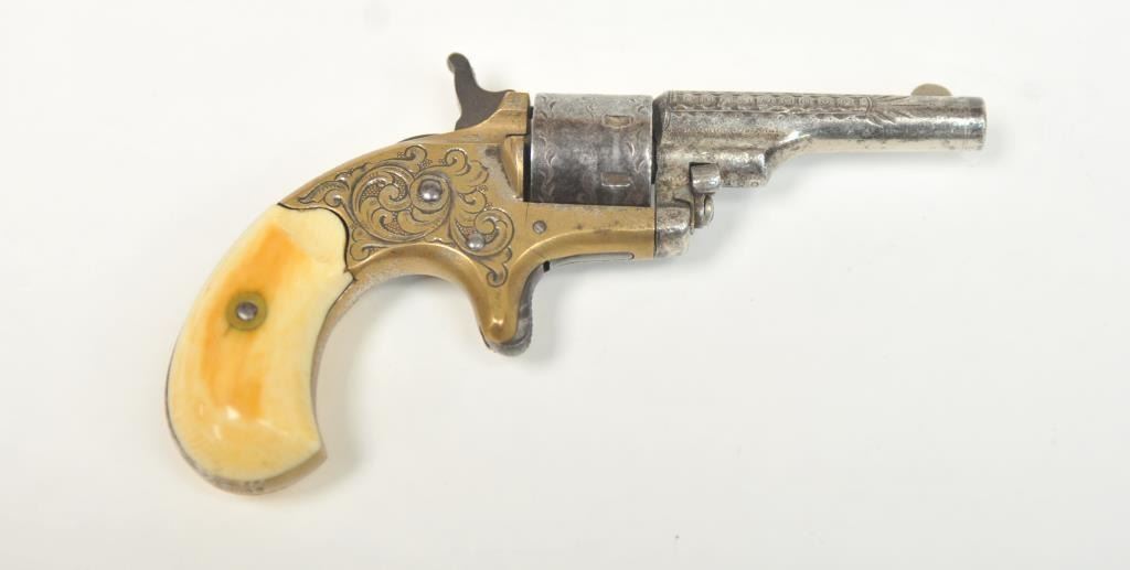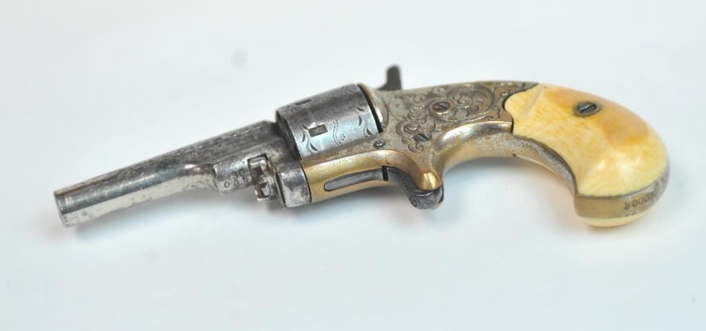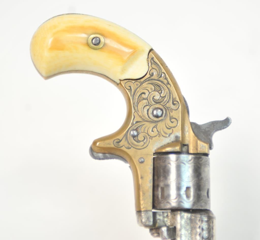 Colt 1872 Open Top 7 shot .22 caliber revolver, New York scroll engraved in Nimschke style with ivory grips, S/N 30005. This revolver remains in good to very good condition with approximately 50% original nickel on the barrel and silver on the frame. Minor normal metal aging. Very good plus and original grips to this Colt. Works well and matching. (Antique) Est.: $500-$1000