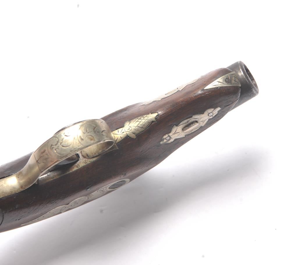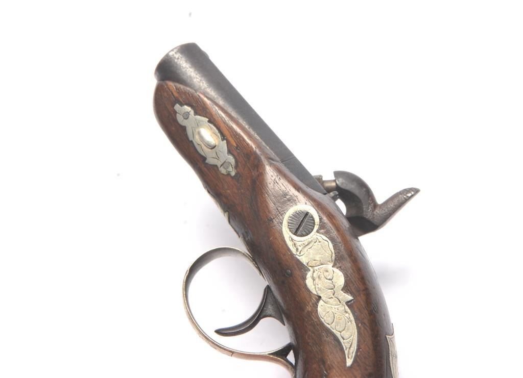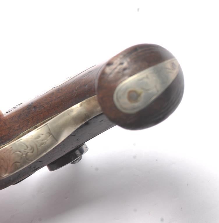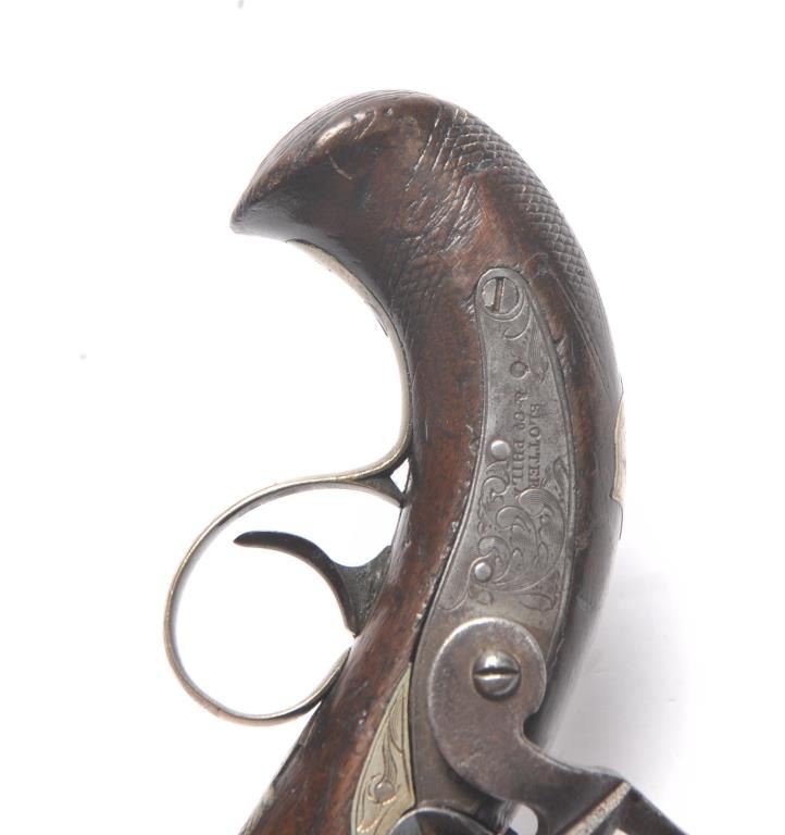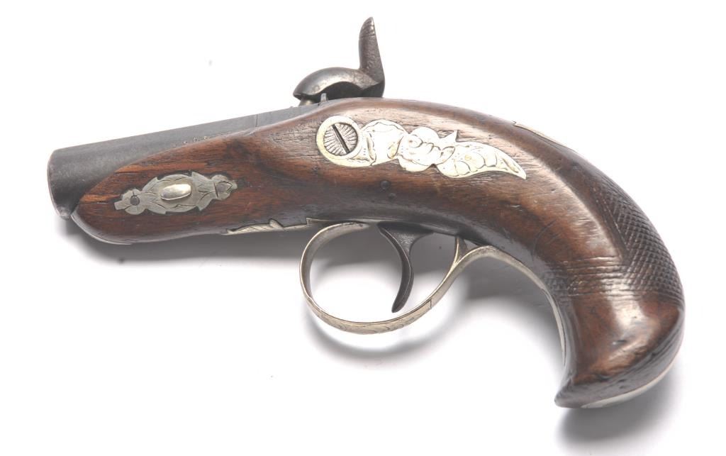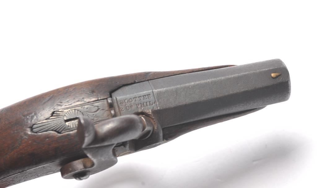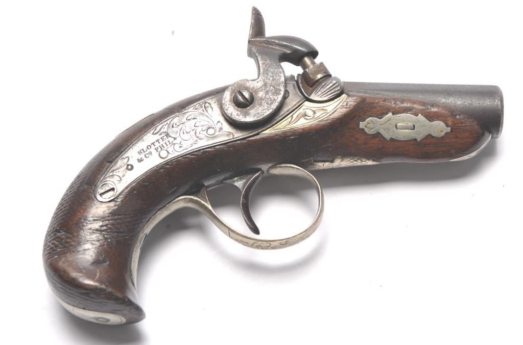 Philadelphia Derringer marked “Slotter PhilA” on breech and lock. Measures 5 ½” overall with 1 ¾” barrel in approximately .41 caliber rifled. No ramrod and German silver mounted. The hammer and nipple are excellent periodreplacements. Dark patina and stock is near fine from being carried. Slotter worked for derringer and his testimony is recorded in the derringer book by Parsons. This one has “Character” and may have gone West to thegold rush. (Antique) Est:$400-800