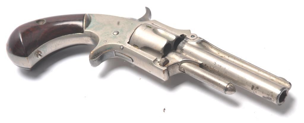 Marlin XXX Standard .30 caliber rimfire tip up revolver resembling S&W New Model 1 ½, S/N 4599. 80%-90% uncleaned and frosty original nickel with darkening and loss where finish has lifted. Good markings and tight actionwith case colors on the hammer. Varnished rosewood grips are very good plus to near fine. (Antique) Est.: $200-$400