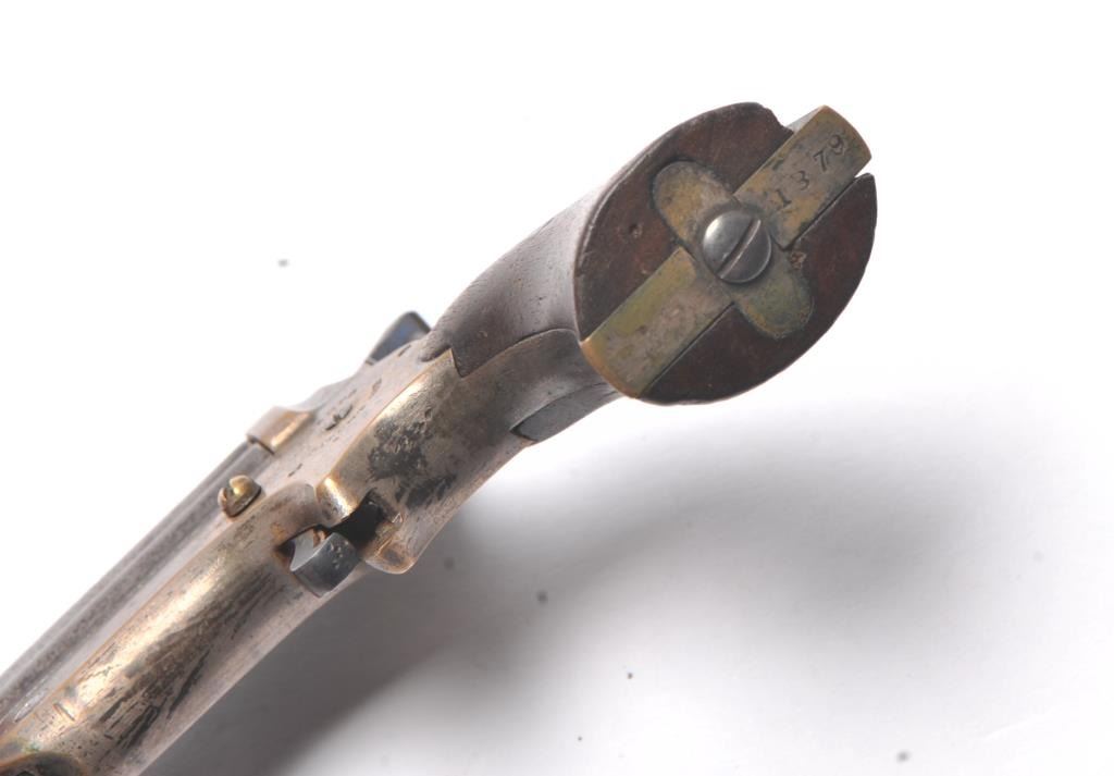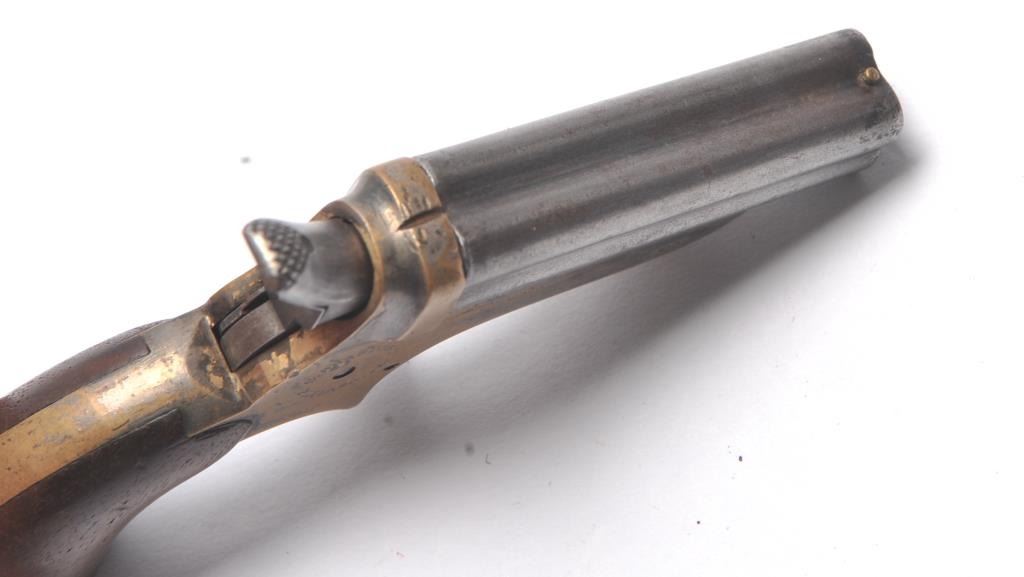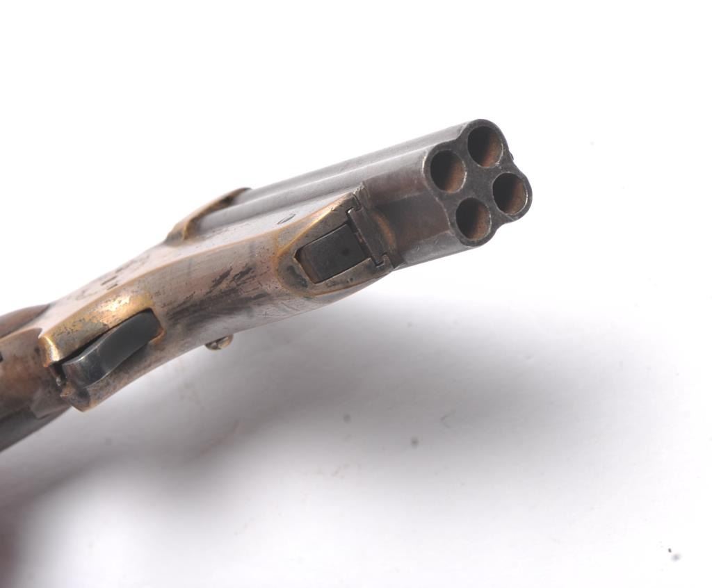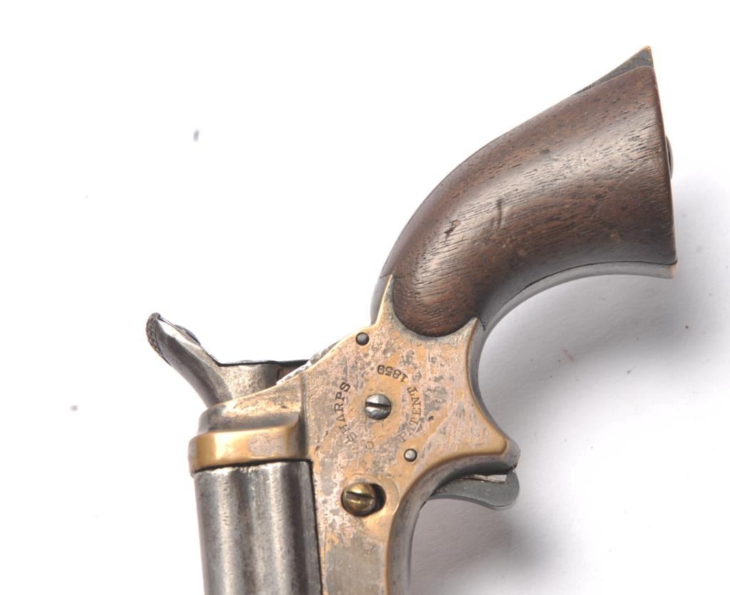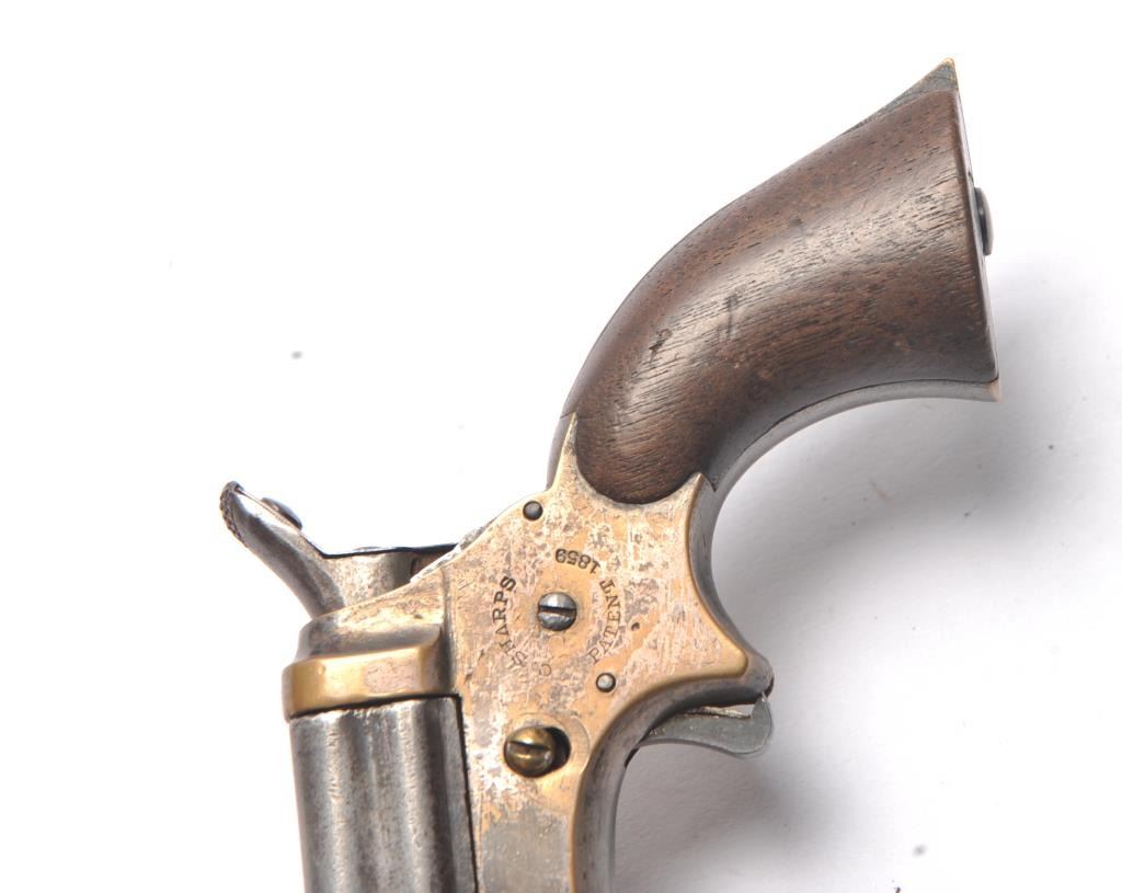 Sharps .22 Pepperbox Derringer in .22 caliber, S/N 1879. Early production with side release (Button replaced) and wood grips. Traces of original blue and silver. Good marking and good grips showing small lossesor chips at the heel. The action works and hammer firing pin revolves. The bores are rusty with some minor pitting overall. The barrels tight on spring and do not fall of when opened. (Antique) Est.: $250-$500