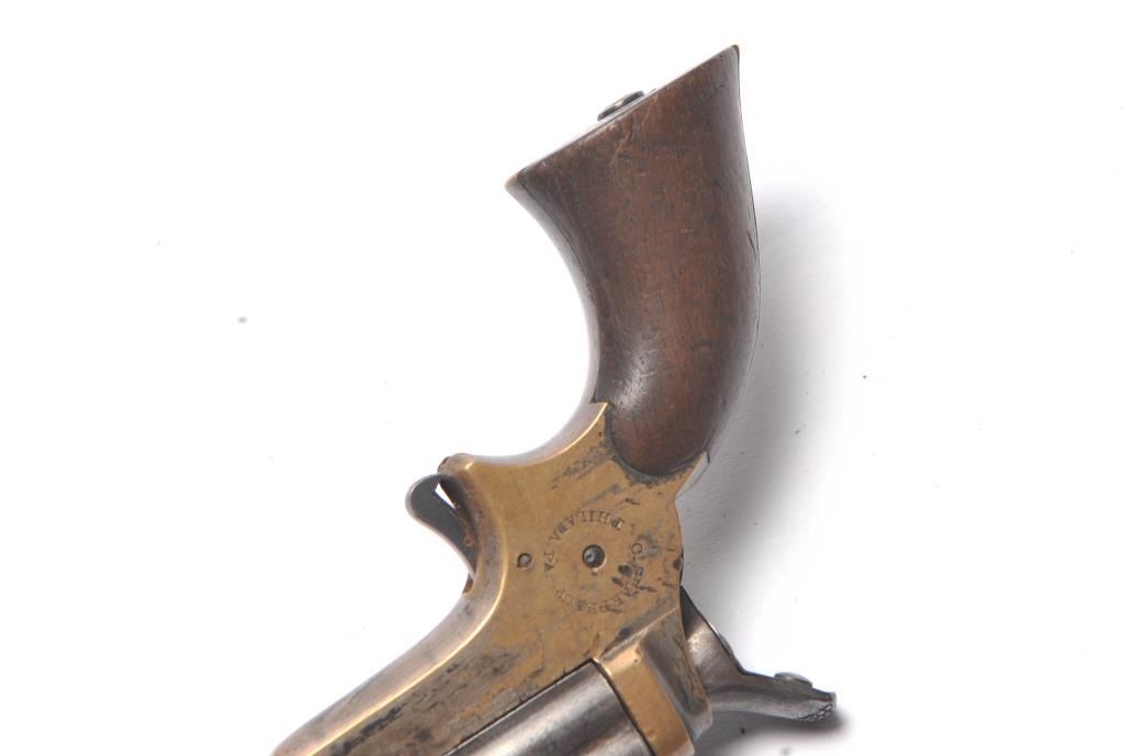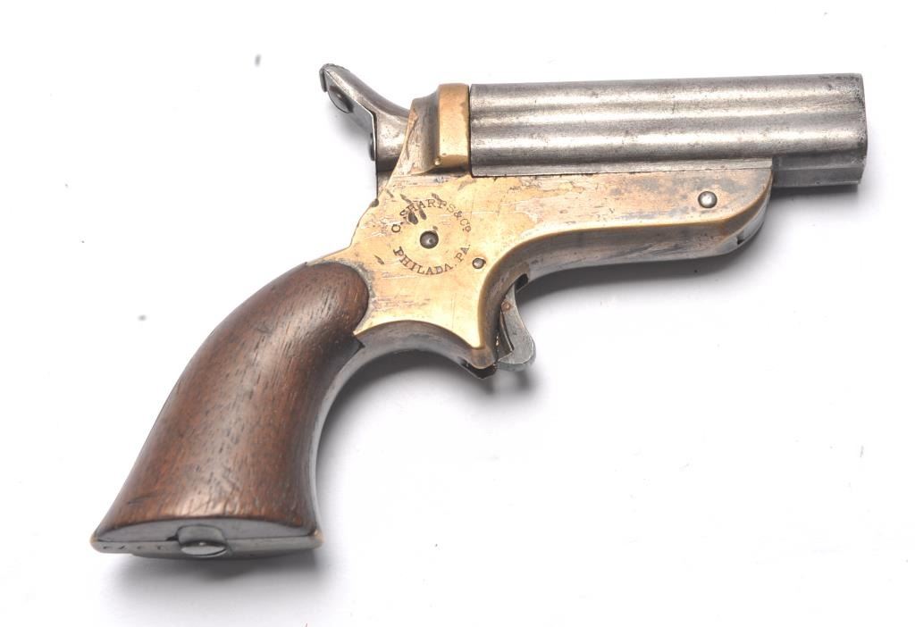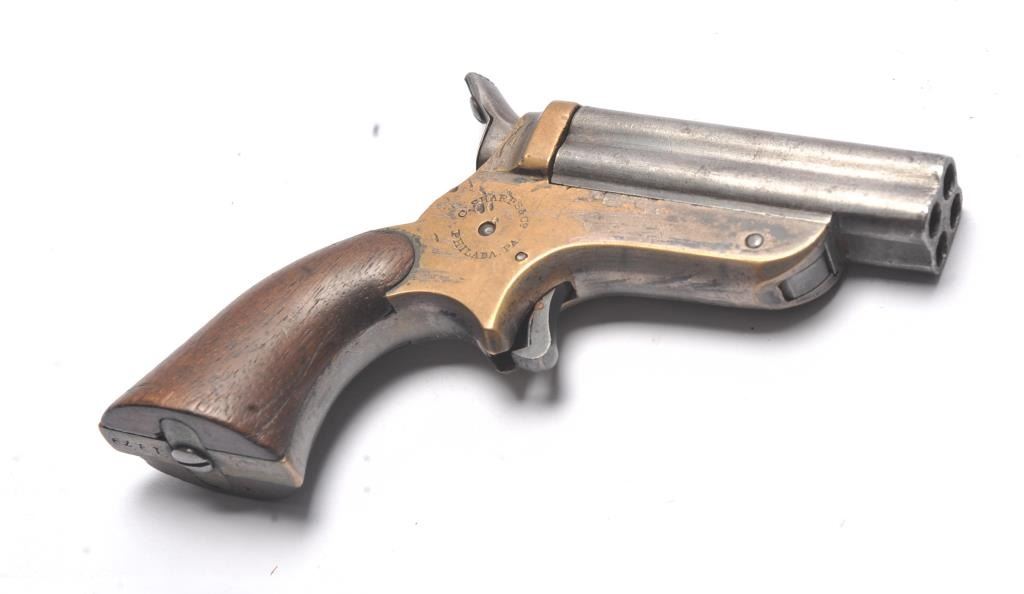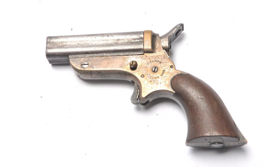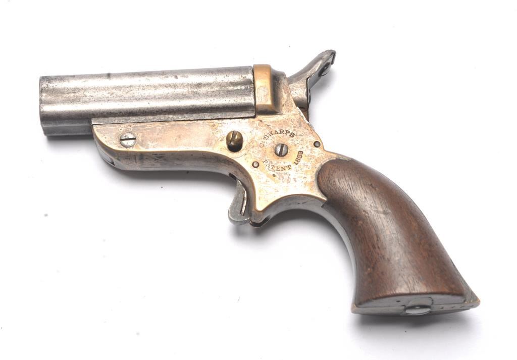 Sharps .22 Pepperbox Derringer in .22 caliber, S/N 1879. Early production with side release (Button replaced) and wood grips. Traces of original blue and silver. Good marking and good grips showing small lossesor chips at the heel. The action works and hammer firing pin revolves. The bores are rusty with some minor pitting overall. The barrels tight on spring and do not fall of when opened. (Antique) Est.: $250-$500