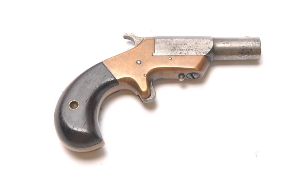 Marlin “Victor” .38 Rimfire Derringer in good to very good condition, S/N 298. Good uncleaned brass patina with good to very good grips. Traces of finish on the barrel and good lock up and tight. Good action. Minorerosion and pitting on the barrel. A fairly scarce western frontier era cartridge derringer. (Antique) Est.: $250-$500