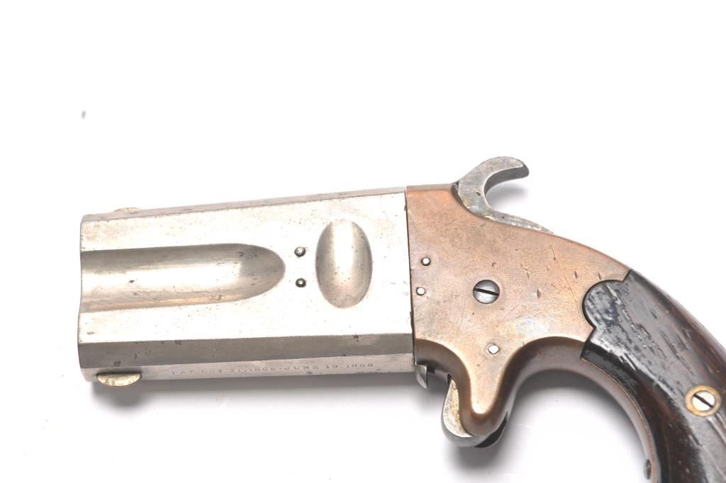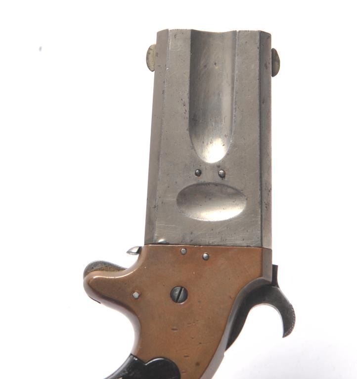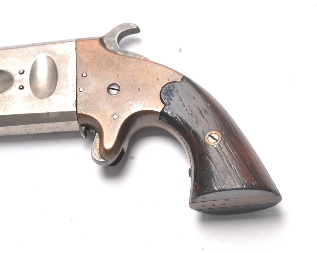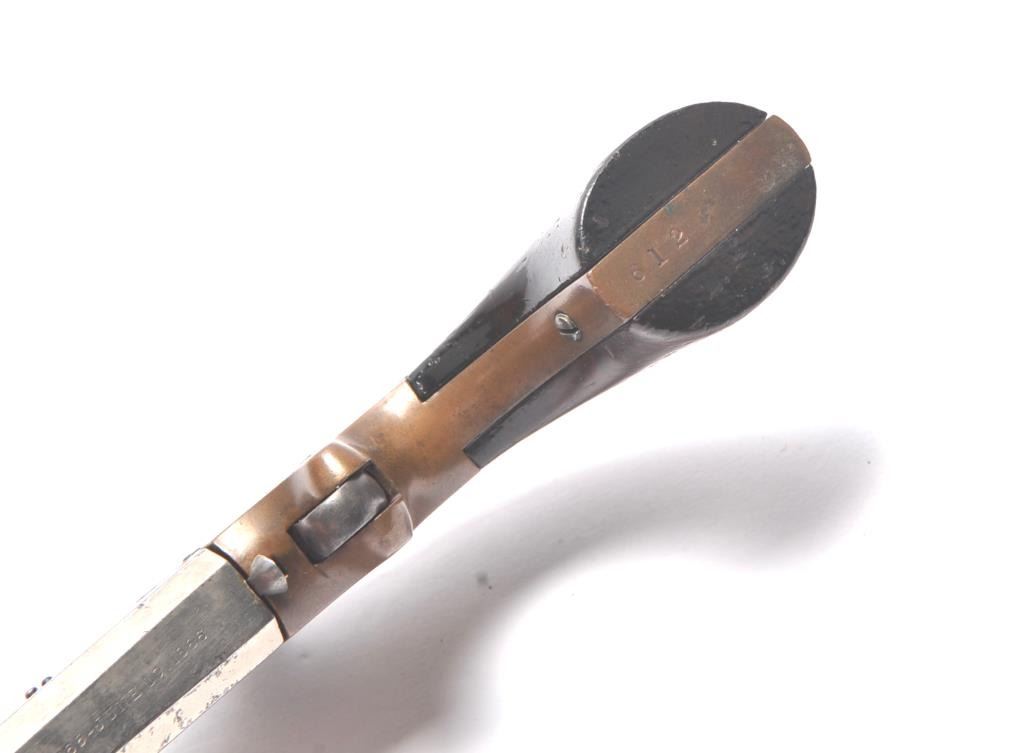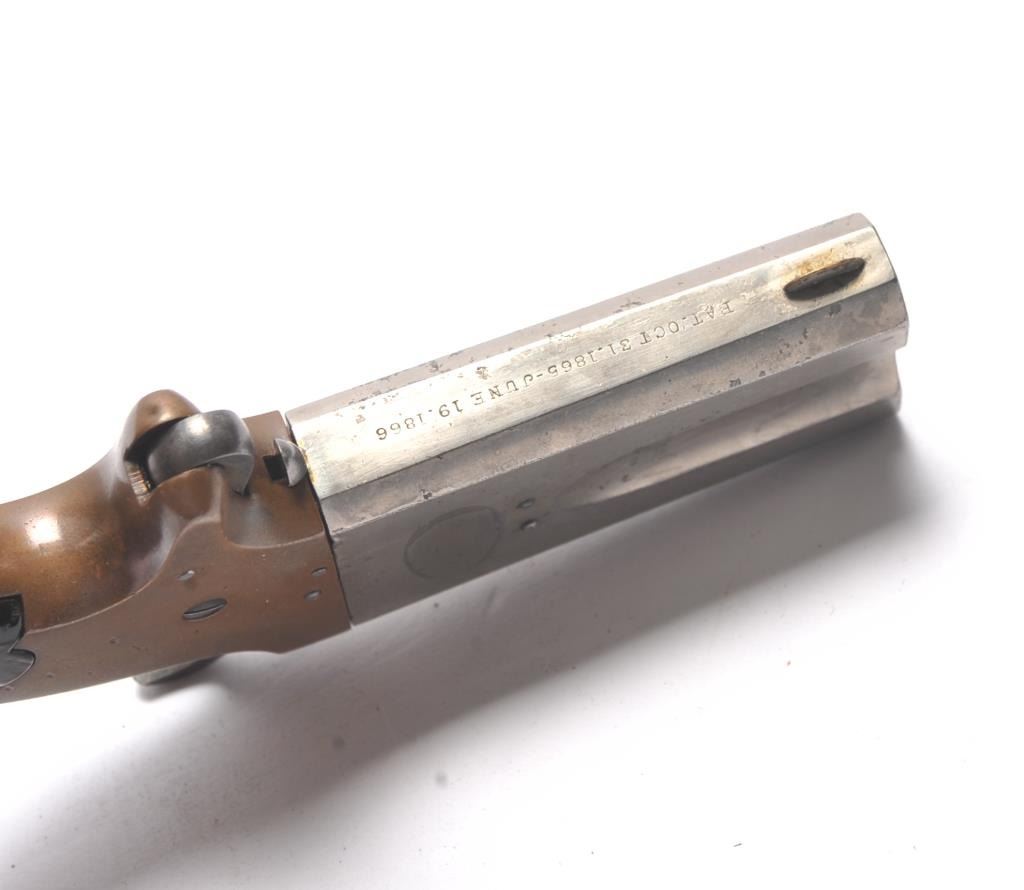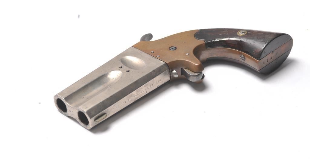 American Arms Co. Wheeler’s Patent two shot O/U derringer in .38 rimfire with 2 ½” silver plated barrel group, S/N 612. The frame shows a mellow and uncleaned dark patina. The grips are weathered and show lightrefinishing. The barrels show 80%-90% uncleaned “Milky” color with some minor pitting. The action works well and markings are good. (Antique) Est.: $400-$800