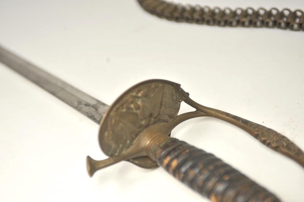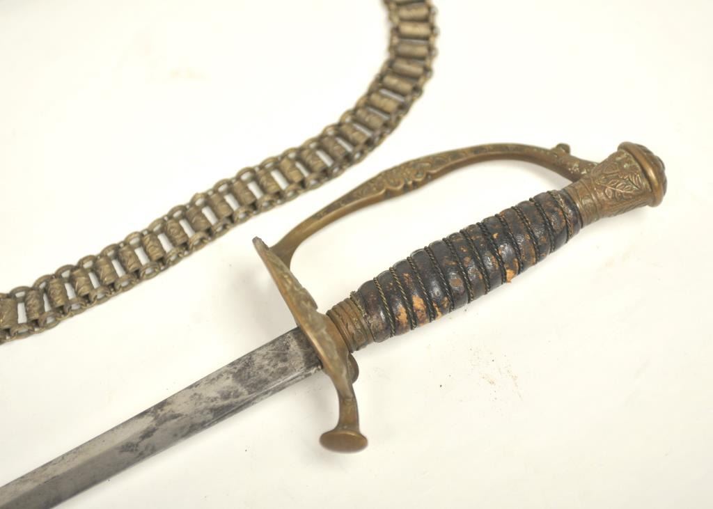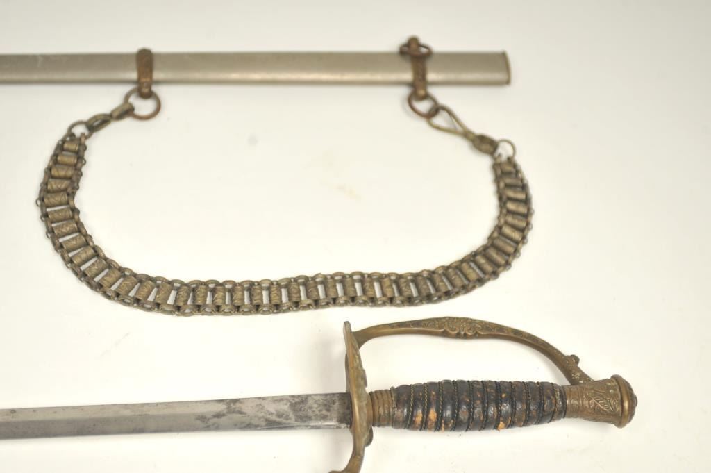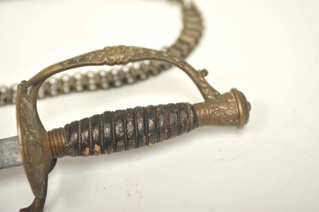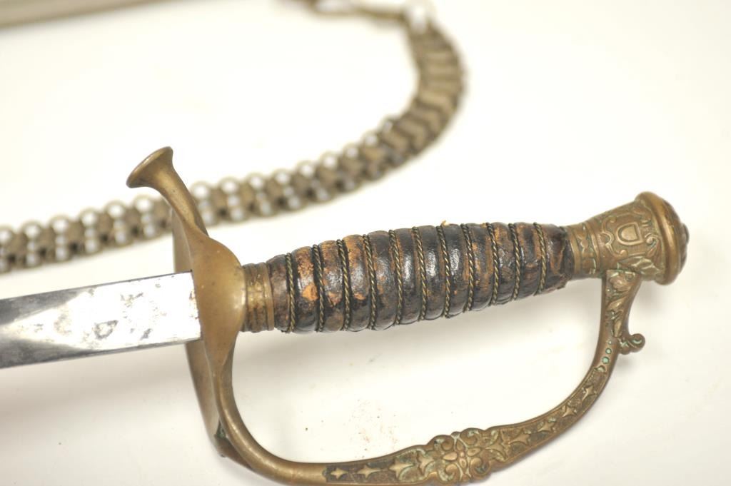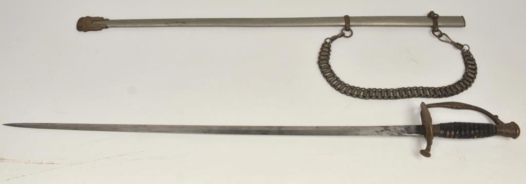 U.S. Model 1860 Staff and Field Officer’s sword with scabbard. The blade is marked “Schnitzler Solingen” with “A.A.” trademark. Good uncleaned condition with normal imperfections and natural aging with nocleaning. Hanger attached and included. Good eagle on the hilt. Est.: $150-$300