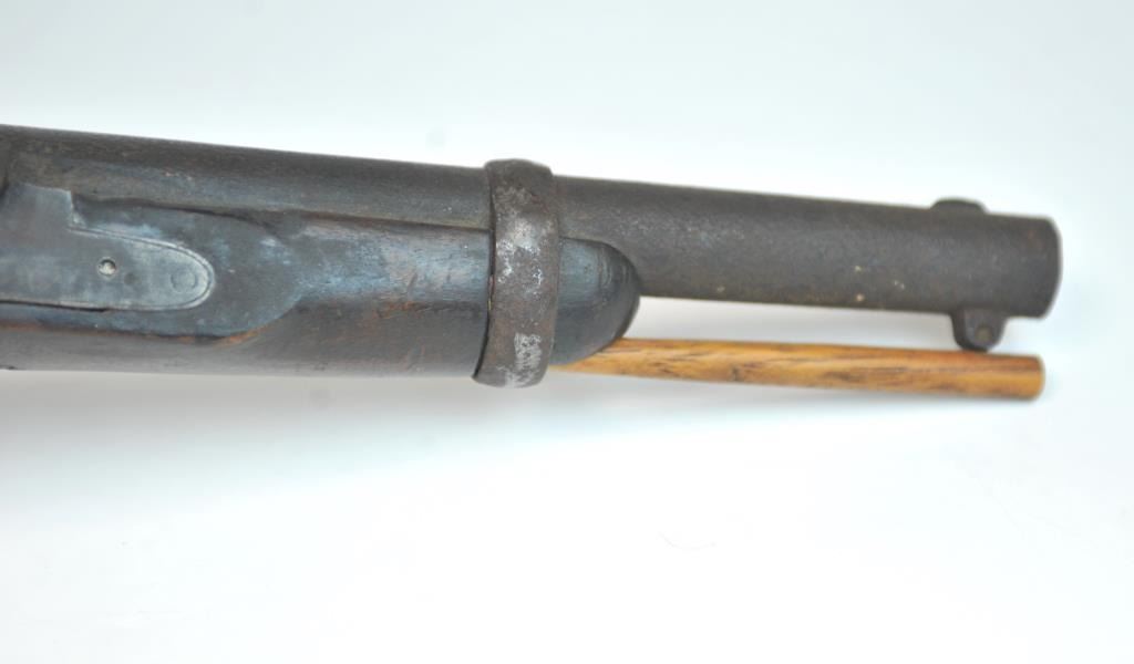 Conversion of 1836 Model Flintlock Pistol with replaced lock marked “R.S. Clark”. All specification as found on 1836 model with “P” and “U.S.” marked barrel. We speculate the lock, hammer and bolster were replaced at time of conversion. As found “Out of the Attic” condition with heavy coating of rust, black/brown patina, and good wood with some imperfections. Lock works well. Old carved wood rod. No reference on “R.S. Clark” who may well have been southern or a small rural maker. Some heavy pitting. (Antique) Est.: $400-$800