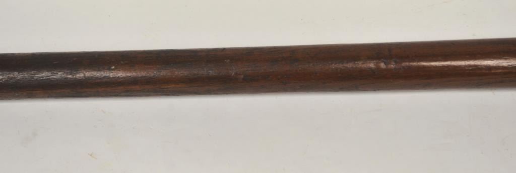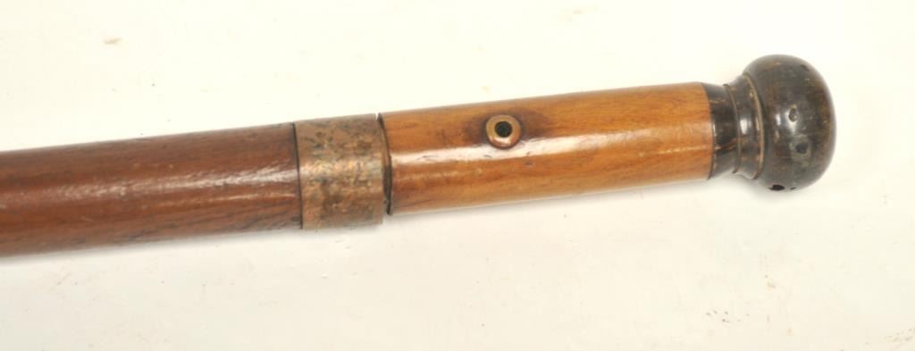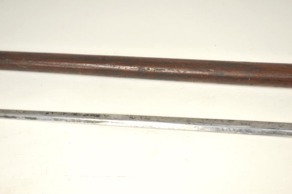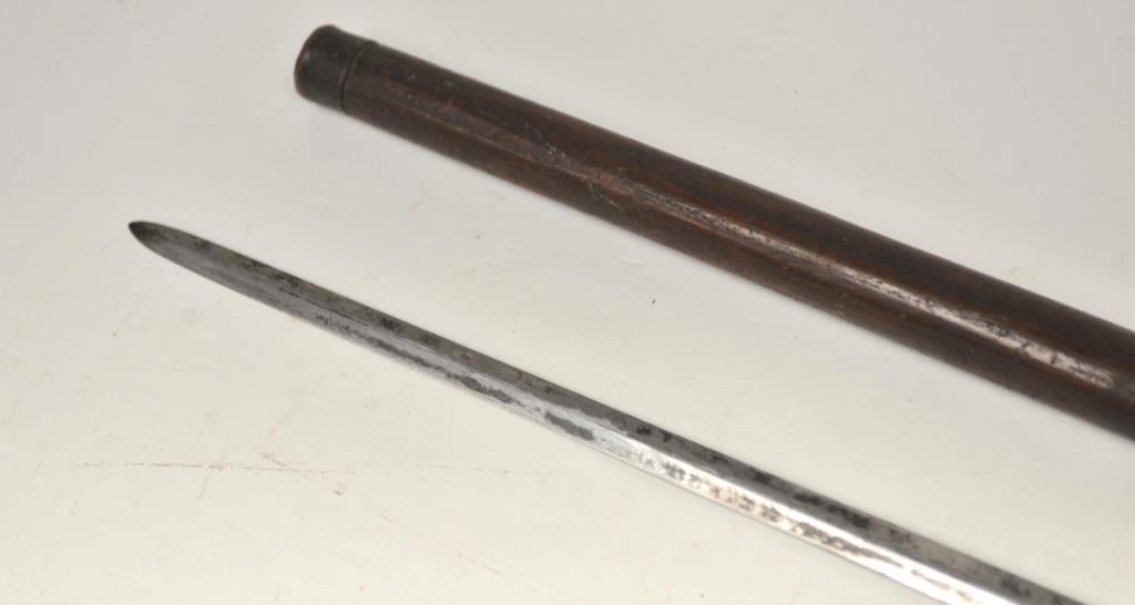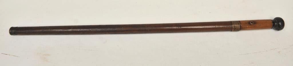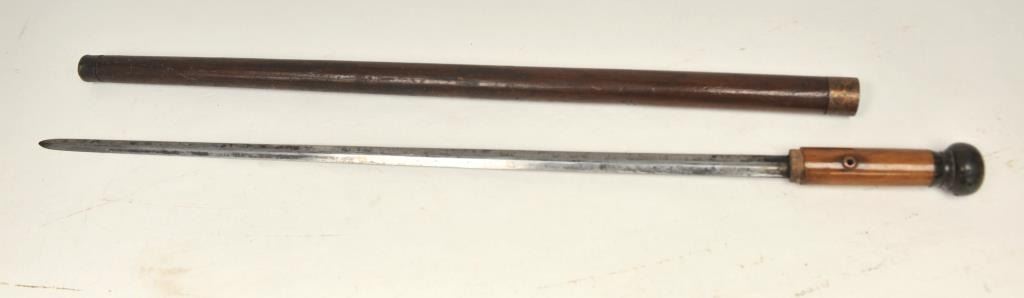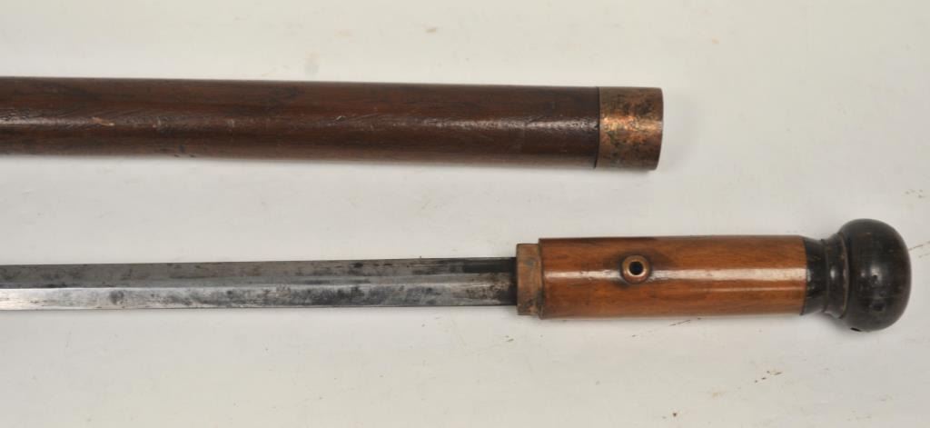 19TH century cane with concealed sword blade. Simple turned wood American style construction possibly made aboard a ship. Measures 34” overall with a 28” blade. The blade is tempered steel. A genuine antique in good condition we would date 1840-60s by style and unfortunately illegal to carry as a concealed weapon in California. Est.: $400-$800
