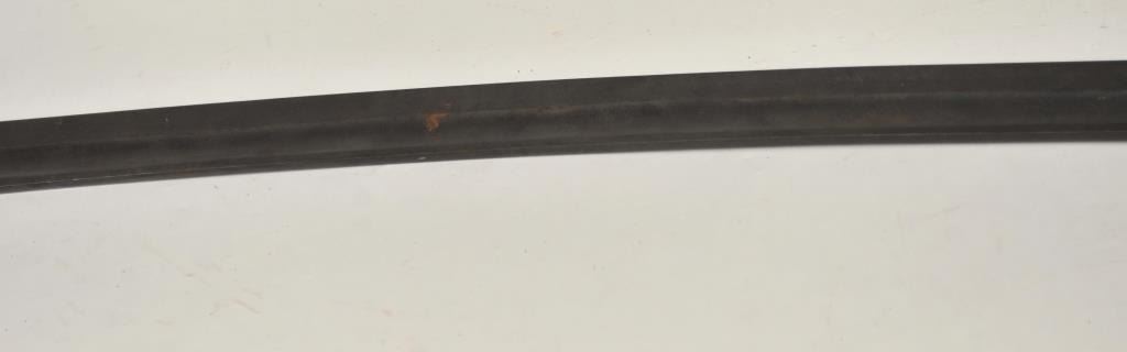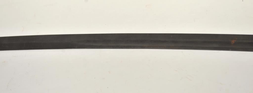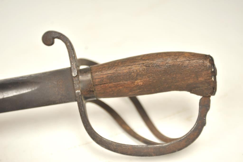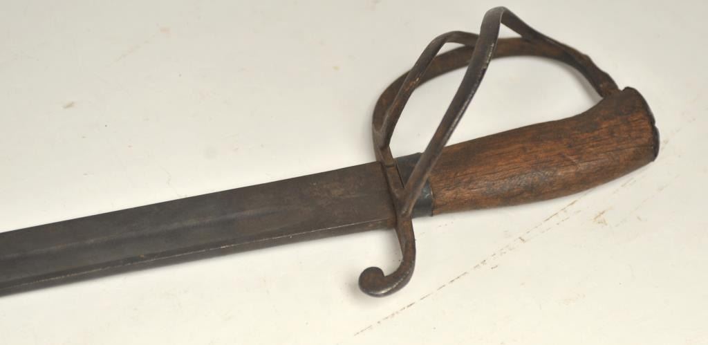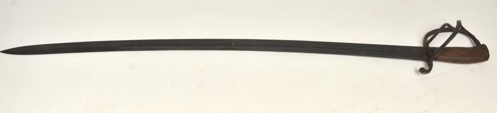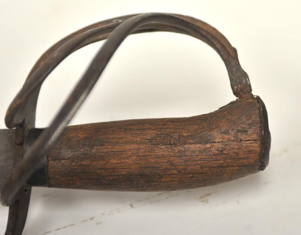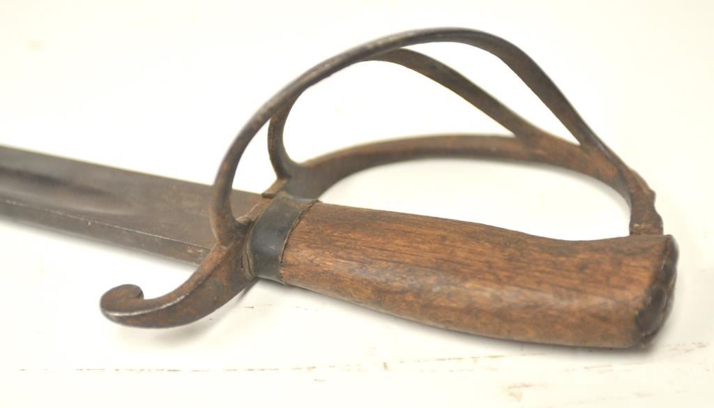 Interesting and somewhat crude sword with 3 branch D guard, S shaped quillon and crude wood grip secured by sheet brass band at the hilt and forged square nail in wood pommel. The blade measures 34” and 39” overall. Theblade is stamped “P.D.L. probably Solingen. Dark patina overall and a probable southern hilt. Est.: $300-$600
