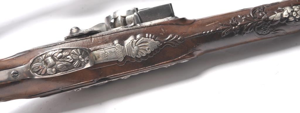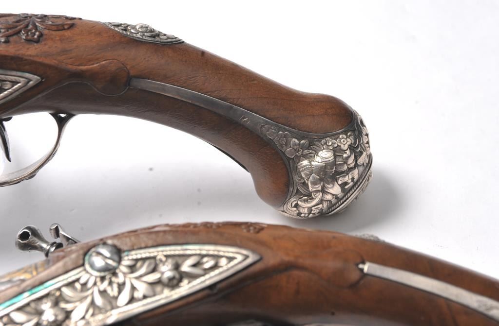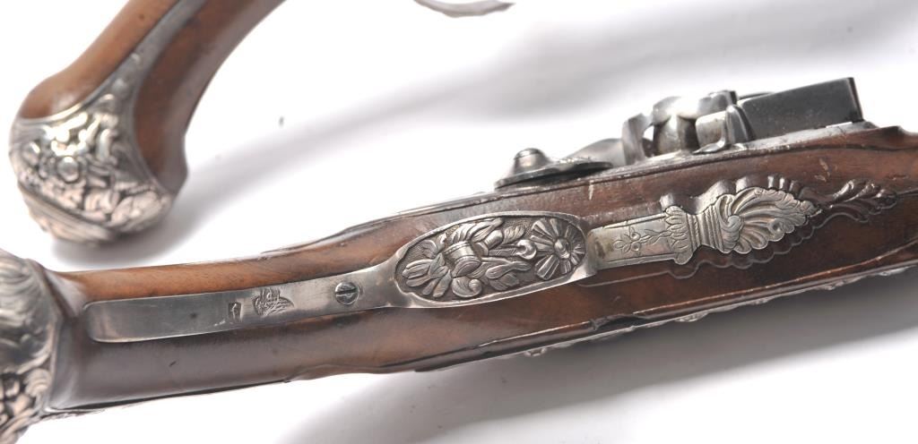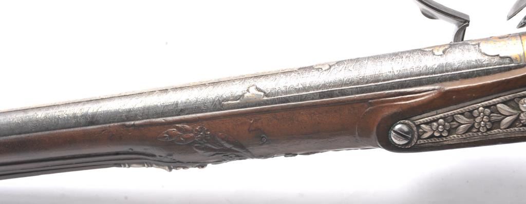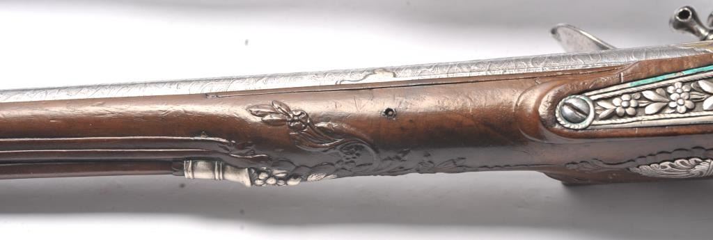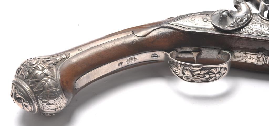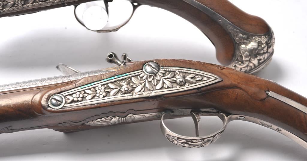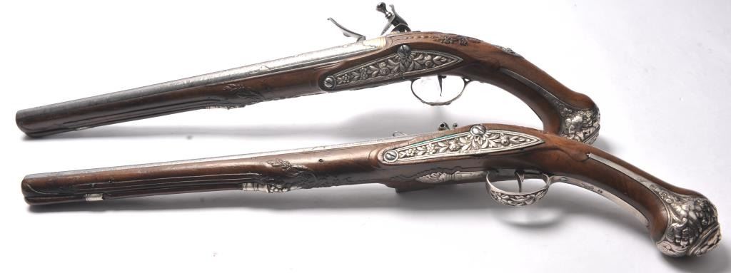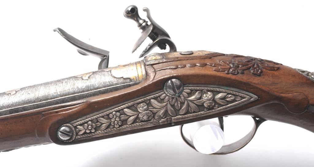 Pair of elaborate and high-quality flintlock horseman’s size pistols signed “Wilson” on the locks with superb damascened and gold inlaid Turkish barrels. The pair are ornately silver mounted showing Turkish hallmarks and very good definition to the ornate designs in the casting. Nearly 21” overall with 13 ¾” barrels of approximately .60 caliber smoothbore. The stocks are nicely raised carved in floral scenes at the wrist and fore ends with quality molding around the lock and mounts. Original flintlock parts and work well. A superior set of pistols made for a sultan or person of wealth and position as these are of a very high grade reserved forthe top echelon. (Antique) Est.: $4000-$8000