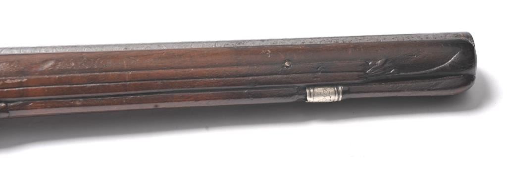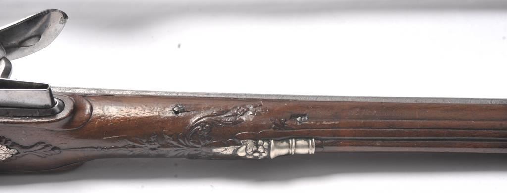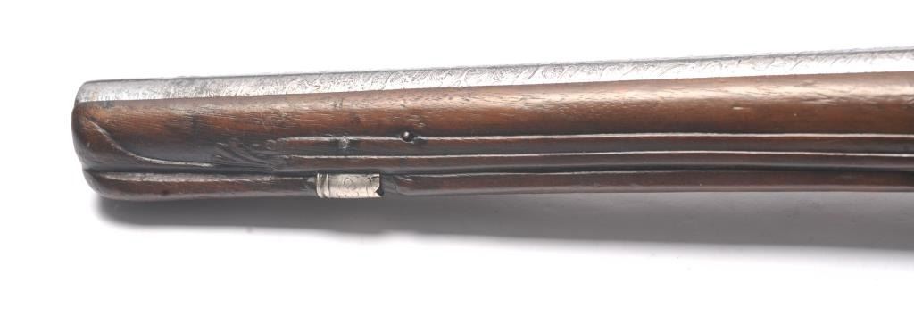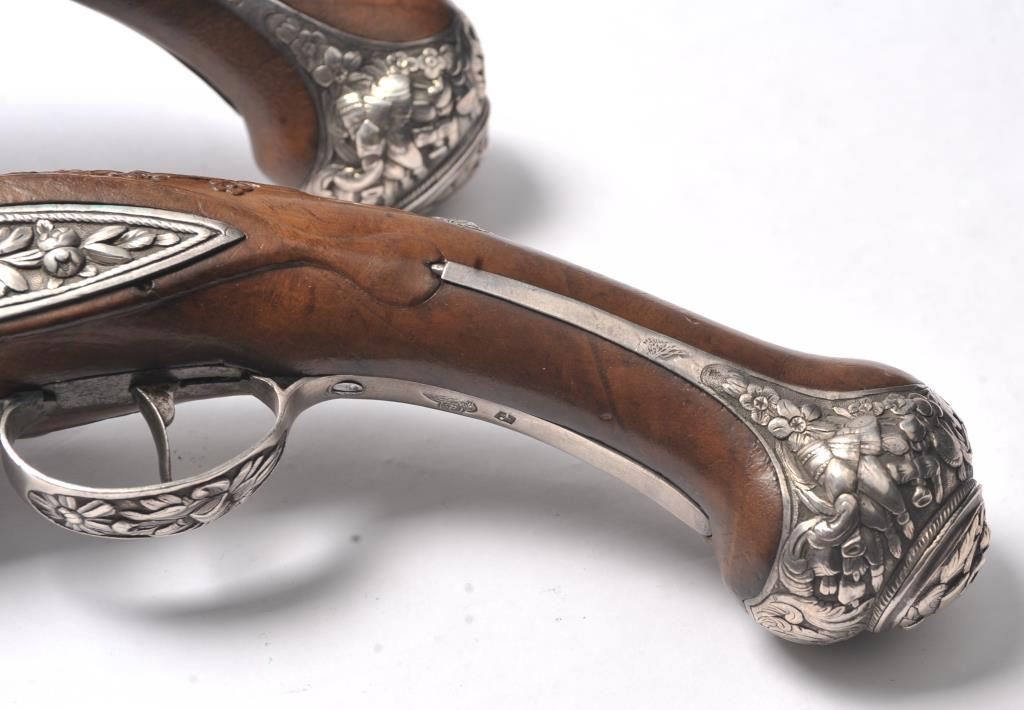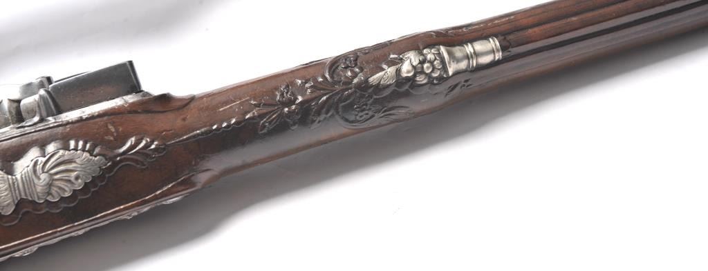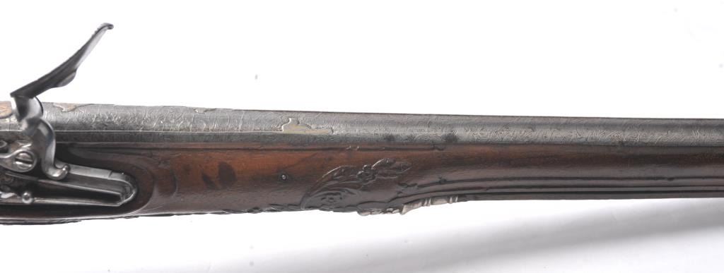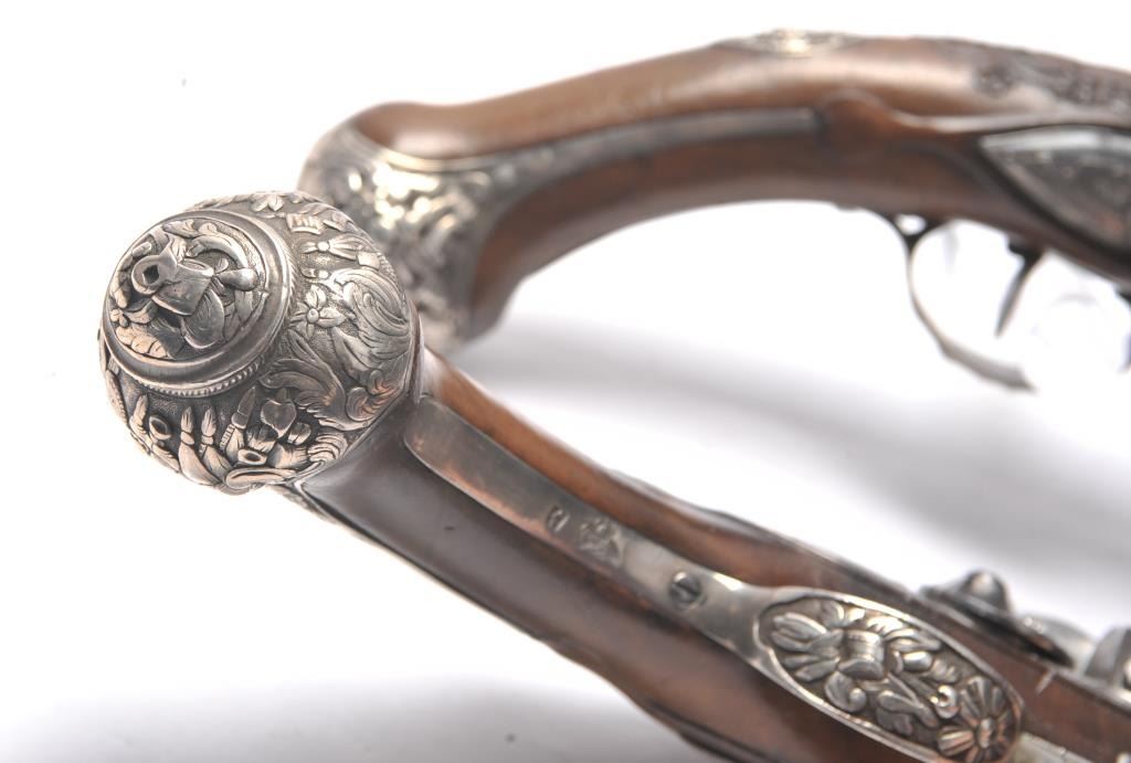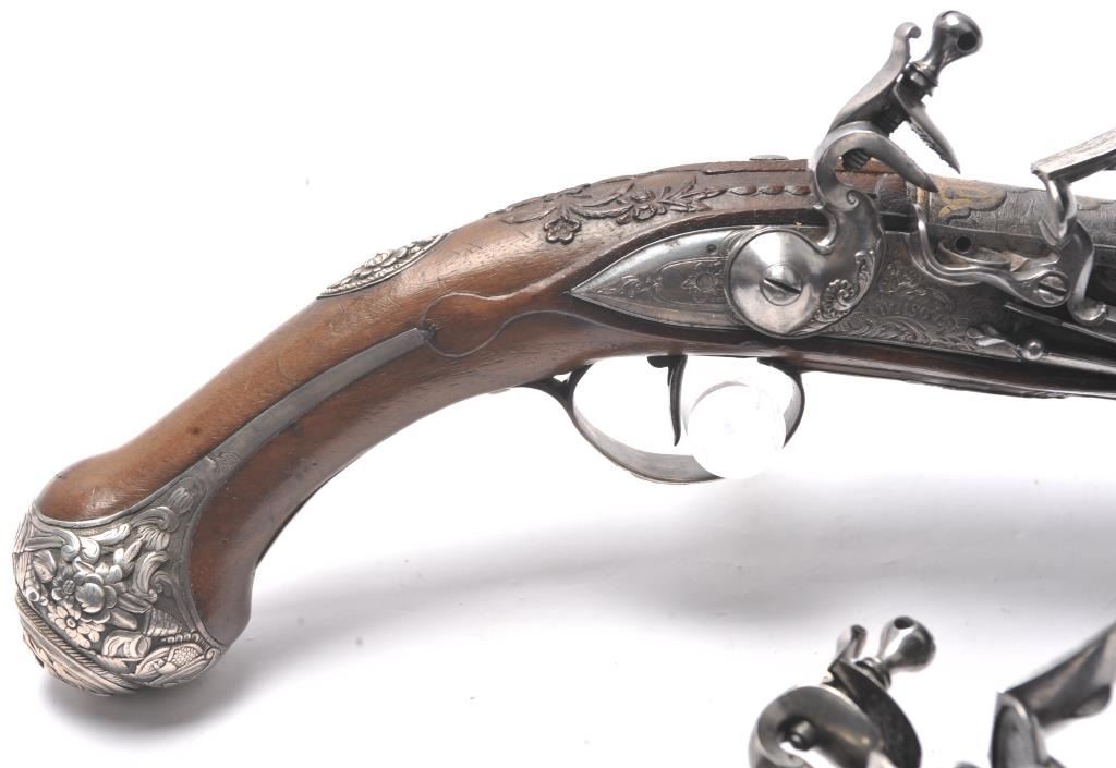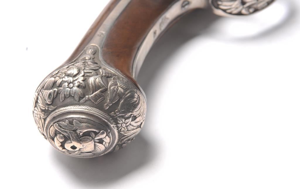Pair of elaborate and high-quality flintlock horseman’s size pistols signed “Wilson” on the locks with superb damascened and gold inlaid Turkish barrels. The pair are ornately silver mounted showing Turkish hallmarks and very good definition to the ornate designs in the casting. Nearly 21” overall with 13 ¾” barrels of approximately .60 caliber smoothbore. The stocks are nicely raised carved in floral scenes at the wrist and fore ends with quality molding around the lock and mounts. Original flintlock parts and work well. A superior set of pistols made for a sultan or person of wealth and position as these are of a very high grade reserved forthe top echelon. (Antique) Est.: $4000-$8000