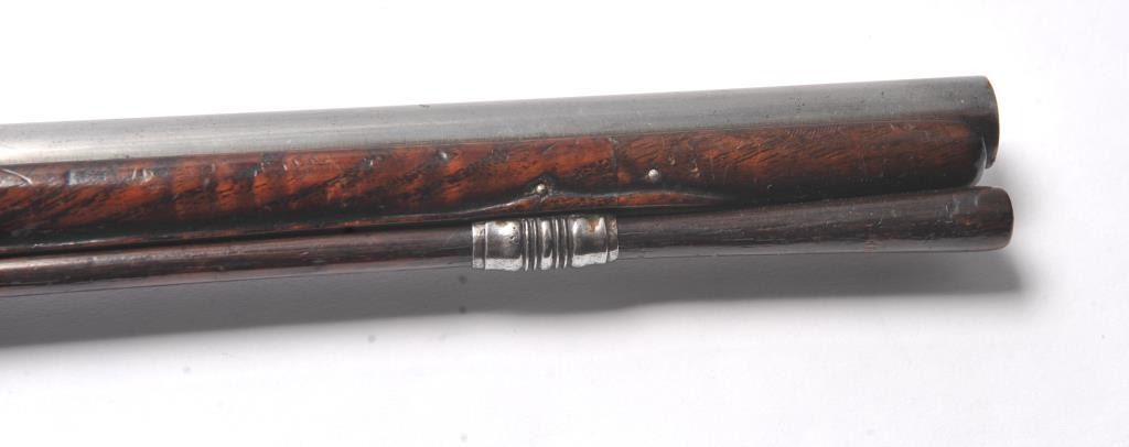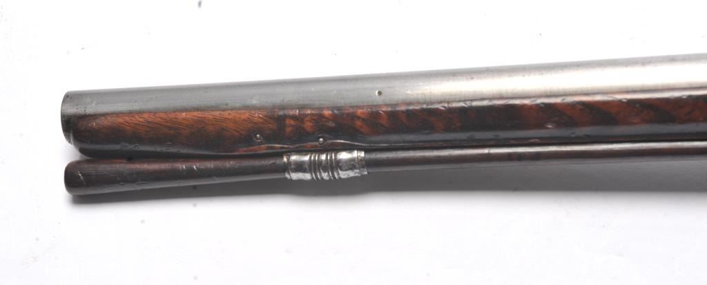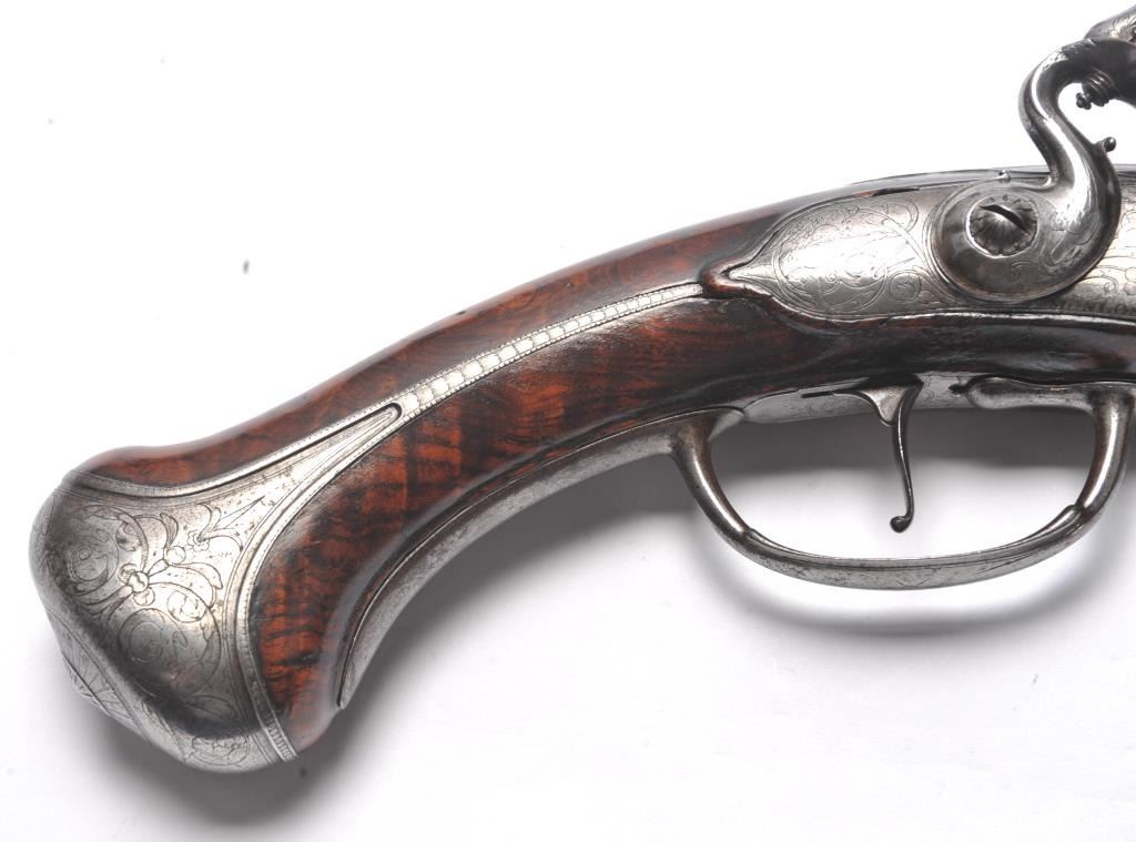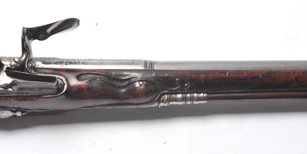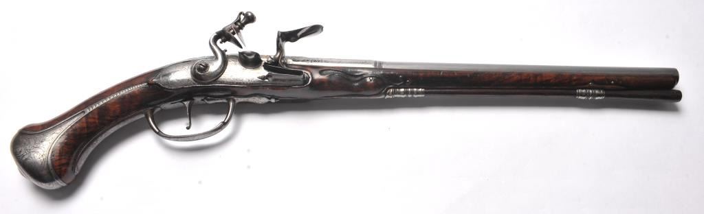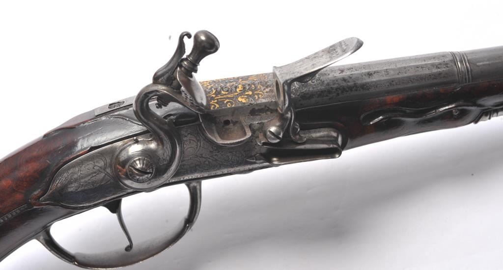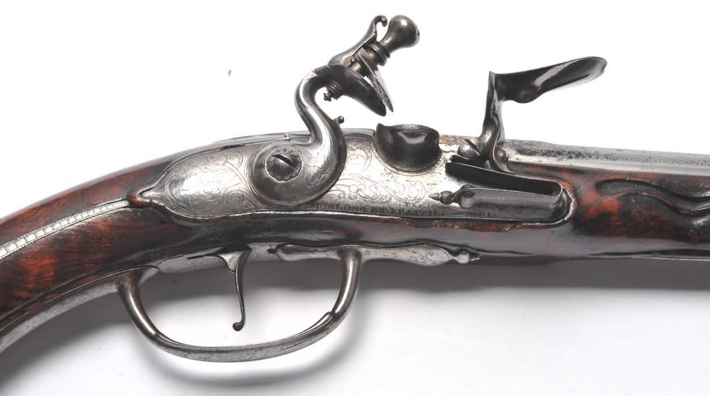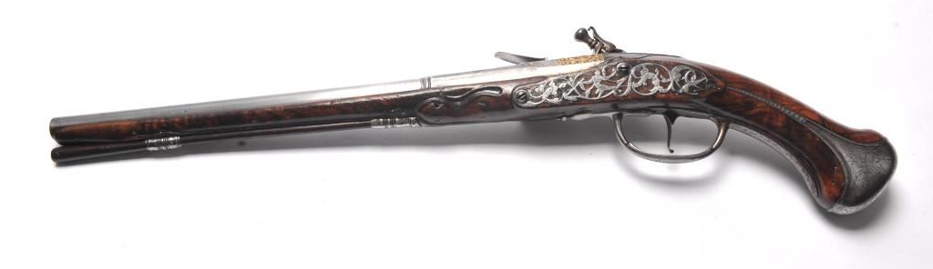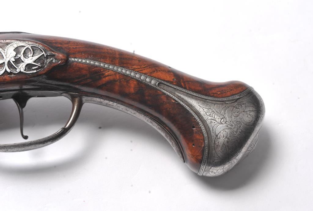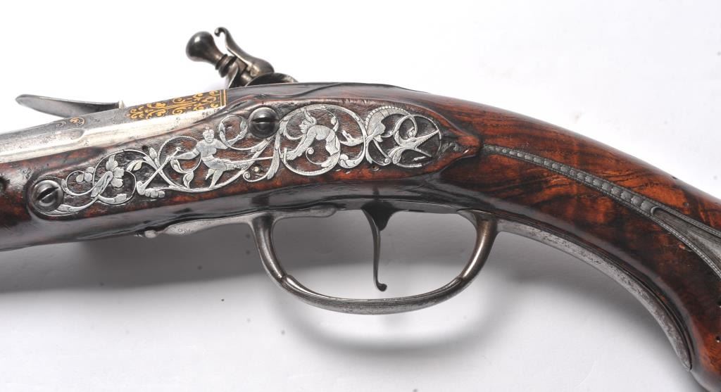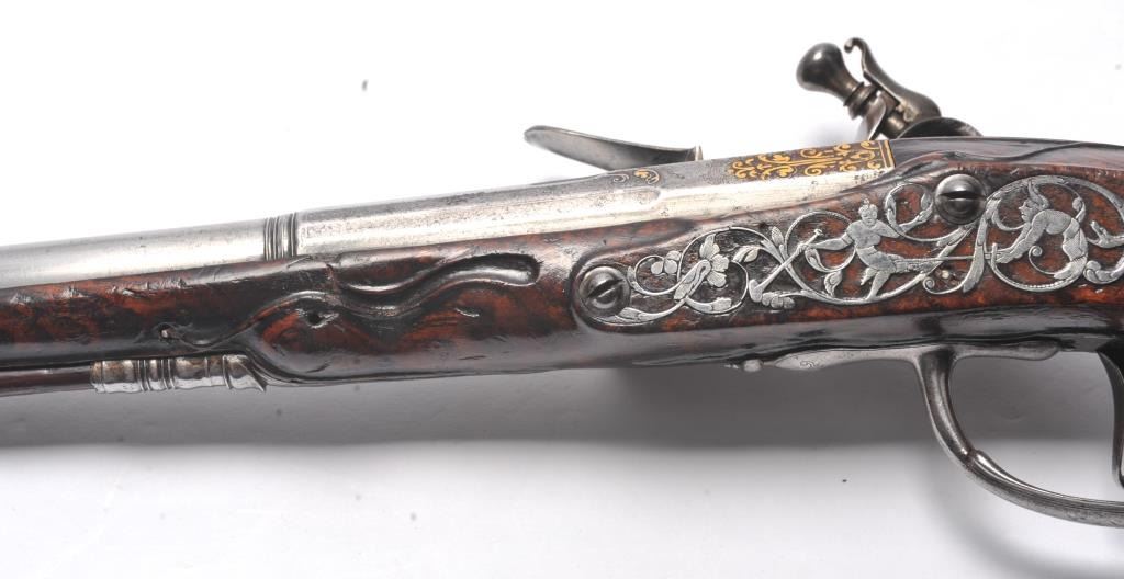 Early French Flintlock Holster Pistol by Monlongue Royal Gun Maker to Louie IV showing his signature at edge of the lock and Paris. Monlongue was a Hugonaught who immigrated to London in 1684 becoming a maker to KingWilliam III. This pistol shows fine quality and exceptional and refined form. Measures 20 ½” overall with a 14” barrel of approximately .52 caliber smoothbore. Excellent early pierced side plate withfigures of swordsman, man with mallet and mythical beasts. Lightly engraved mounts in 17th century patterns. The breach area shows 50%-70% good overlay in scroll motifs also portrait of maiden on tang. All originalflintlock [arts and very good condition with light cleaning but not “Rubbed Out” with good edges and proper surfaces to metal. Correct style ramrod. Burled wood stocks also very good. A flintlock pistols for a sophisticated collector. (Antique) Est.: $6,000-$12,000