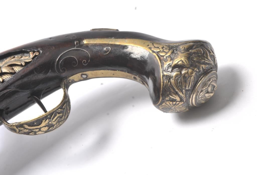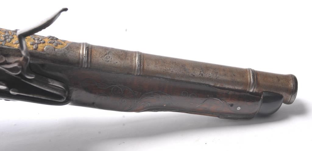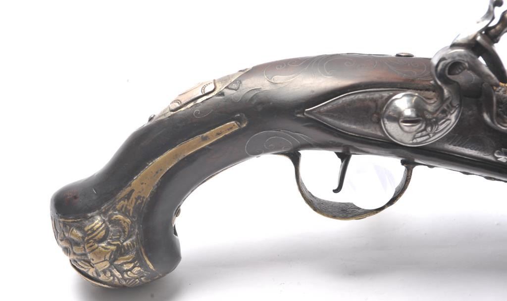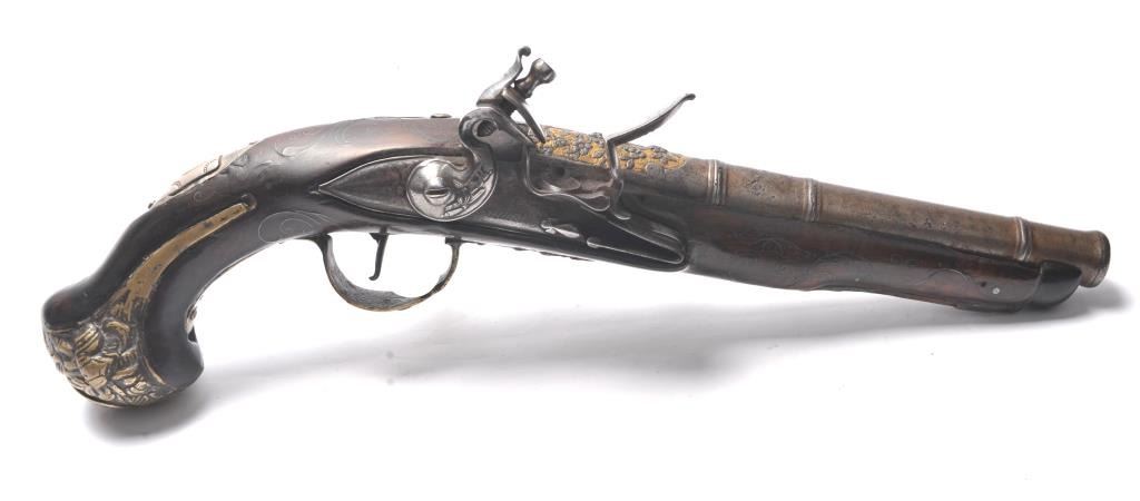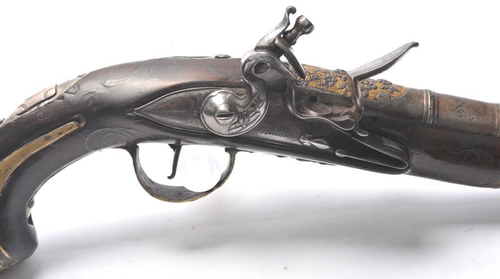 High Grade English Flintlock Pistol made for Eastern trade signed “Wilson” on the lock. Chiseled decoration on the breech end of the barrel with gold damascened background. Silver over cast brass mounts with piercedside plate and silver behind it to create “Shadow Box” effects. Pewter and silver inlaid on the wrist with “O” letter at the center from east. Silver wire inlaid stock and chiseled hammer. Made without ramrod. All original flintlock parts. The action cocks with good spring but does not hold. The condition is good to very good with minor aging and small imperfections. (Antique) Est.: $750-$1500