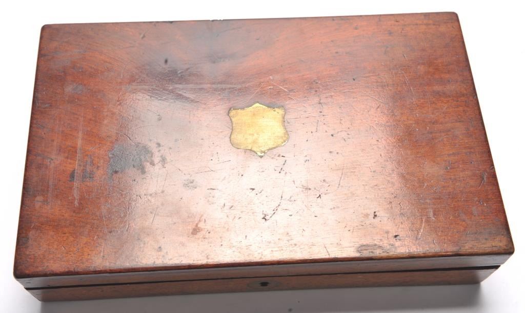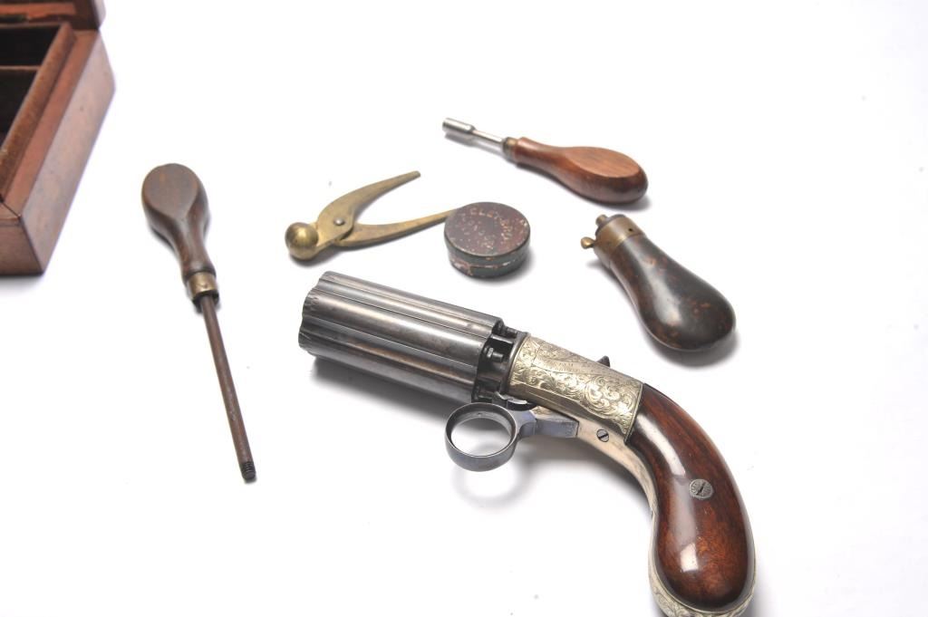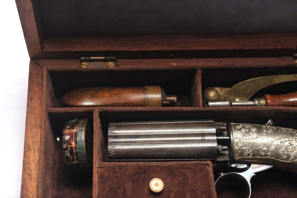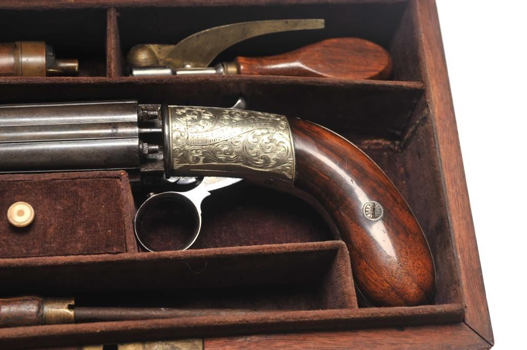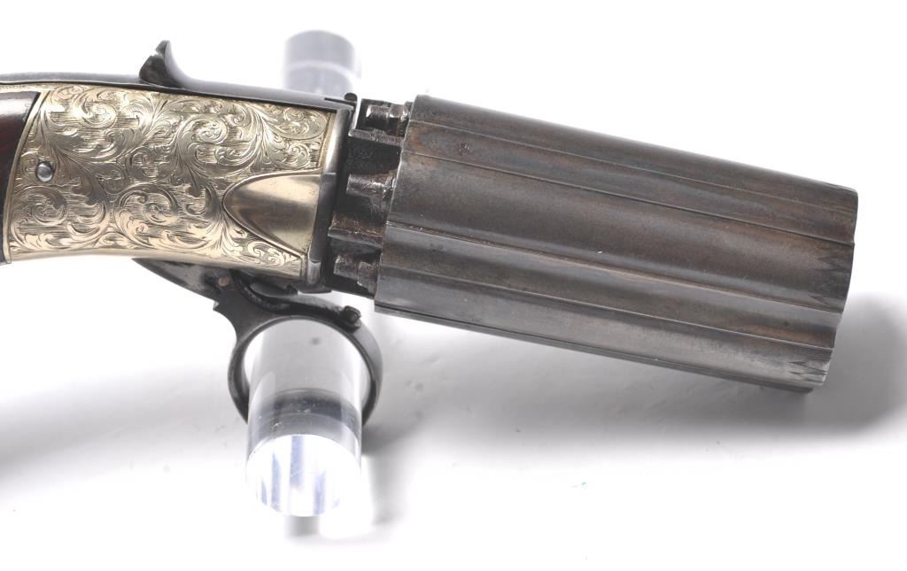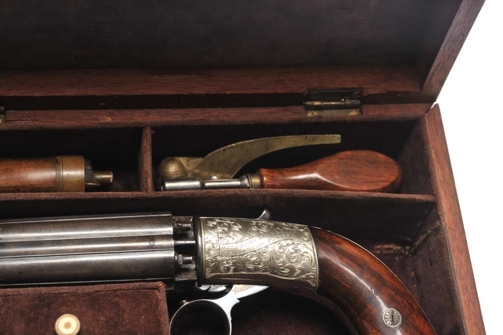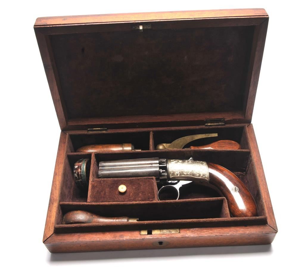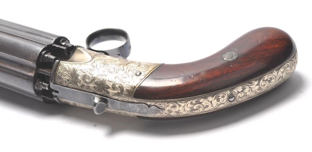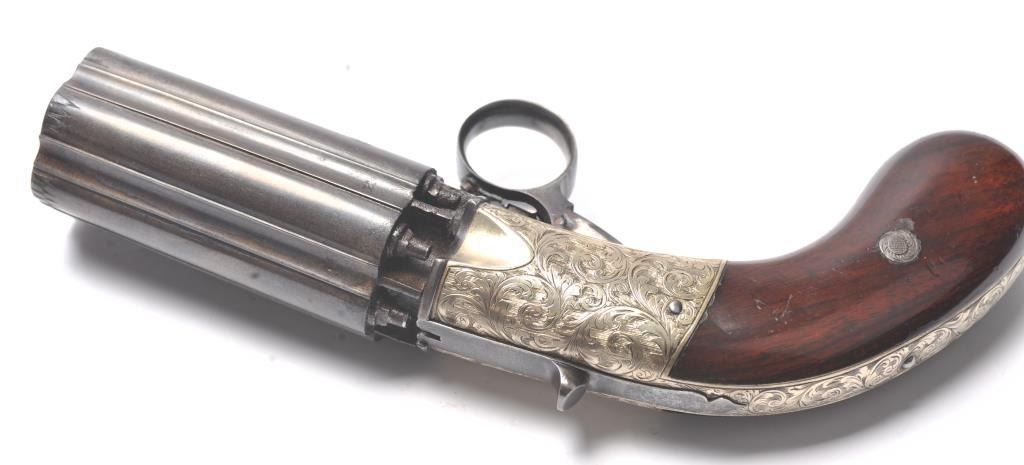 Cased Pepperbox pistol marked “Williams Liverpool J.R. Cooper’s Patent” in banner within highly engraved Britania metal alloy frame. The pepperbox shows a six-shot barrel cluster of .38 to .40 caliber measuring 3 ¼”in length and 7 7/8” overall. The barrels show 20%-50% case hardened finish with some rainbow color remaining. The frame is crisp and sharp. The grips are very good plus to almost fine. The pepperbox shows little useor aging. The original partition style casing is lined in purple velveteen and is also very good plus with minor aging and minor imperfections. A brass mold of proper size, nipple wrench, flask, and rod for disassembly with threaded end are included. The exterior of the case is good plus with some normal aging and imperfections but nothing major. A nice cased pepperbox with exceptional engraving that is totally original. Actionworks well. (Antique) Est.: $1750-$3500