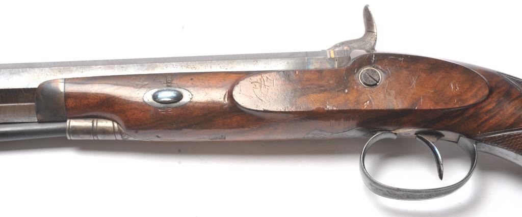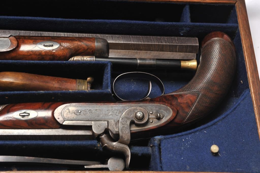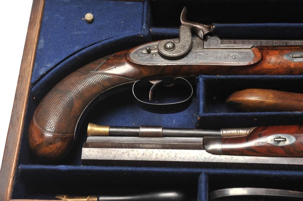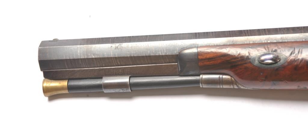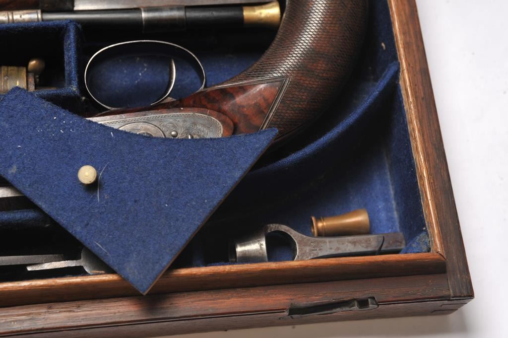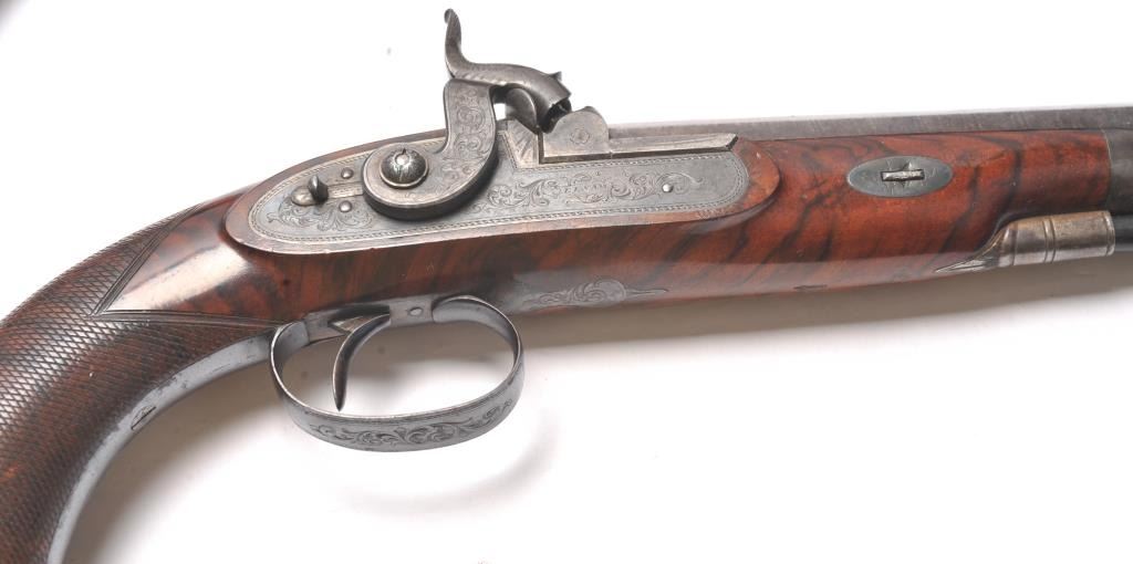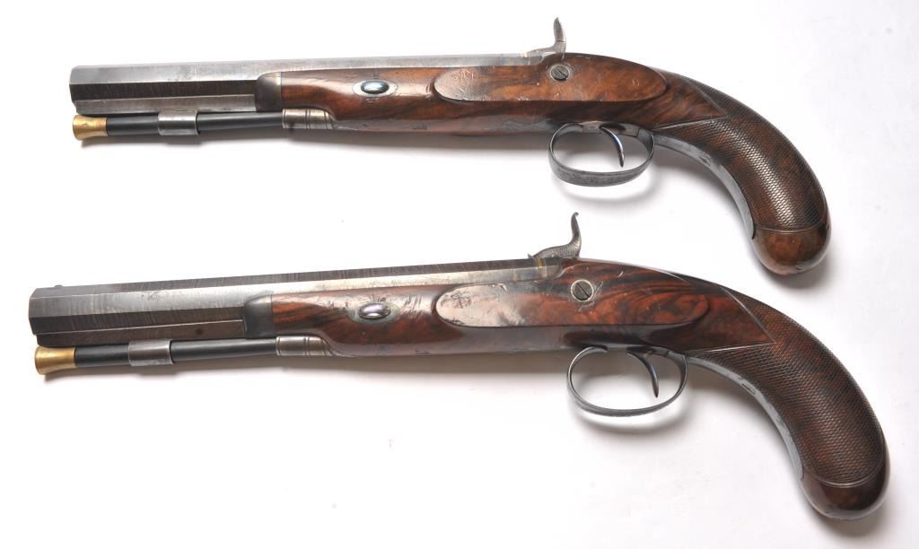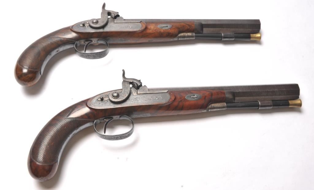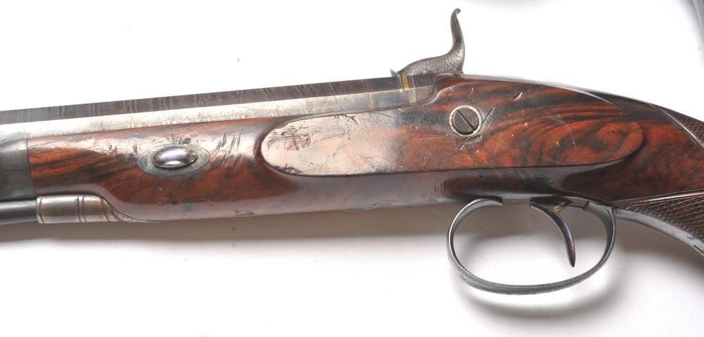 Pair of English Percussion Dueling Pistols signed “Elsam” on locks in fine condition with original case. The pistols measures 15 ½” overall with 9 3/8” octagon barrels of .52-.54 caliber smoothbore. Half stocked with double silver bands and 1 thick gold band at the breech. Nicely checkered select walnut stocks with silver escutcheon. Nicely engraved locks and mounts in English style scrolls. The barrels retain most of theiroriginal striped light brown finish and 60%-80% case colors and locks. The trigger guards retain 95% bright original blue. The stocks are almost fine with most original varnish and a few light marks and minorscratches. Original style ramrods. Both pistols function but one half cock purposely removed. The blue felt interior is very good plus lined in partition style with minor rips, tatters and aging. Correct size mold,proper period flask, rod and jag. Patch cutter, extra rod tip and nipple pick in compartments. The exterior of the box is oak with brass carry handle and mounts. The exterior is good to very good with some