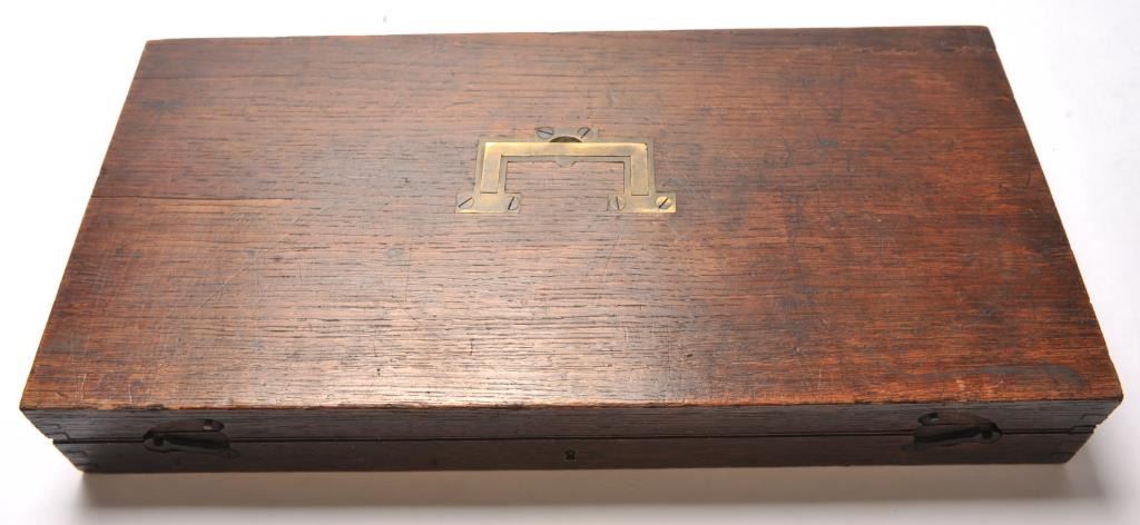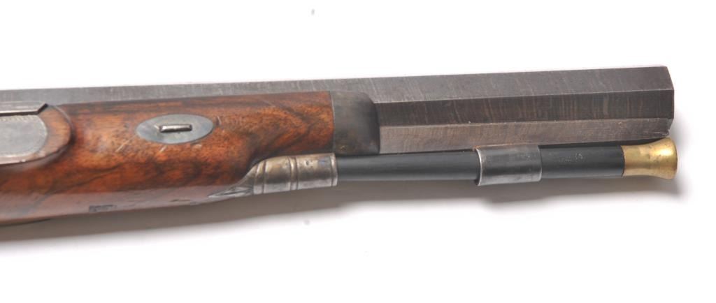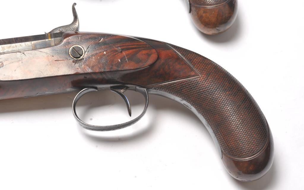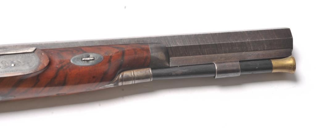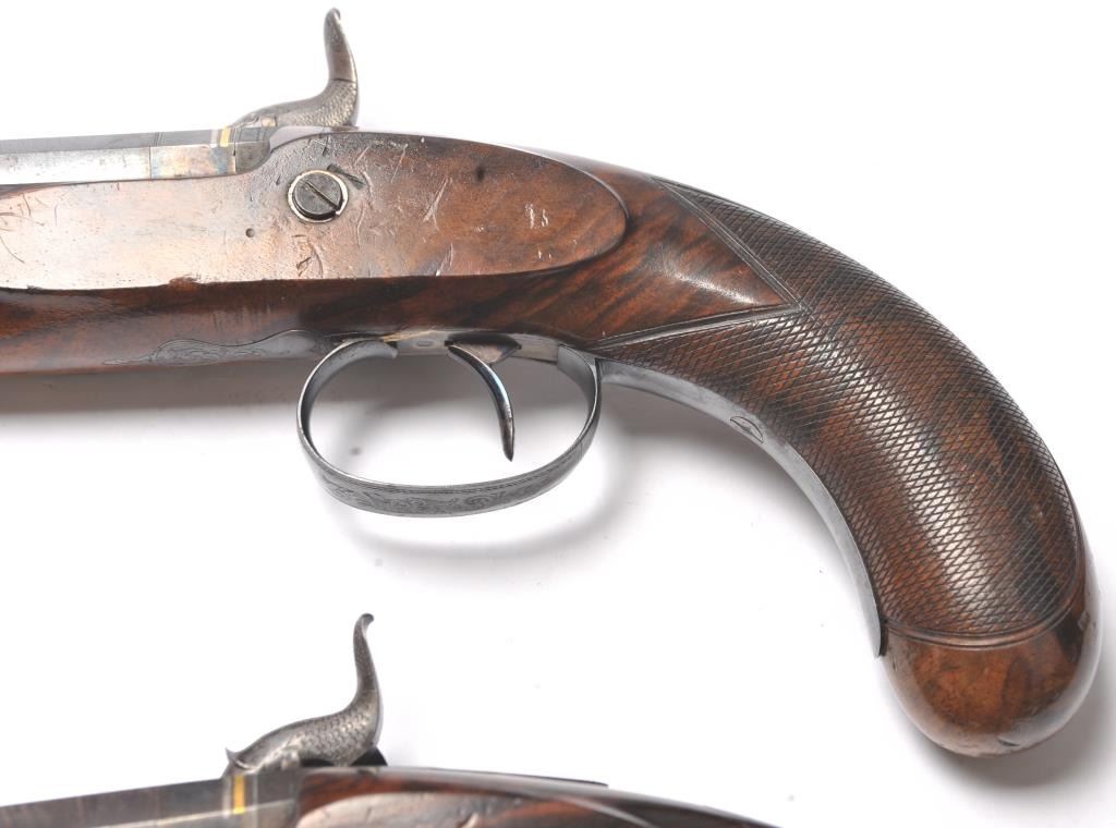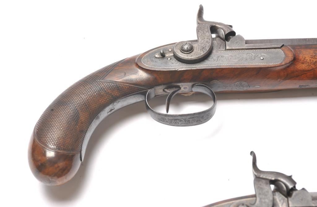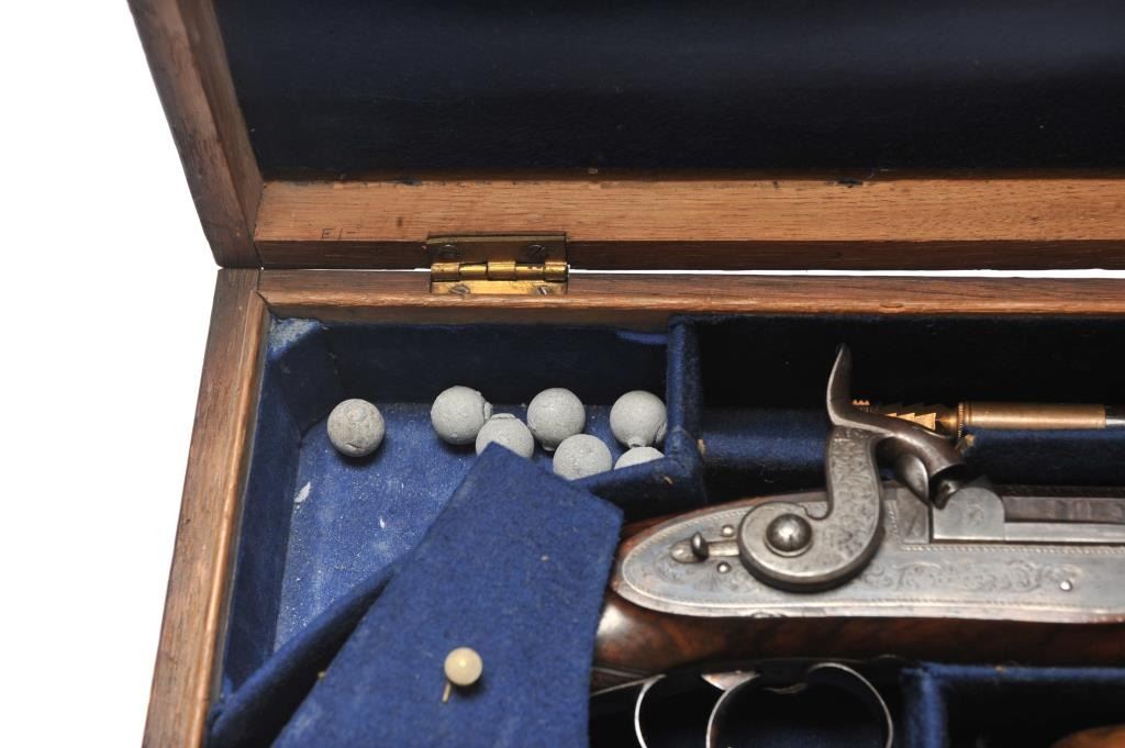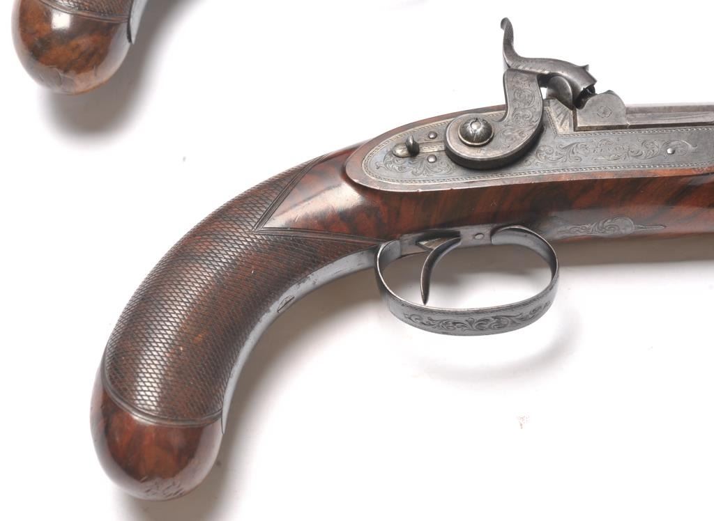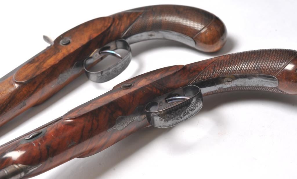 Pair of English Percussion Dueling Pistols signed “Elsam” on locks in fine condition with original case. The pistols measures 15 ½” overall with 9 3/8” octagon barrels of .52-.54 caliber smoothbore. Half stocked with double silver bands and 1 thick gold band at the breech. Nicely checkered select walnut stocks with silver escutcheon. Nicely engraved locks and mounts in English style scrolls. The barrels retain most of theiroriginal striped light brown finish and 60%-80% case colors and locks. The trigger guards retain 95% bright original blue. The stocks are almost fine with most original varnish and a few light marks and minorscratches. Original style ramrods. Both pistols function but one half cock purposely removed. The blue felt interior is very good plus lined in partition style with minor rips, tatters and aging. Correct size mold,proper period flask, rod and jag. Patch cutter, extra rod tip and nipple pick in compartments. The exterior of the box is oak with brass carry handle and mounts. The exterior is good to very good with some