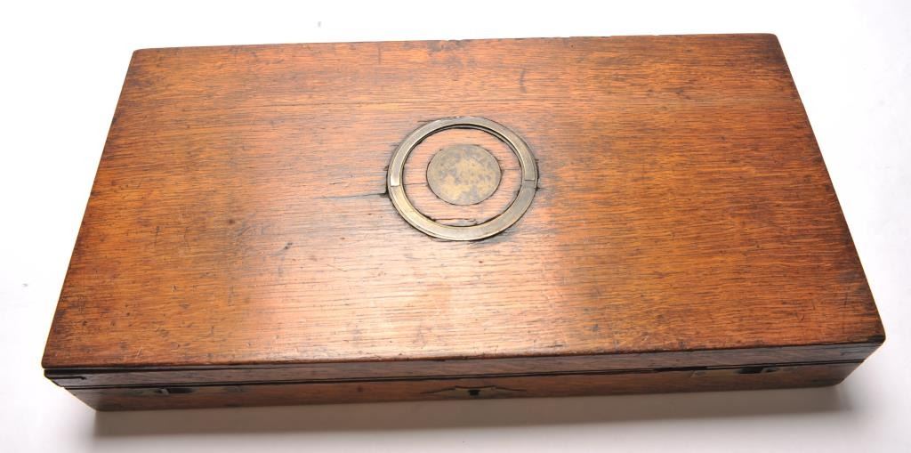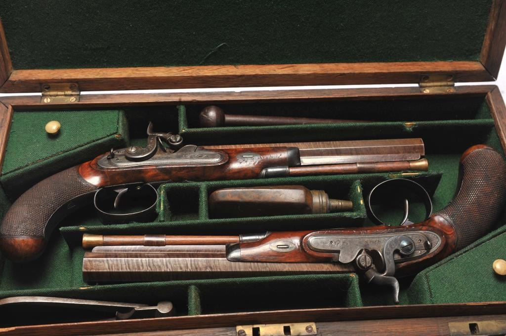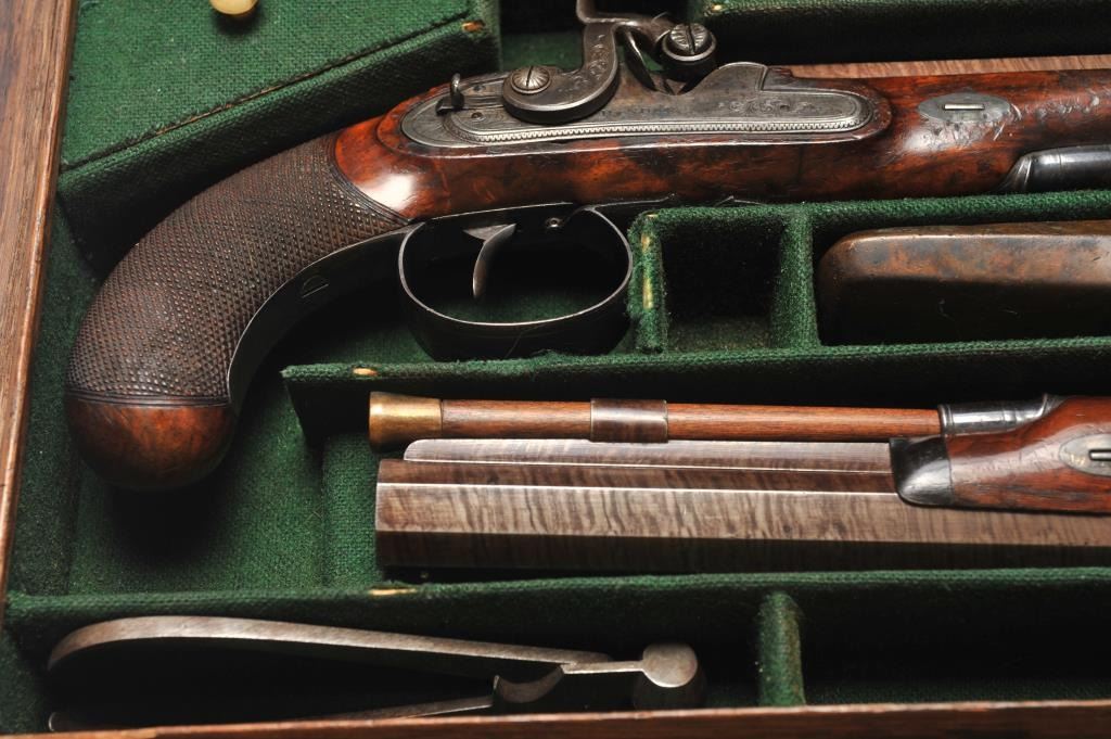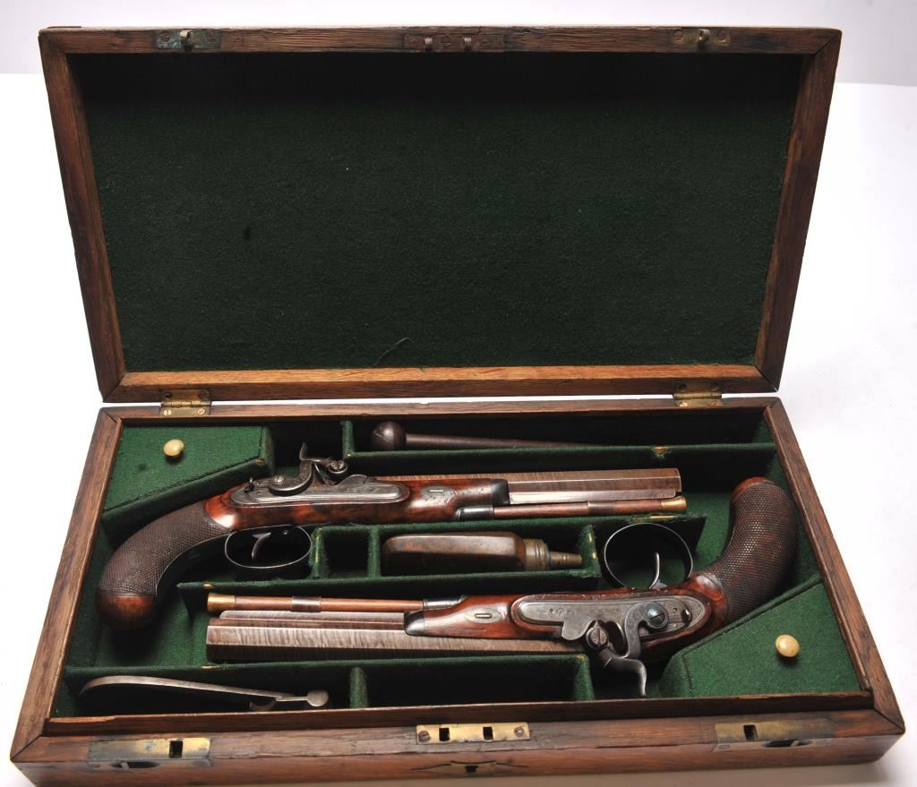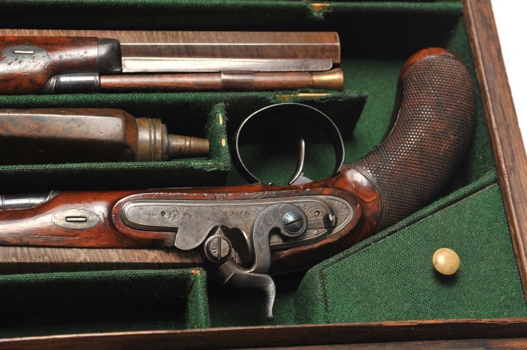 Pair of cased dueling pistols signed “H. Nock London”. Measures 13 ½” overall with a 8 ¼” octagon barrel of approximately .60 caliber smoothbore. A quality conversion by Nock or London gunsmith in our opinion with nicelyengraved bolsters and hammers. The pair show most of their original tobacco brown finish with striped patterns on the barrels and dulling case colors on the locks. The guards show 30%-60% original blue. The stocks aregood plus with crisp checkering. Minor scratches and storage marks. Both pistols are working but 1 does not hold on full cock unless trigger set and needs adjustment. The flask, mold, key and rod is included. Thegreen felt lining is very good with minor fraying, wear at contact points and aging. The case is brass bound oak and shows brass carry type ring. The exterior of the case is good with normal aging, wear and minorcleaning with steel wool. A major London maker. (Antique) Est.: $2000-$4000