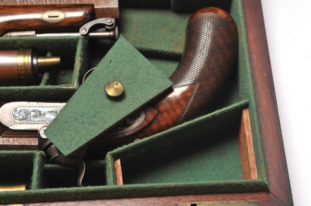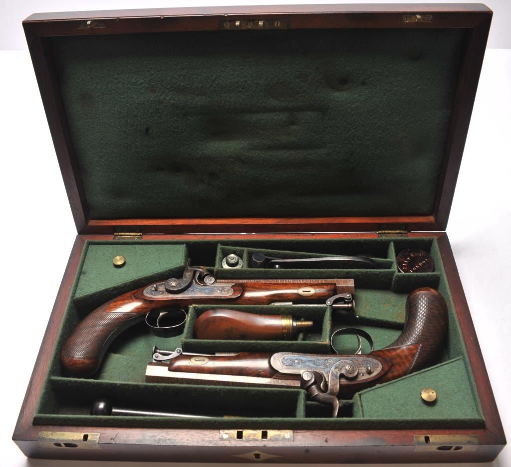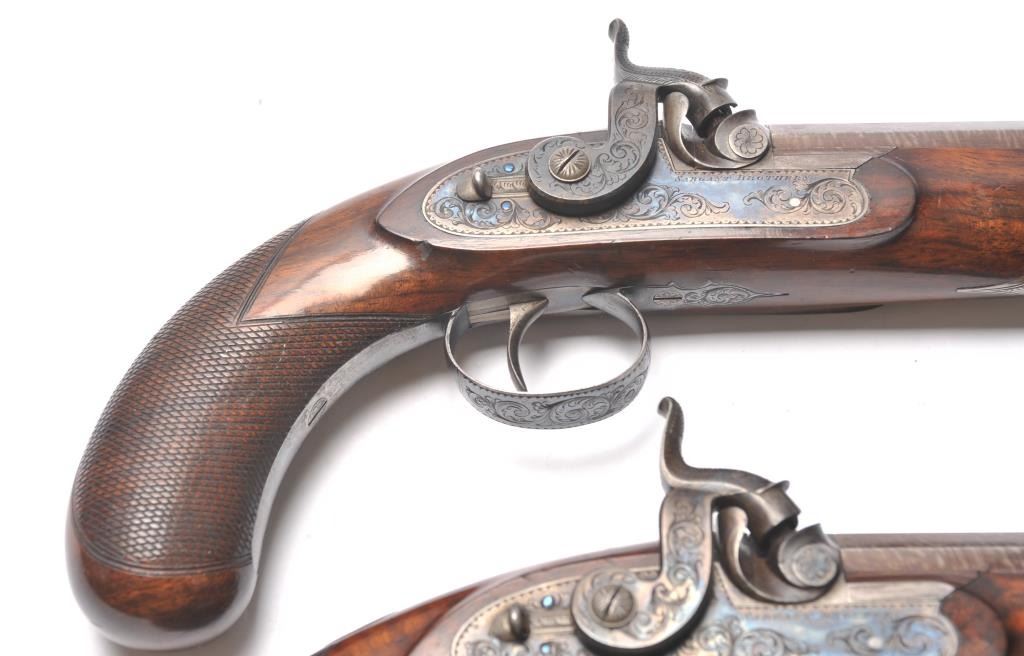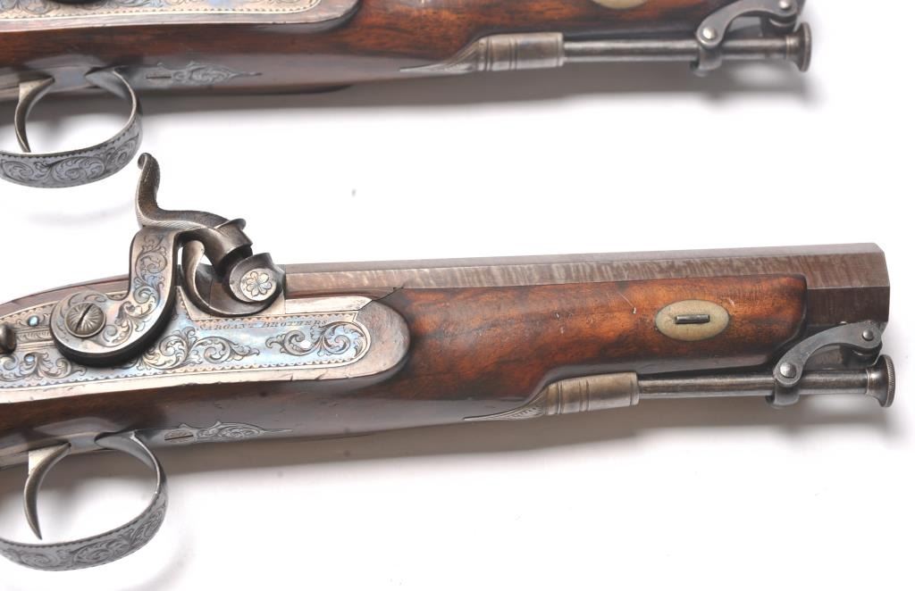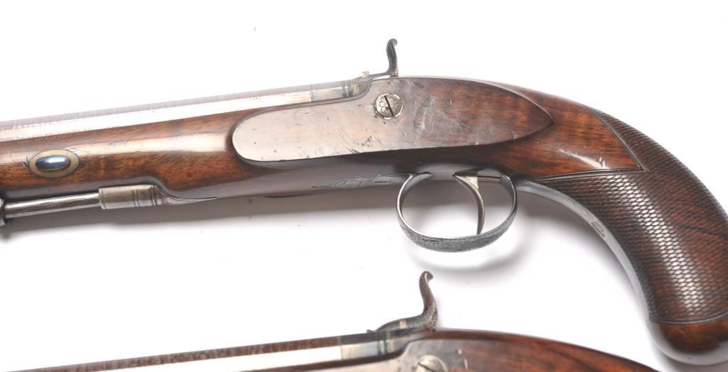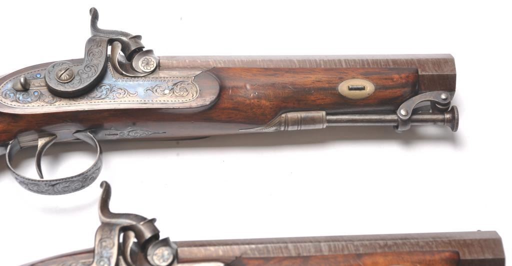 Pair of cased large bore sea captains or belt pistols marked “Sargant Brothers”. The father originally worked in Birmingham and the sons moved to London about 1847. The pair are in fine to excellent original conditionshowing 98%+ bright and fiery case colors and rich tobacco brown on striped barrels. The trigger guards show 98%-99% bright high polish blue finish. The stocks are also fine with minimal light handling marks and slightaging. The proper size mold is “W.D.” marked and in excellent condition. Also included is a very good flask, oiler, cap tin and rod. The interior is lined in green felt with minor impressions and staining. The caseexterior shows a crack and light cleaning but at least very good overall. A strong 9 on a 1-10 scale with stunning original finishes. (Antique) Est.: $3000-$6000