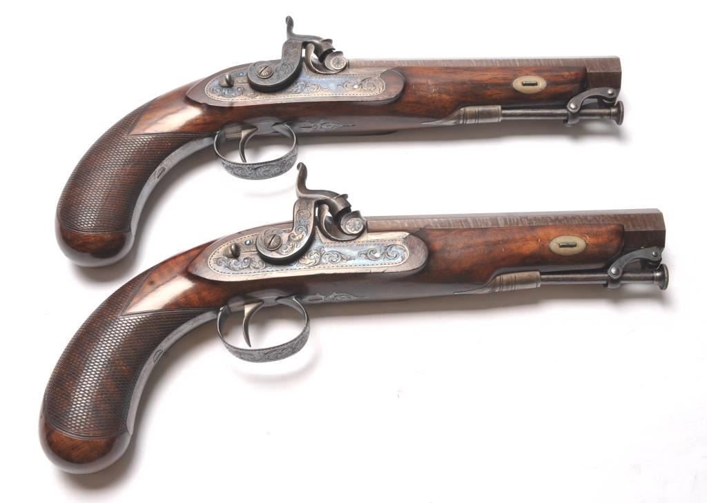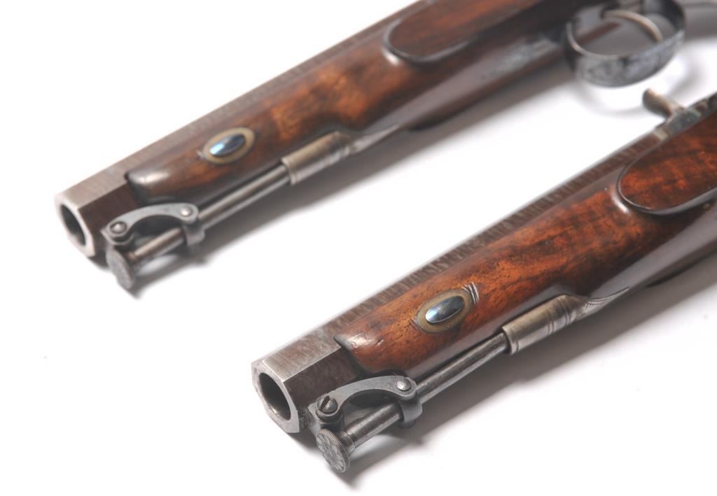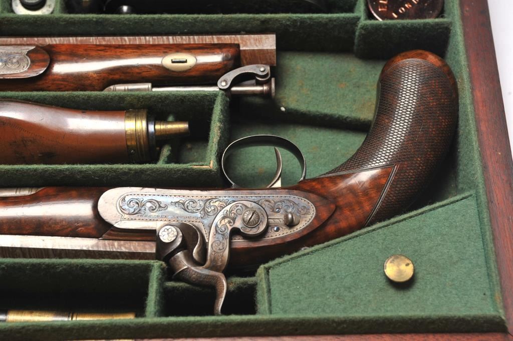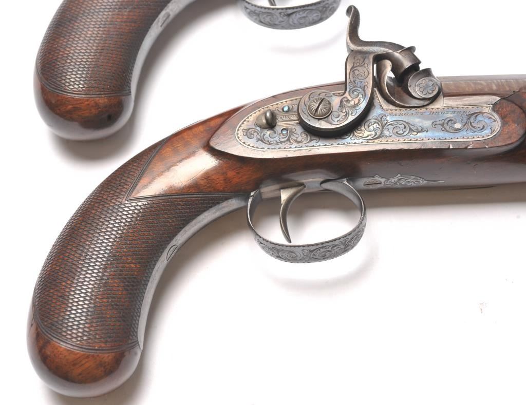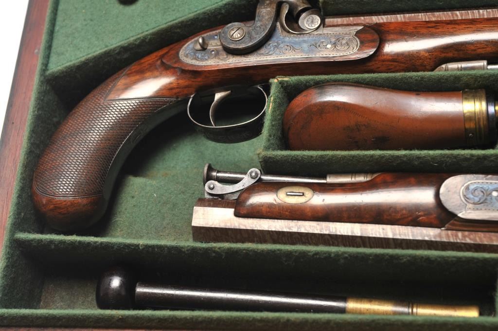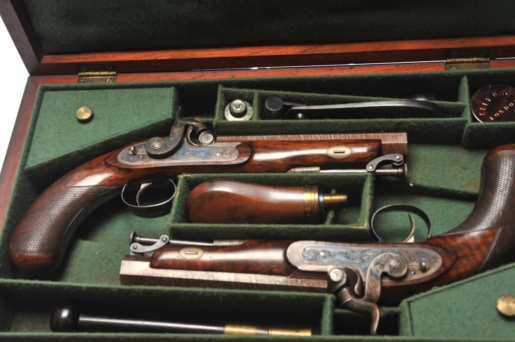 Pair of cased large bore sea captains or belt pistols marked “Sargant Brothers”. The father originally worked in Birmingham and the sons moved to London about 1847. The pair are in fine to excellent original conditionshowing 98%+ bright and fiery case colors and rich tobacco brown on striped barrels. The trigger guards show 98%-99% bright high polish blue finish. The stocks are also fine with minimal light handling marks and slightaging. The proper size mold is “W.D.” marked and in excellent condition. Also included is a very good flask, oiler, cap tin and rod. The interior is lined in green felt with minor impressions and staining. The caseexterior shows a crack and light cleaning but at least very good overall. A strong 9 on a 1-10 scale with stunning original finishes. (Antique) Est.: $3000-$6000