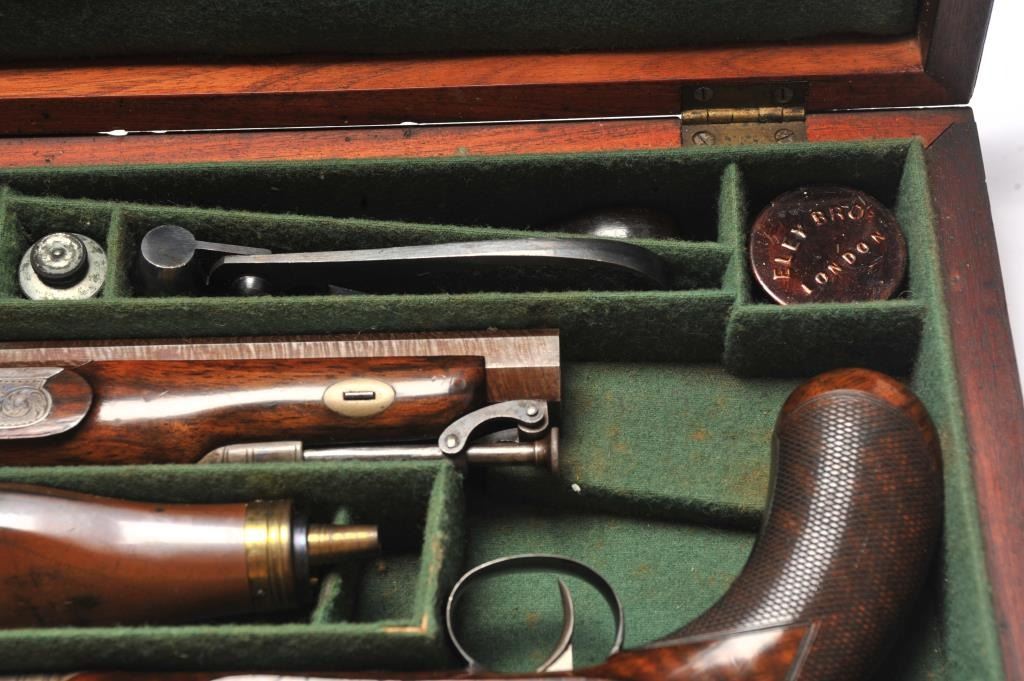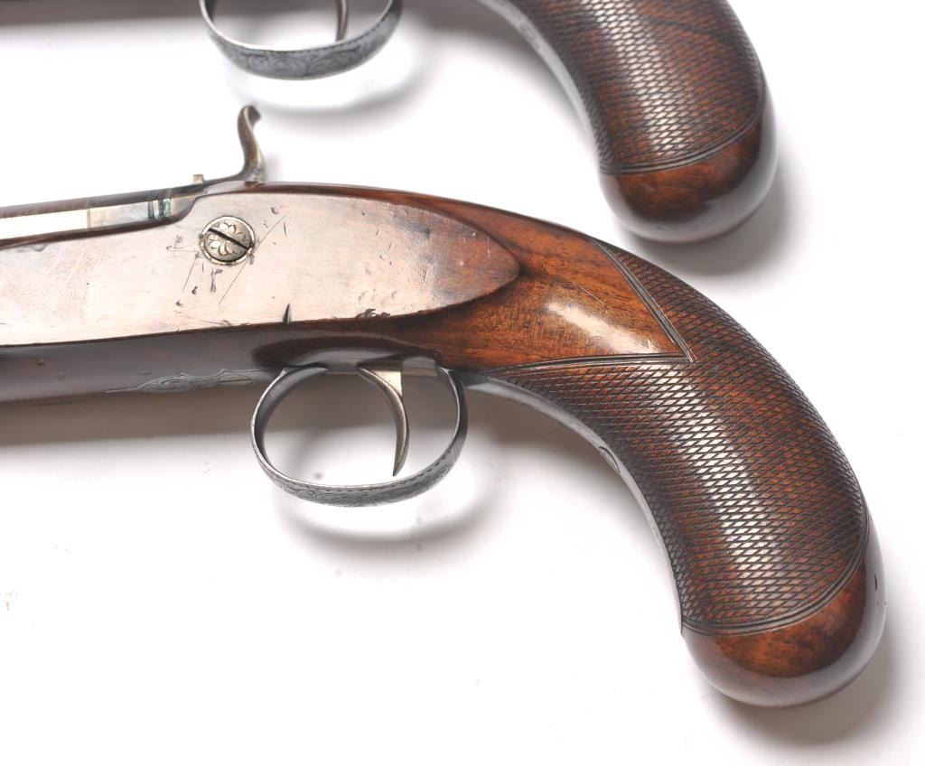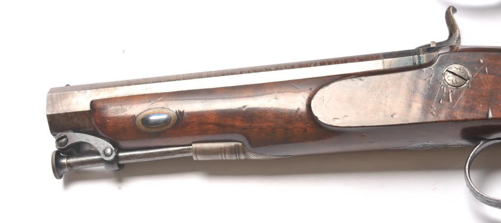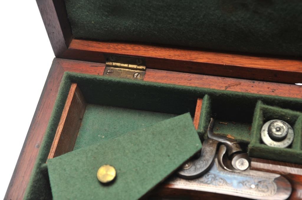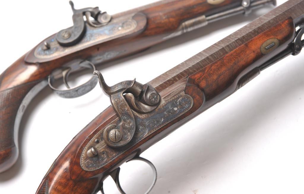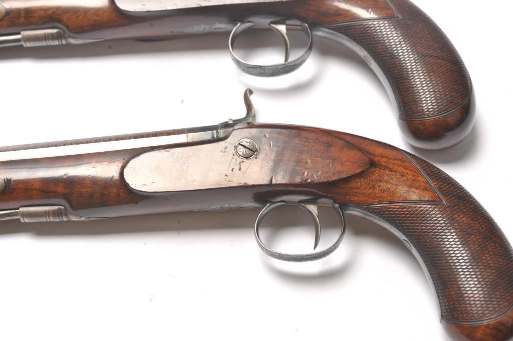 Pair of cased large bore sea captains or belt pistols marked “Sargant Brothers”. The father originally worked in Birmingham and the sons moved to London about 1847. The pair are in fine to excellent original conditionshowing 98%+ bright and fiery case colors and rich tobacco brown on striped barrels. The trigger guards show 98%-99% bright high polish blue finish. The stocks are also fine with minimal light handling marks and slightaging. The proper size mold is “W.D.” marked and in excellent condition. Also included is a very good flask, oiler, cap tin and rod. The interior is lined in green felt with minor impressions and staining. The caseexterior shows a crack and light cleaning but at least very good overall. A strong 9 on a 1-10 scale with stunning original finishes. (Antique) Est.: $3000-$6000