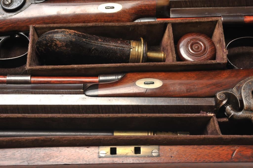 Pair of Percussion dueling style pistols signed “L. I. Barnet Lord St Liverpool”. Measures 15” overall with 9 1/8” heavy octagon barrels of approximately .45 caliber smoothbore with sighted barrels and settriggers. In near fine condition retaining most of their original browning on striped barrels and case hardening still colorful on the locks and breeches. 80%+ bright blue on the trigger guards. Tight and crisp actionwith proper style ramrods. The velveteen two color case is very good plus with minor fading and aging. Mold, flaks, nipple wrench, cap box, rod, and compartment covers all of proper size and era. Rod tip and key in onecompartment. The exterior of the case is very good with minor aging with brass carry handle and fixtures. A very nice set. (Antique) Est.: $2500-$5000