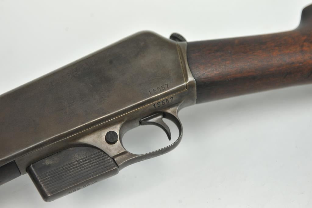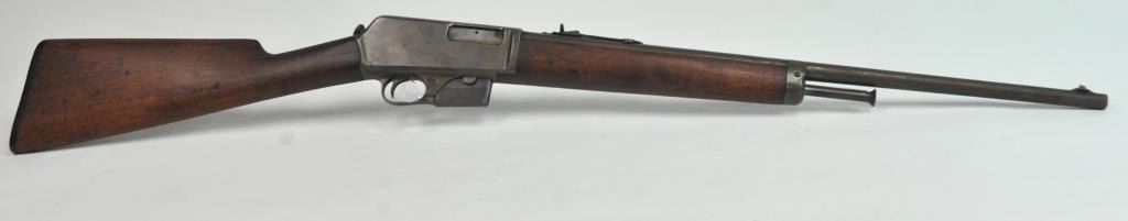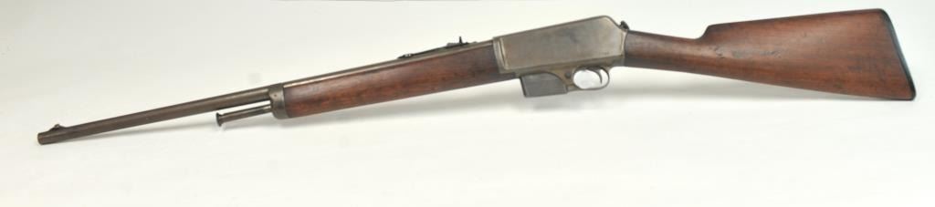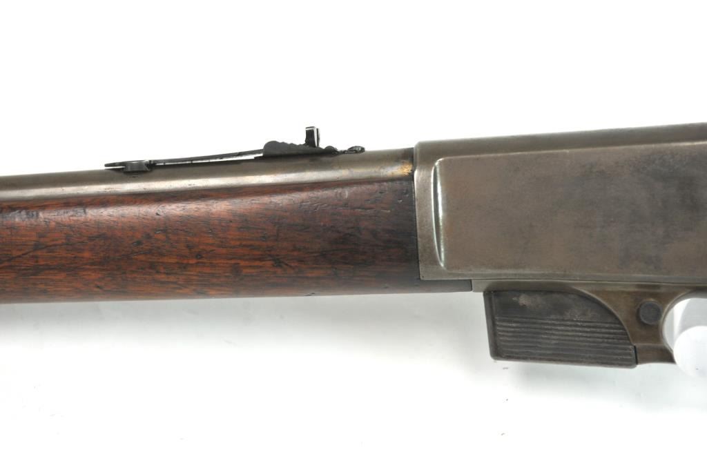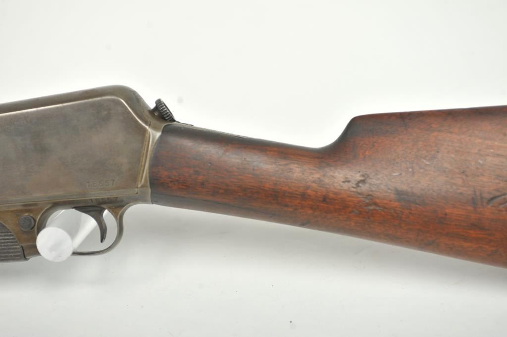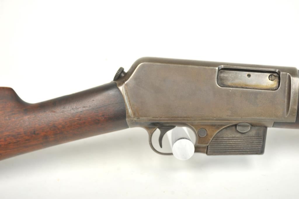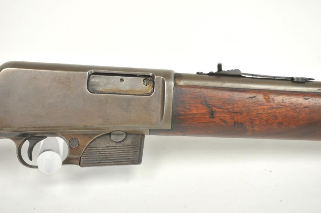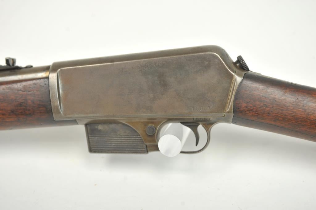 Winchester Model 1905 Self Loading Semi-Auto Rifle in .32 SL caliber, S/N 15557. Good overall condition with lightly cleaned to gray brown patina and some light storage rust. Marble rear sight and front sightreplaced during use. The stocks are good with light steel wool type cleaning. Stress crack in right wrist from firing. Winchester butt plate worn but intact. The action is good and the bore is dirty and needs cleaning. (C&R)Est.: $250-$500