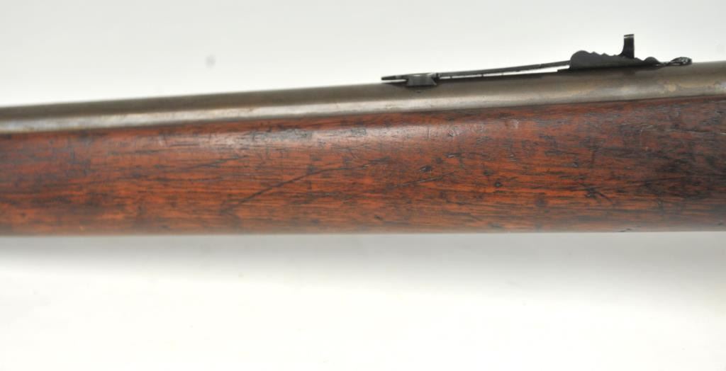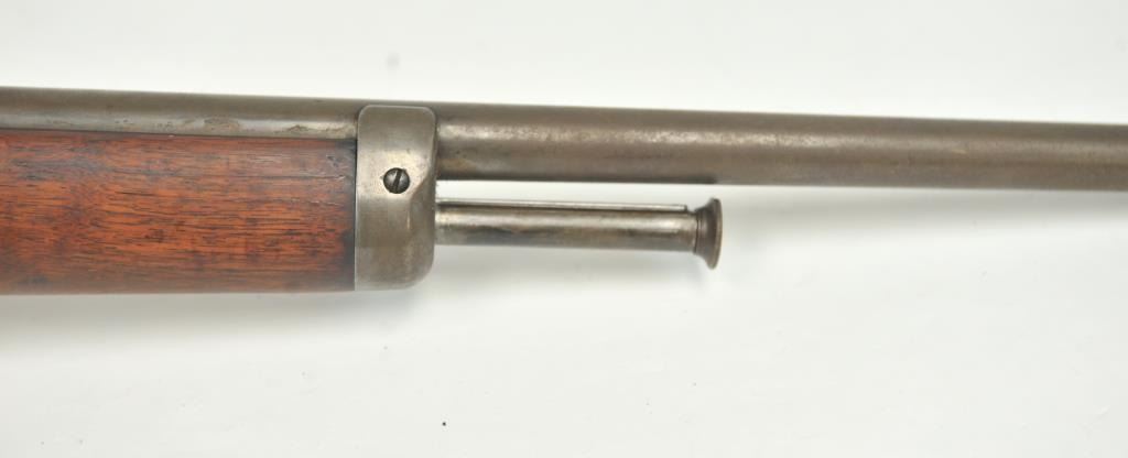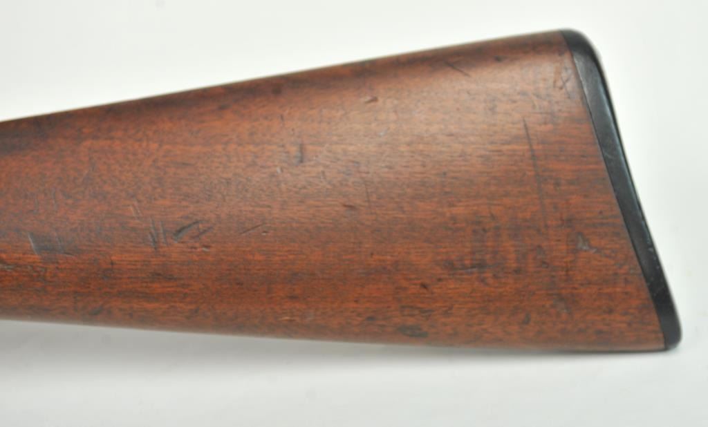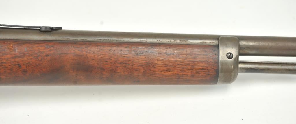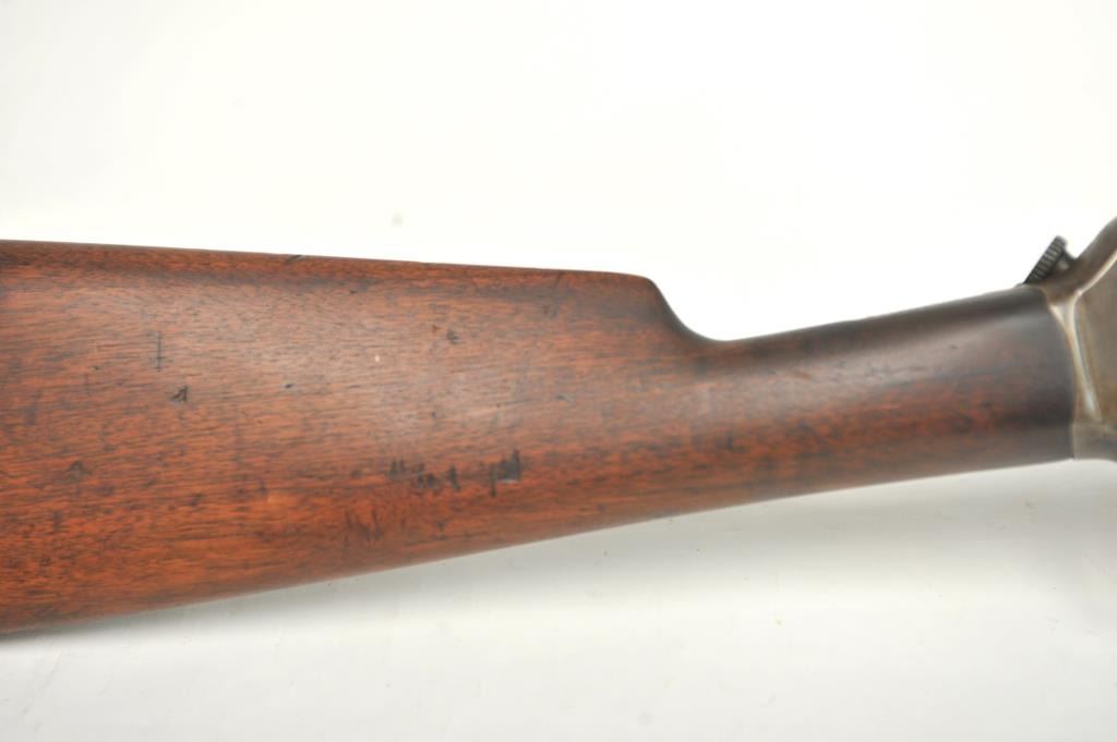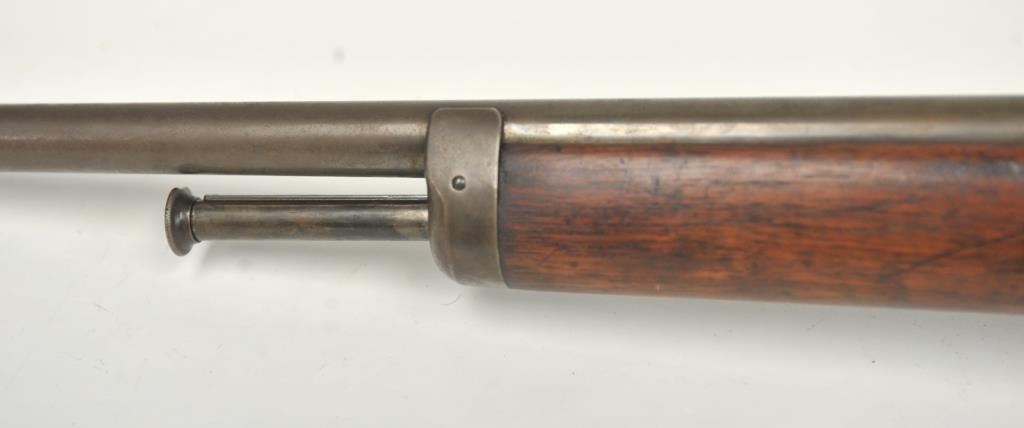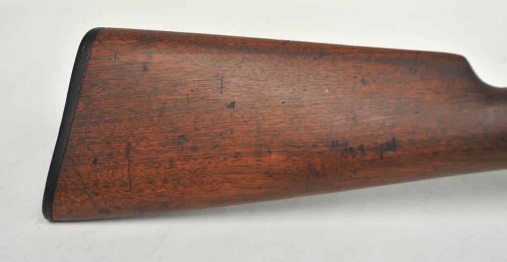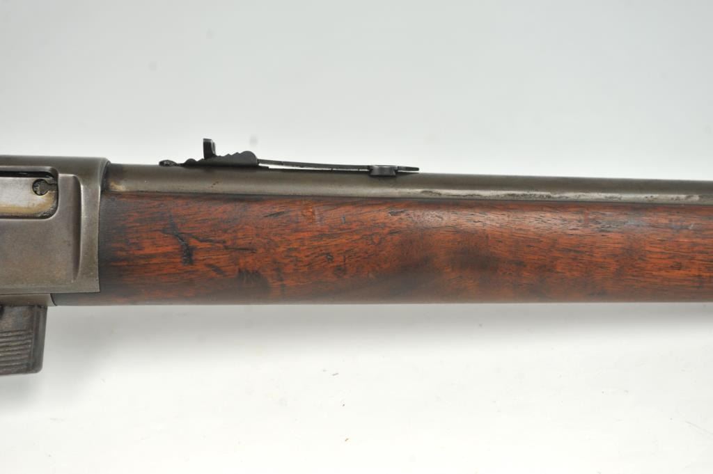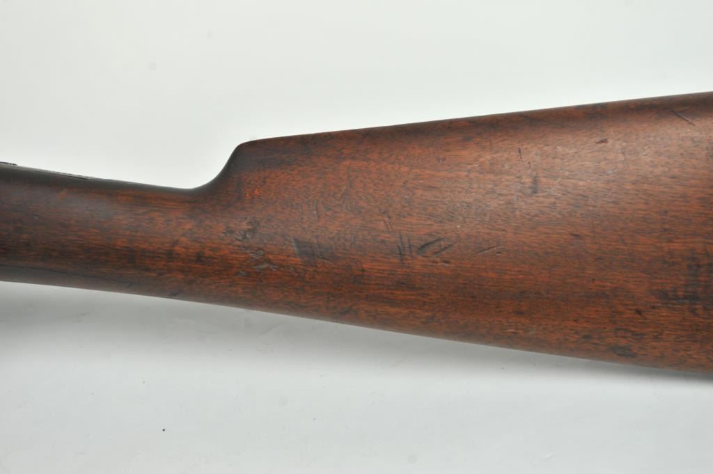 Winchester Model 1905 Self Loading Semi-Auto Rifle in .32 SL caliber, S/N 15557. Good overall condition with lightly cleaned to gray brown patina and some light storage rust. Marble rear sight and front sightreplaced during use. The stocks are good with light steel wool type cleaning. Stress crack in right wrist from firing. Winchester butt plate worn but intact. The action is good and the bore is dirty and needs cleaning. (C&R)Est.: $250-$500