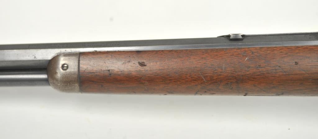 Winchester Model 1892 Lever Action Rifle in .25-20 caliber with a 26” octagon barrel, full mag, rifle butt, S/N 647162. 60%-80% toning blue on the barrel and mag tube showing minor erosion and starting pinprickpitting. The frame has drifted to traces of blue and brown. The stocks are good with 30%-60% original varnish and show the name “C. Jiran 1935” carved in left butt stock. The action is good and the bore is bright.(C&R) Est.: $600-$1200