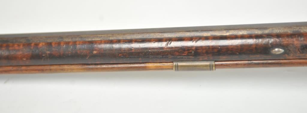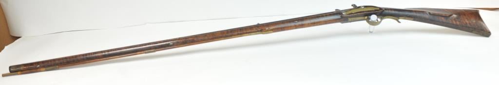 Flintlock “Kentucky” style gun signed in script “J. Gumpf” (Probably John Gumpf Lancaster, PA circa 1825), and also marked “Drepert” on the lock. The side plate is engraved in fancy script letters “U R No 5”and a small museum type copper disk #75 affixed to the left rear of the butt. False striped wood stock and simple and plain patch box. Measures 57” overall with a 42” barrel of approximately .50-.52 caliber smoothboreof medium weight. The condition is very good plus overall retaining most of its original varnish on the stock with minimal imperfections and slight aging. The metal is also very good with brown patina and someminor pitting and erosion from firing. Original flintlock parts and lock works well. Very possibly a gun made for Indian trade. (Antique) Est.: $2500-$5000
