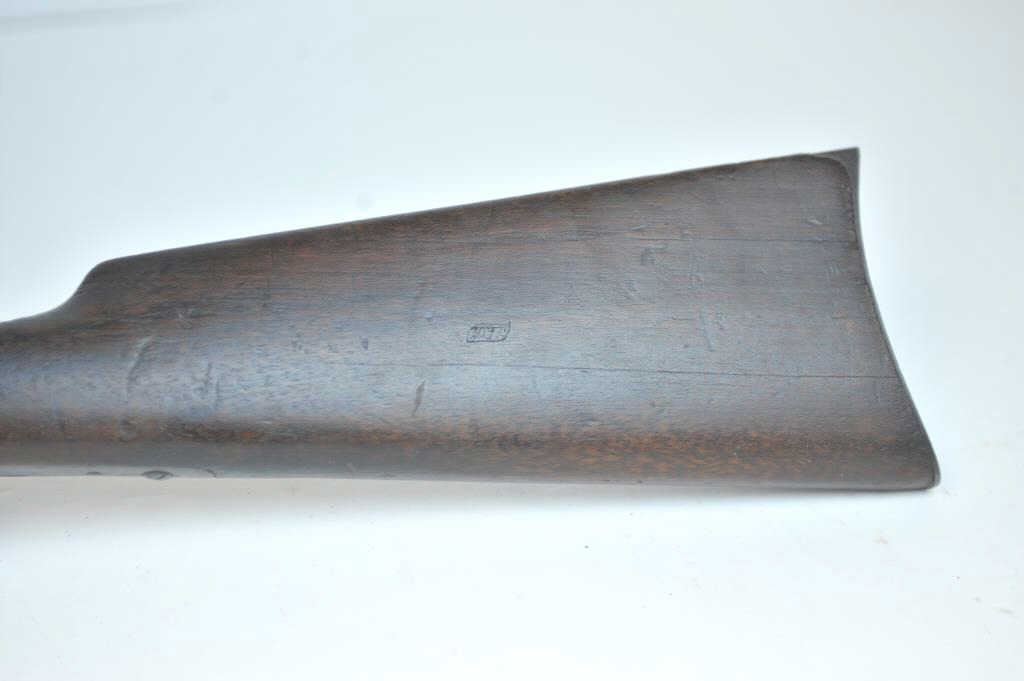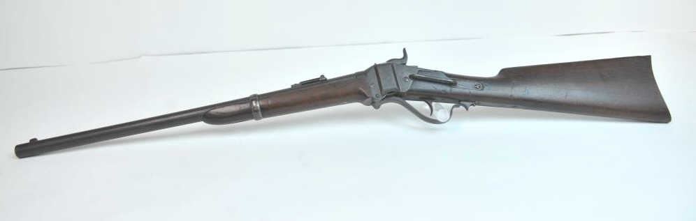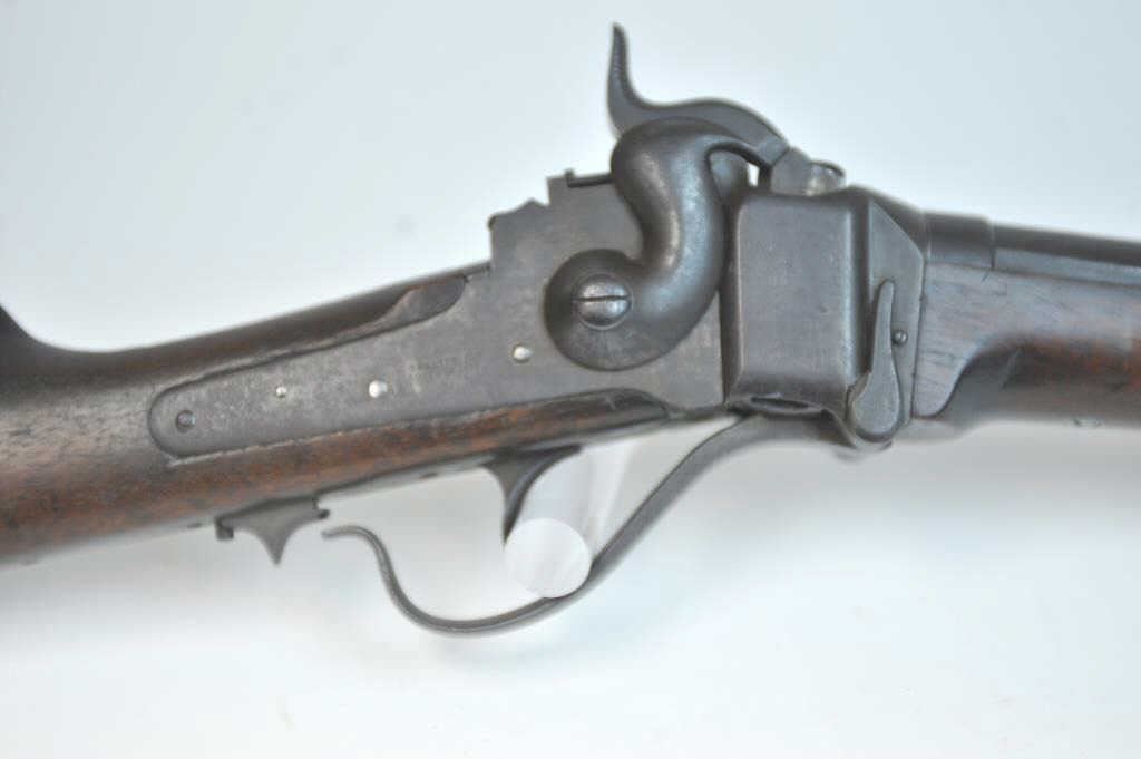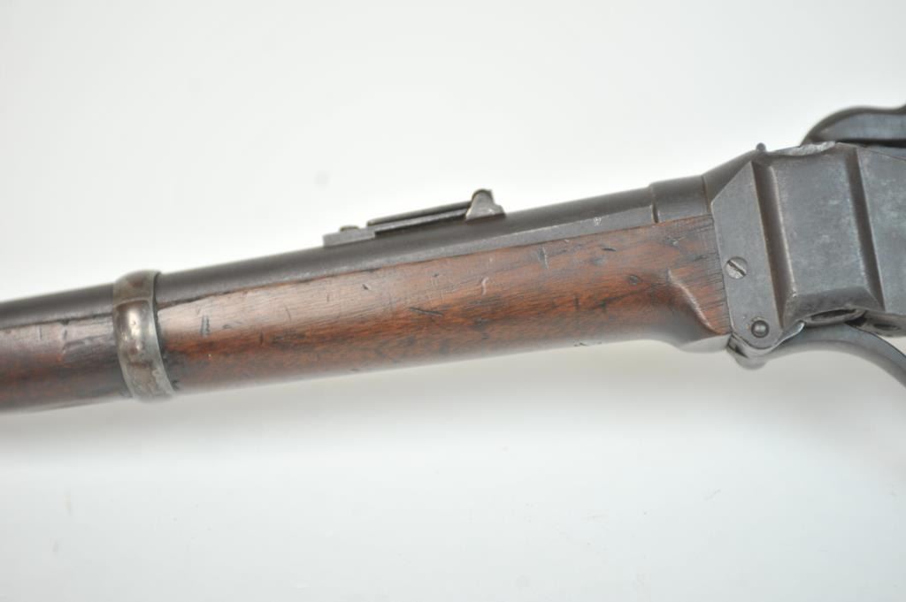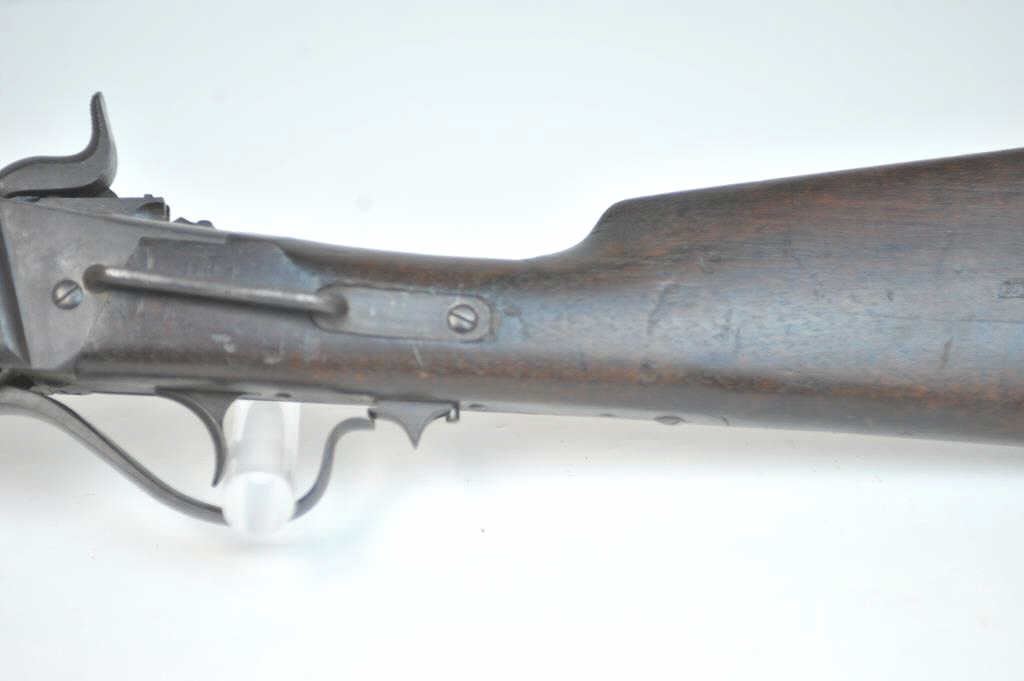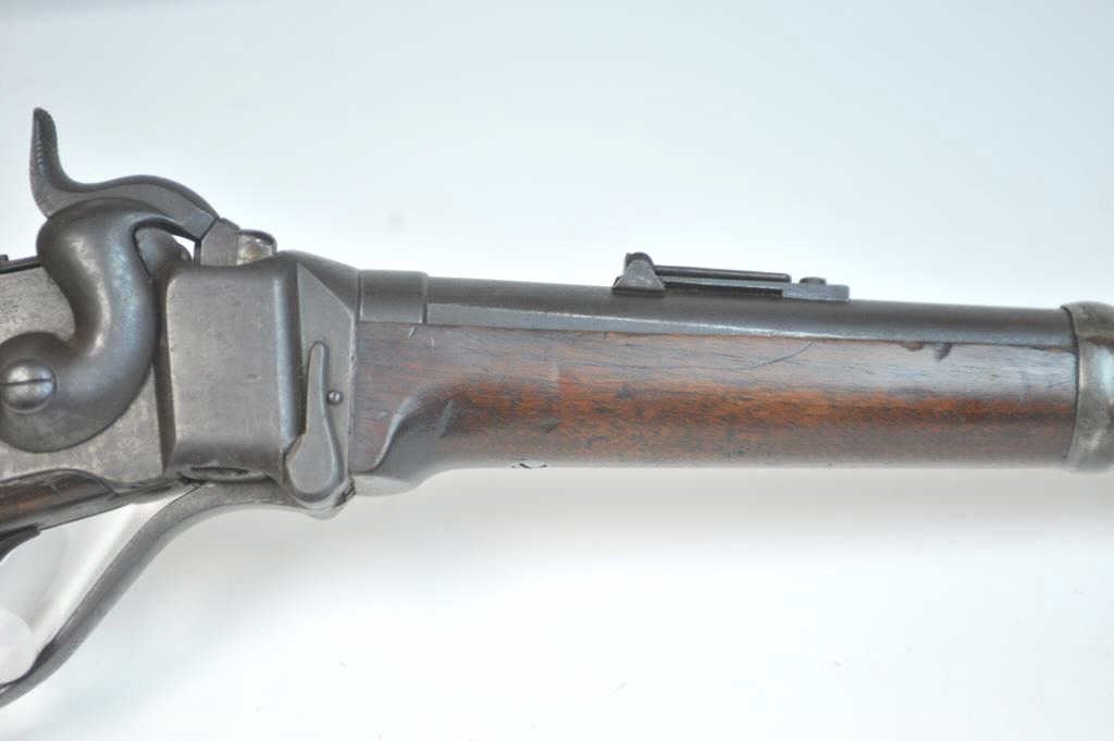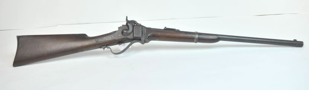 Sharps Carbine Model 1859 Conversion to .50-70 caliber, S/N C8860. Brown patina overall with generous blue and case colors mixed in (at least 30%-50%). Some scattered light erosion and just beginning pinprickpitting. Good lock markings but none visible on the barrel. Sight shows Lawrence and patent dates. The stocks are very good with normal aging and some bumps and mars. Good cartouche at the left center of the buttplate “D.F.C.” The saddle ring was removed long ago but bar is retained. The bore shows some roughness and erosion but may clean well. (Antique) Est.: $1400-$2800