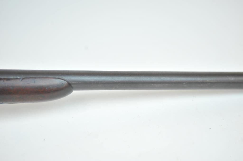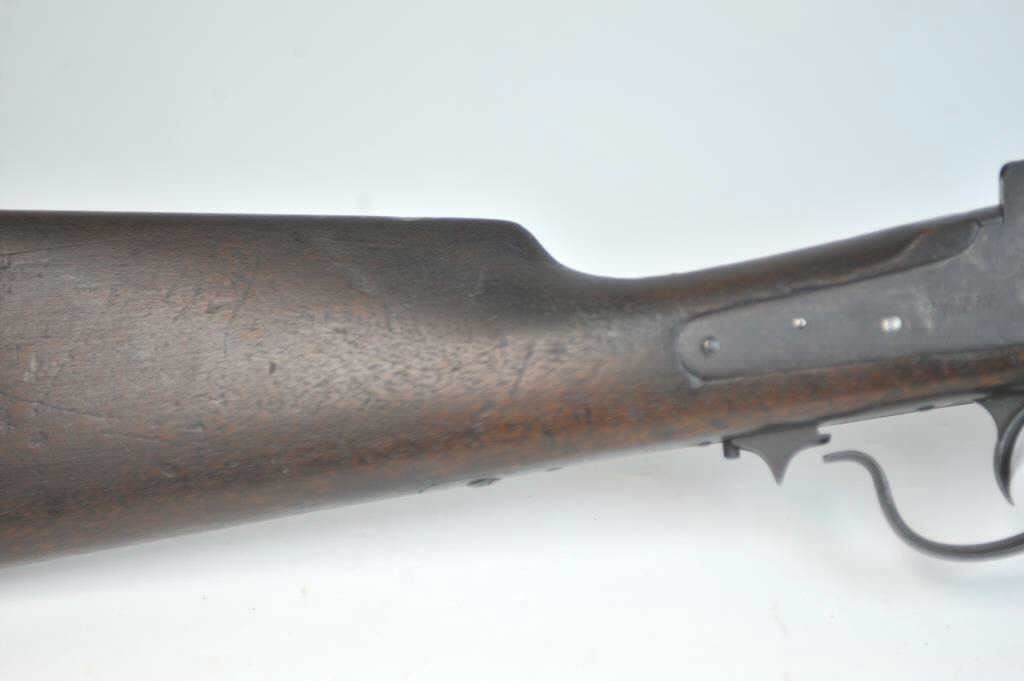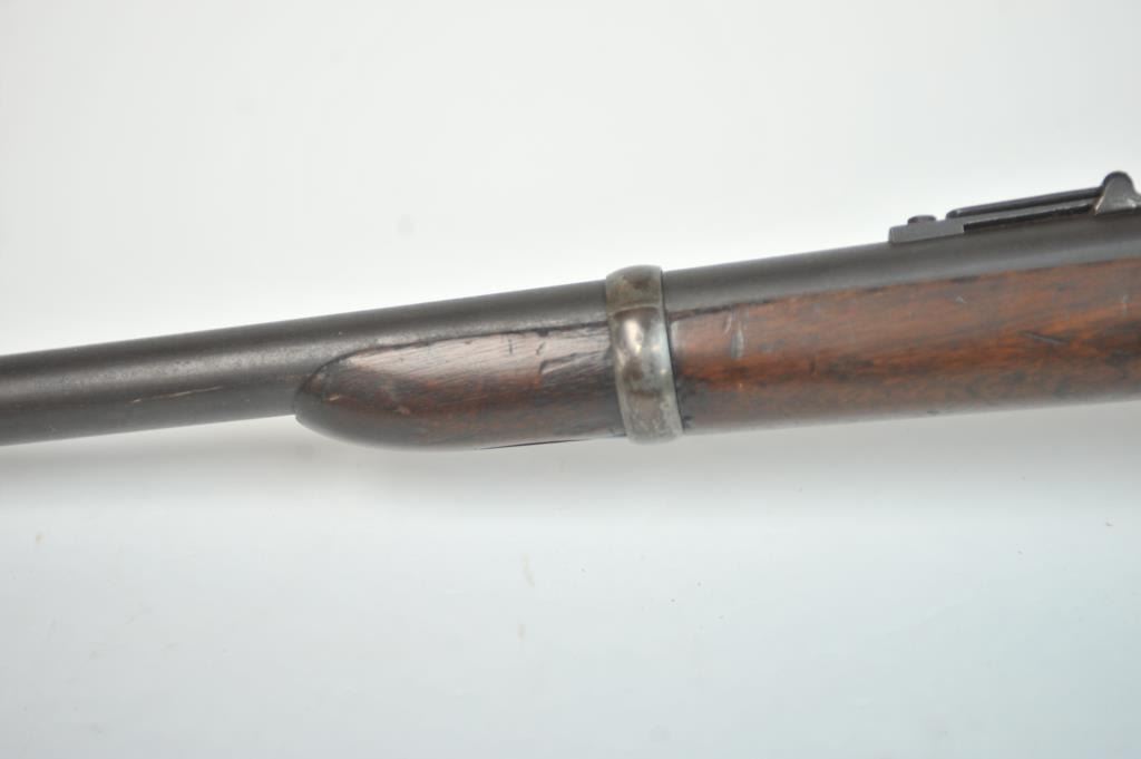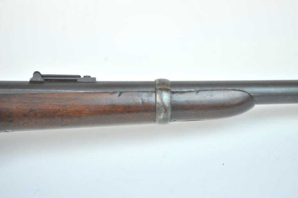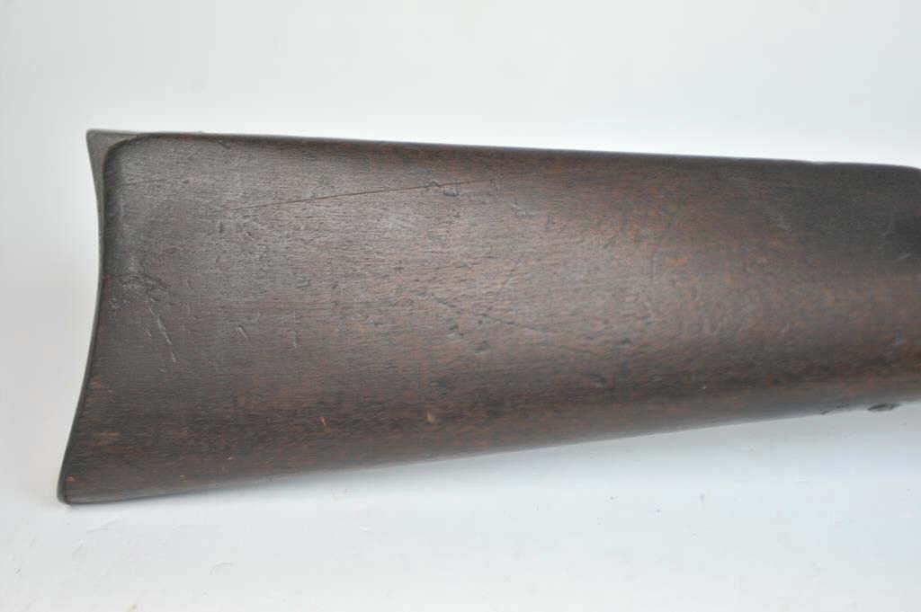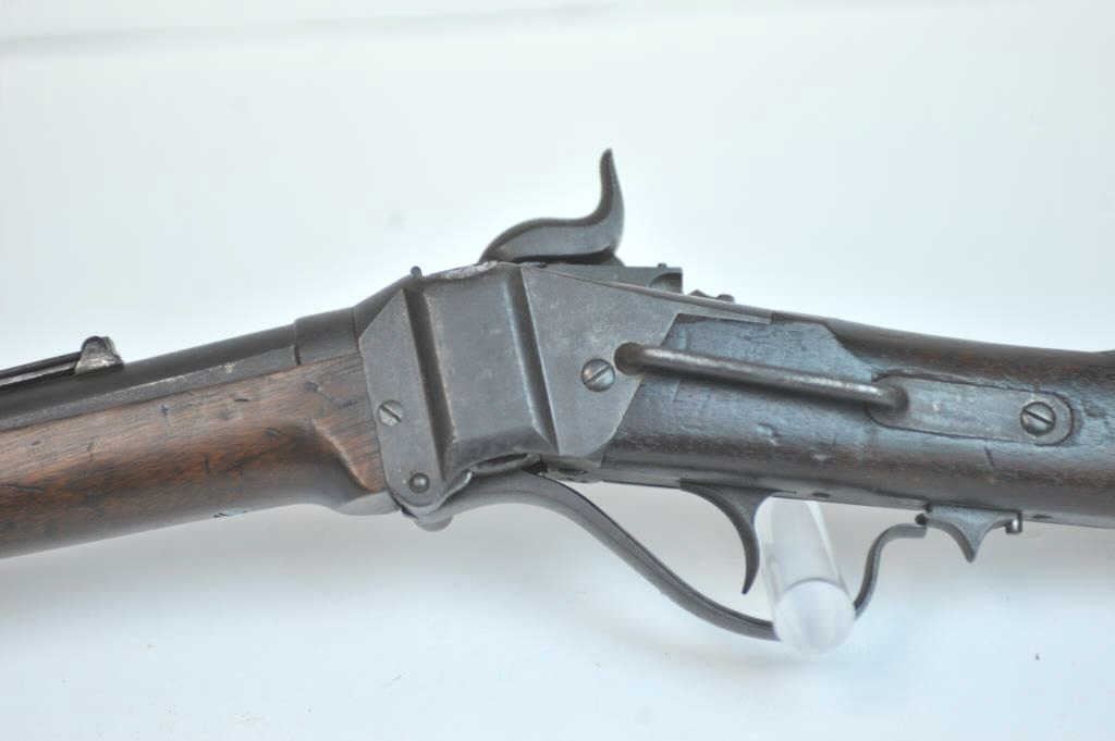 Sharps Carbine Model 1859 Conversion to .50-70 caliber, S/N C8860. Brown patina overall with generous blue and case colors mixed in (at least 30%-50%). Some scattered light erosion and just beginning pinprickpitting. Good lock markings but none visible on the barrel. Sight shows Lawrence and patent dates. The stocks are very good with normal aging and some bumps and mars. Good cartouche at the left center of the buttplate “D.F.C.” The saddle ring was removed long ago but bar is retained. The bore shows some roughness and erosion but may clean well. (Antique) Est.: $1400-$2800