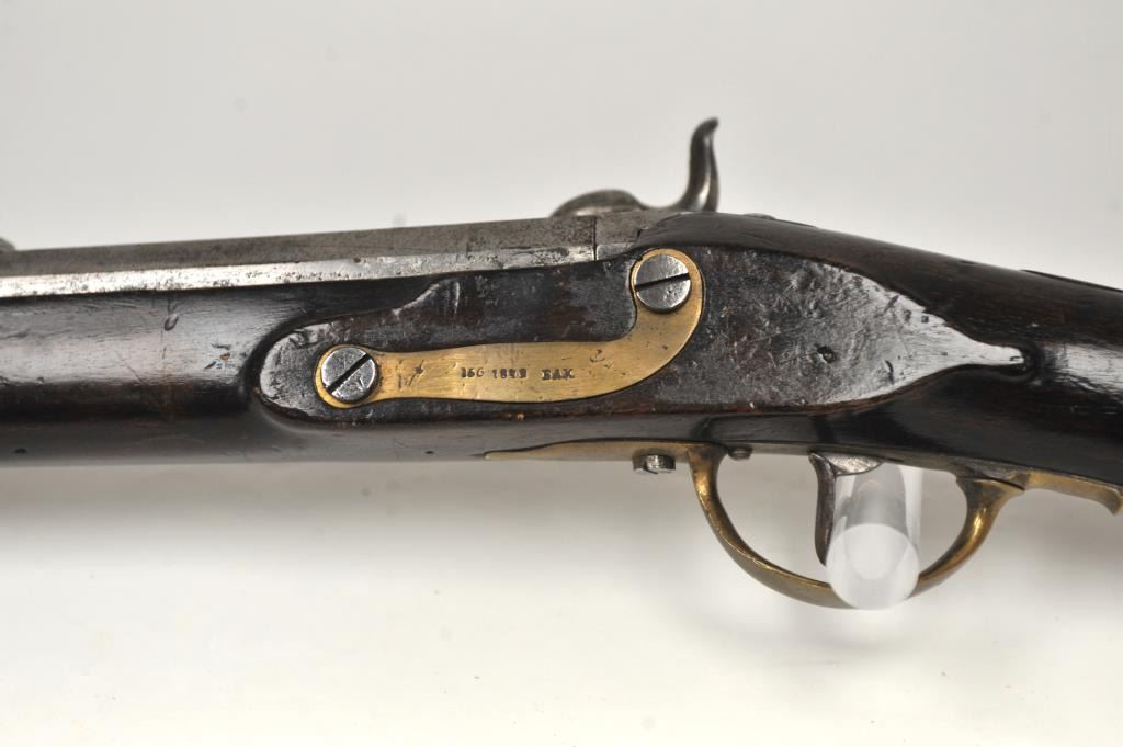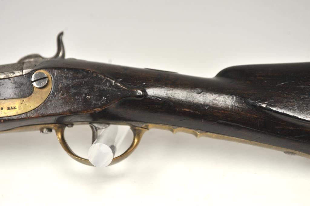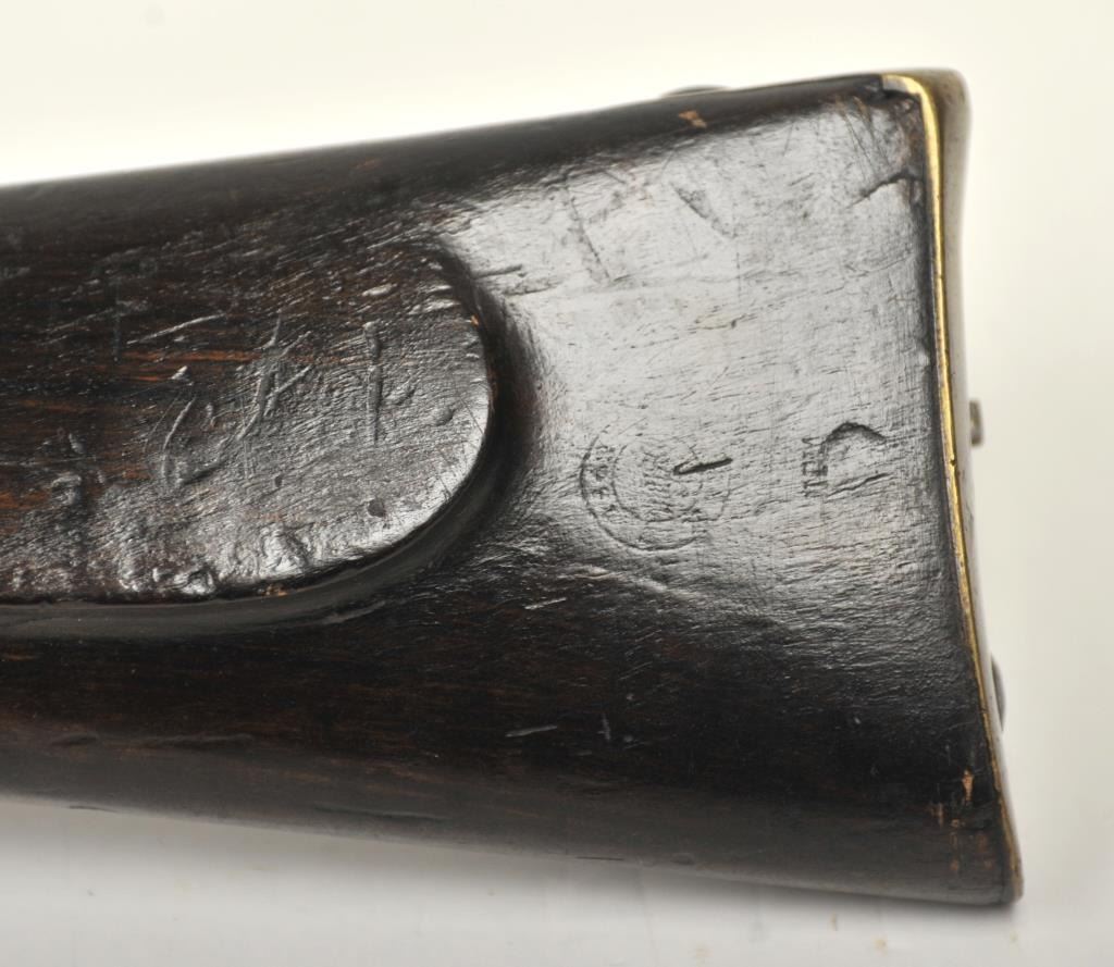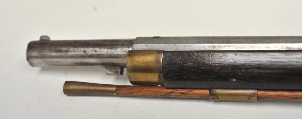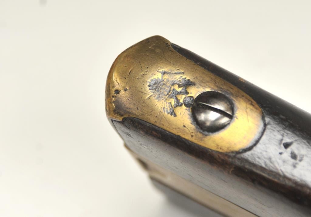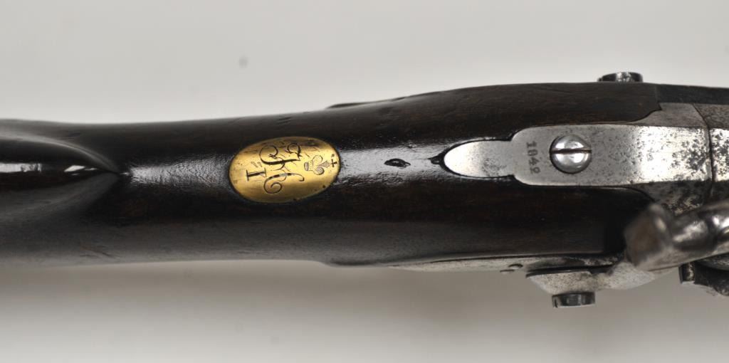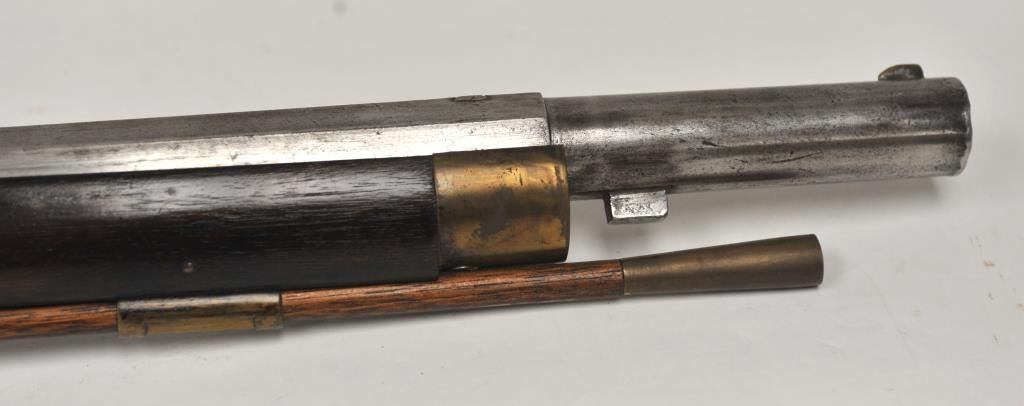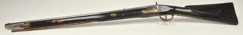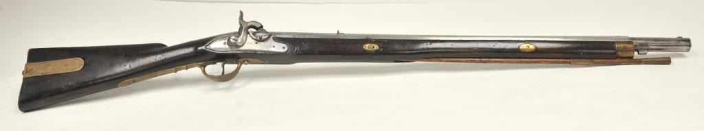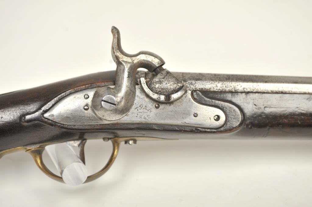 Russian flintlock carbine converted to percussion with Tula arsenal mark and dated 1842. Measures 45” overall with a 29” barrel turned round at forward 4” to accept a bayonet on under mounted stud. Crest engraved on the oval plaque at wrist “H 1” with crown and cross. 1842 date also on tang. Approximately .70 caliber rifled bore. Brass tipped wooden ramrod included. V notch and post sight. Trigger guard stamped “156” andalso marked on side plate “1842 BAK” probably arsenal conversion number, date and inspectors initials. Lightly cleaned metal surfaces with scattered light to heavy pitting at firing areas. The stock is goodwith marks, dings and wear. Russian eagle stamped on brass butt plate. (Antique) Est.: $350-$700