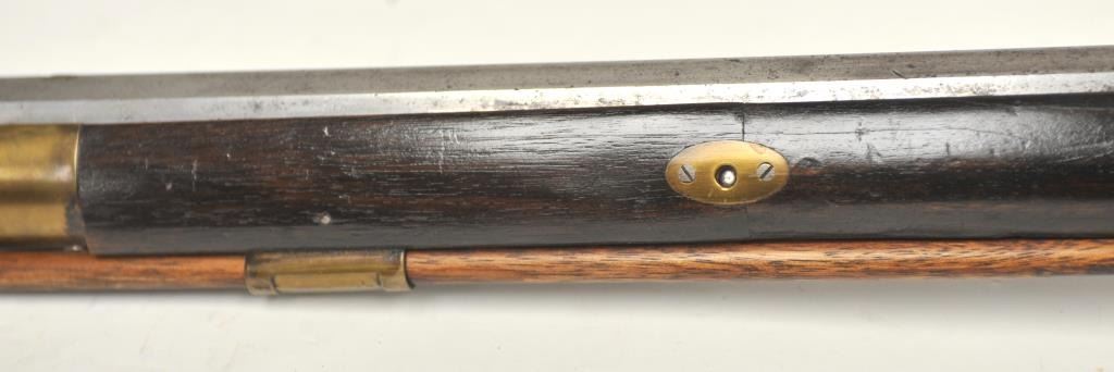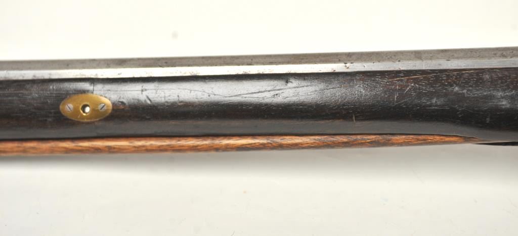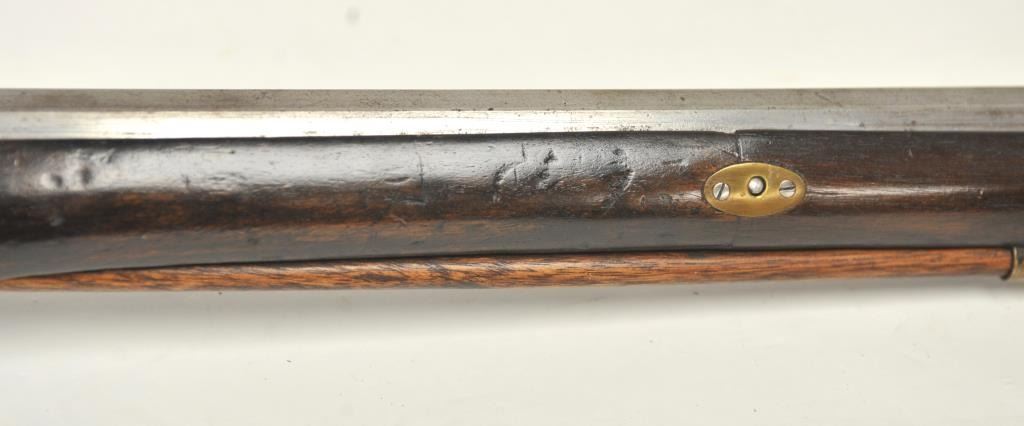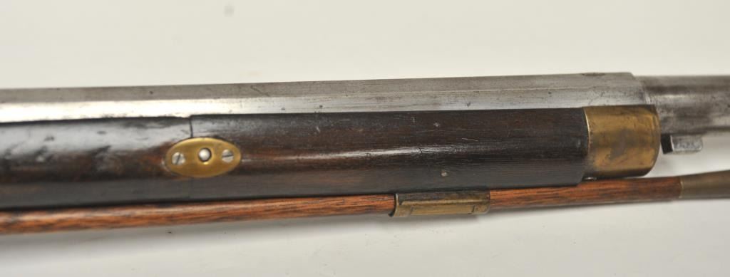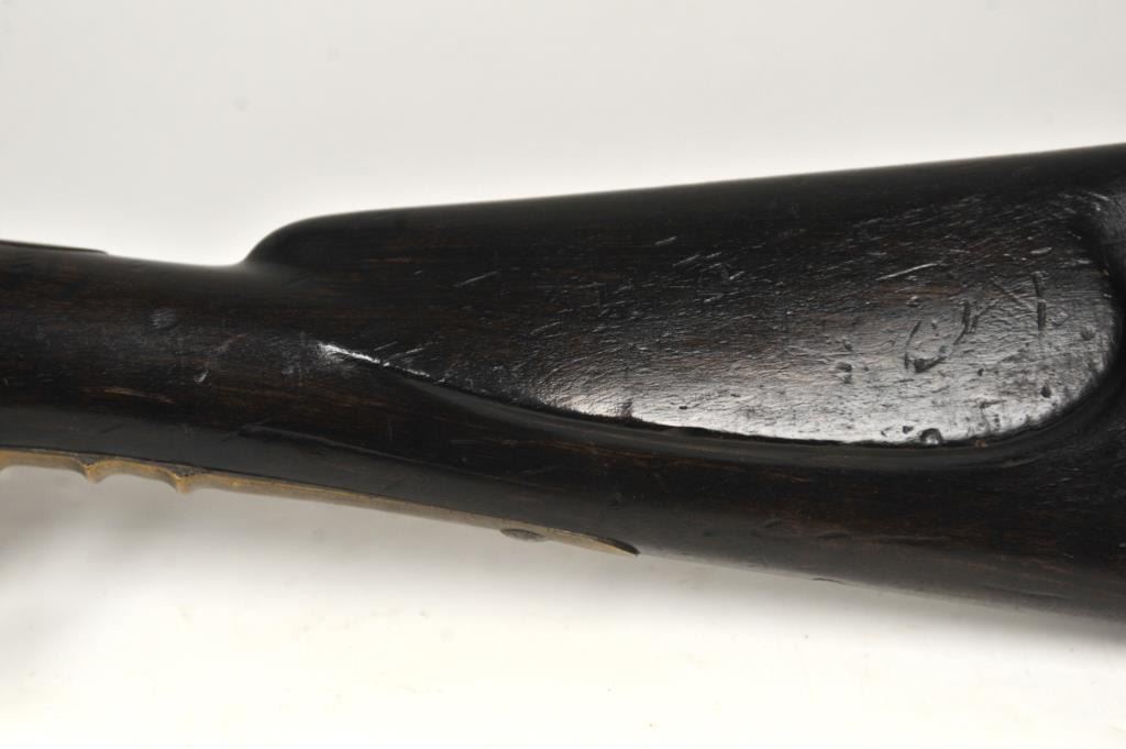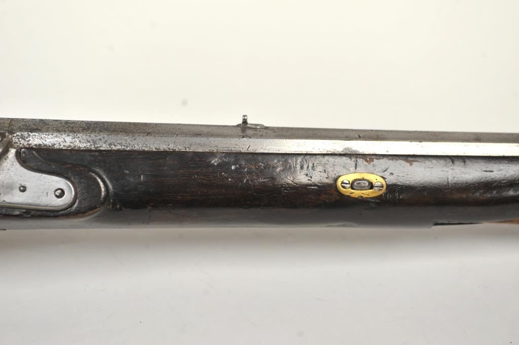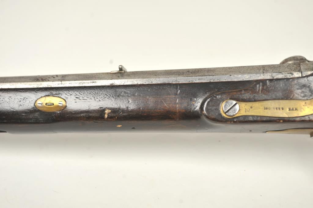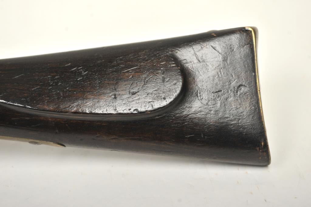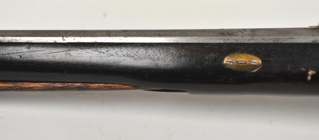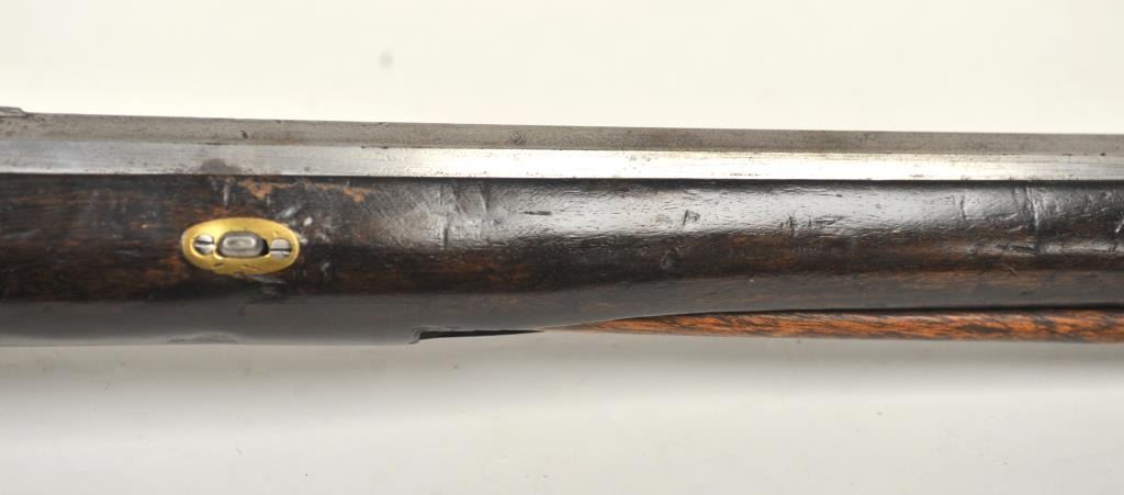 Russian flintlock carbine converted to percussion with Tula arsenal mark and dated 1842. Measures 45” overall with a 29” barrel turned round at forward 4” to accept a bayonet on under mounted stud. Crest engraved on the oval plaque at wrist “H 1” with crown and cross. 1842 date also on tang. Approximately .70 caliber rifled bore. Brass tipped wooden ramrod included. V notch and post sight. Trigger guard stamped “156” andalso marked on side plate “1842 BAK” probably arsenal conversion number, date and inspectors initials. Lightly cleaned metal surfaces with scattered light to heavy pitting at firing areas. The stock is goodwith marks, dings and wear. Russian eagle stamped on brass butt plate. (Antique) Est.: $350-$700