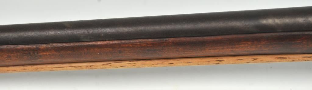 American Colonial Flintlock long arm with lock marked “Whitel, Ely” circa about 1770s and made in Massachusetts with American Cherrywood stock. Measures 69” overall with a 54” barrel of approximately .69 caliber smoothbore with plain brass mounts and lazy “S” shaped side plate similar to brown bess. Simple brass trigger guard and butt plate with crude brass ferrells. The metal surfaces show dark patina with original flintlock parts and large “Swan’s neck” hammer. The stock shows breaks and repairs and we would rate as fair to almost good. The fore end is well restored and matched being spliced in about halfway down (Extending forward to the muzzle 39”). There is a split from contact in right side of the stock (Possibly hit from ball or club mark). Some other small marks and losses however the buttstock was left original when fore end was restored long ago. There is an oval plaque inlaid at the wrist and the musket shows a lot of firing including losses of wood behind the pan. The type of arm the militia and patriots may have used when the rebellion ignited in the American Revolution. Correct style ramrod included. (Antique) Est.: $3500-$7000