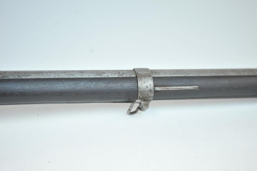 U.S. Springfield Model 1816 .69 caliber musket dated 1839 and converted from flintlock to percussion with nipple screwed directly into the barrel and hammer added. All features as standard on this model withcorrect bands and ramrod. The breech shows pitting from heavy firing and the metal is otherwise good overall. The stock is good and shows hole drilled above the trigger into lock area purposely. A dovetail for sight isfiled into the barrel but missing. The lock works well. Last sold Fred Slayton collection of confederate arms in the early 1990s. Many of these type arms were in armouries at the beginning of the war or converted to use.(Antique) Est.: $400-$800