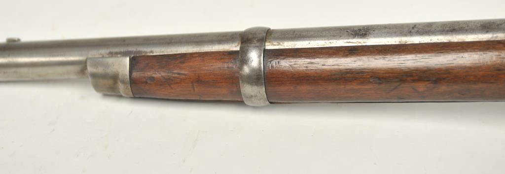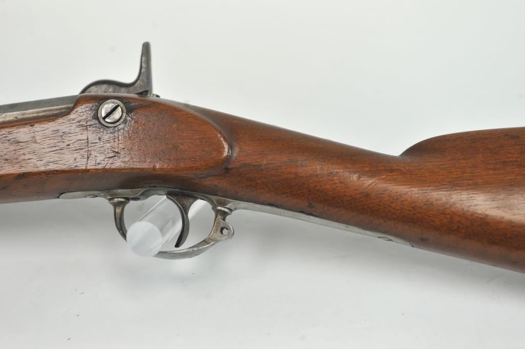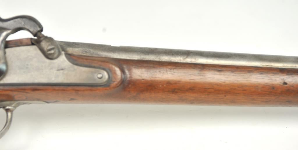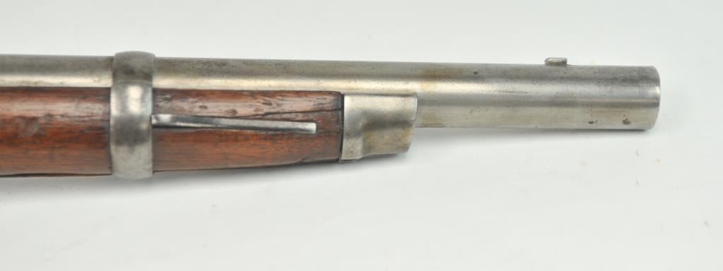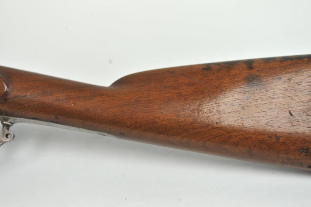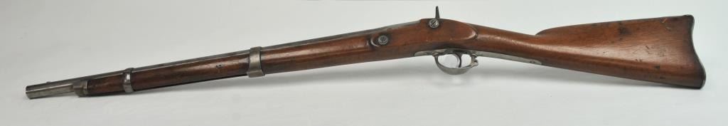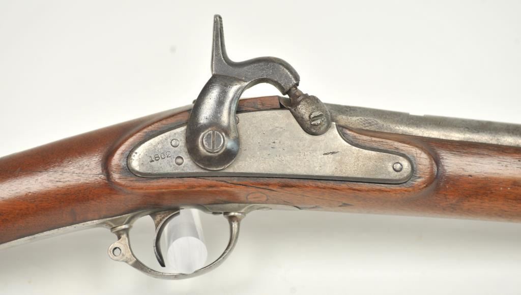Richmond 1862 Dated Musket reduced to carbine length and dated 1862 at rear of the lock. Measures 41” overall with a 25” barrel approximately .62 caliber smooth bored out from .58 and sight neatly made in smallsquare design. The rear sight has been removed from dove tail and metal cleaned long ago showing some light to heavy pitting overall with heavier pitting occurring at the breech and firing areas. The stock has beenbroken and repaired also refinished. #78 tag in butt from Fred Slayton collection sale in the 1990s. (Antique) Est.: $750-$1500