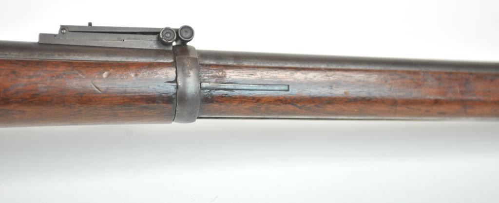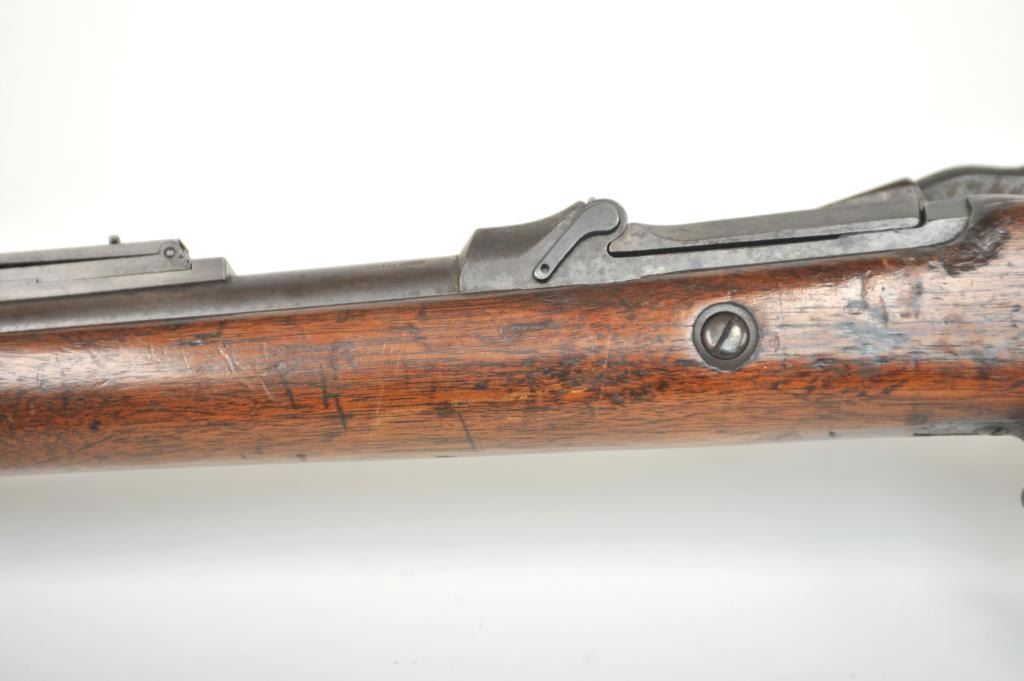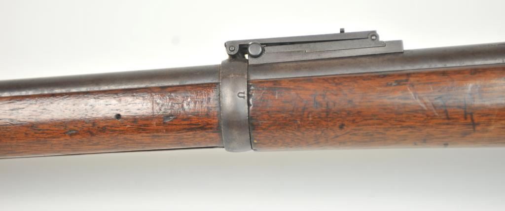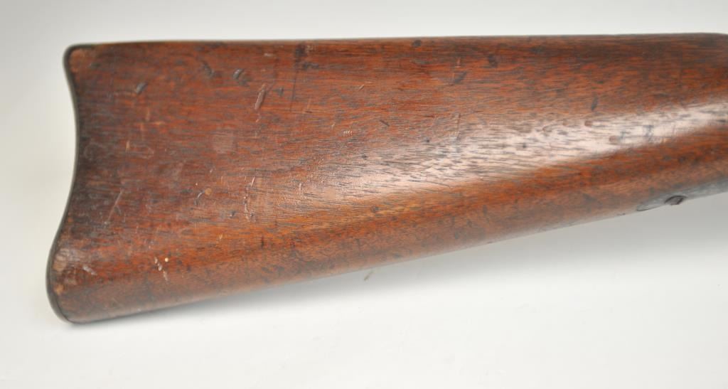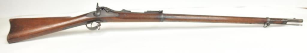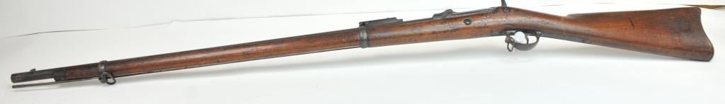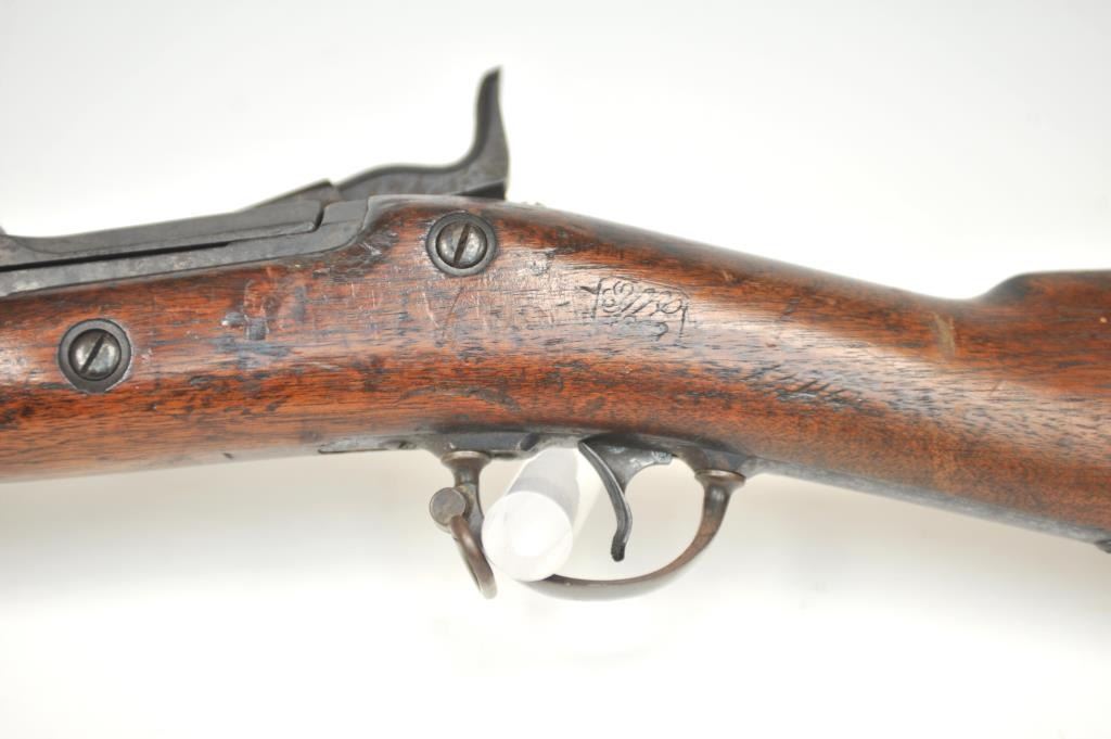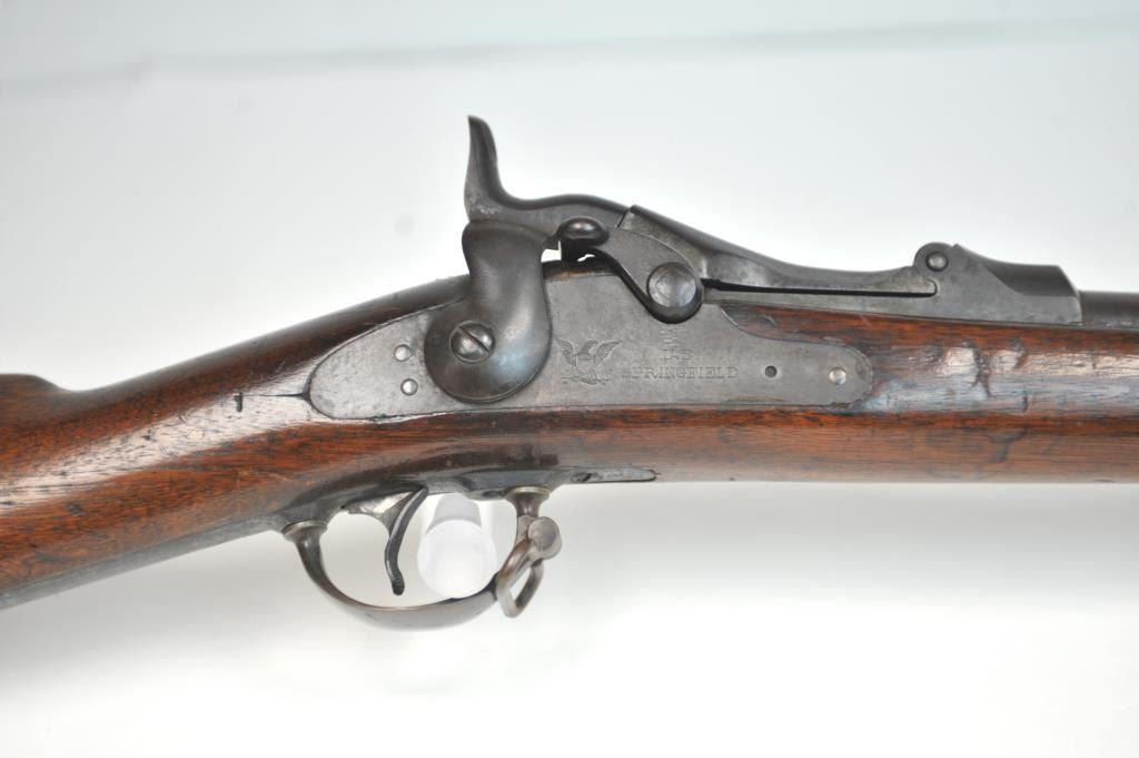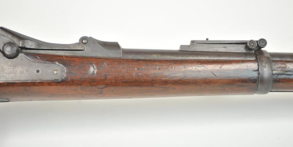 Springfield Model 1884 Trapdoor rifle in .45-70 caliber, S/N 435055 with “GA” marking above the butt plate possibly state of Georgia National Guard showing mostly visible “SVW” cartouche and 1889 date along withBuffington rear sight. Non-Springfield ramrod of the period. Traces of blue within a brown to gray patina with scattered rust and erosion which should clean well. Good eagle and lock markings. The action is tight andthe bore is good plus to very good. The stock shows dings, mars, and scratches but generally good to very good overall. (Antique) Est.: $350-$700