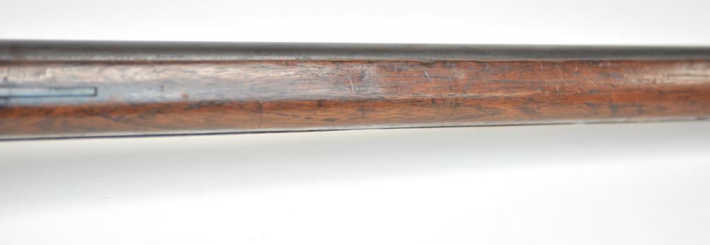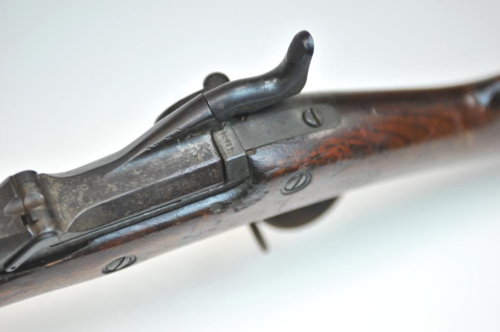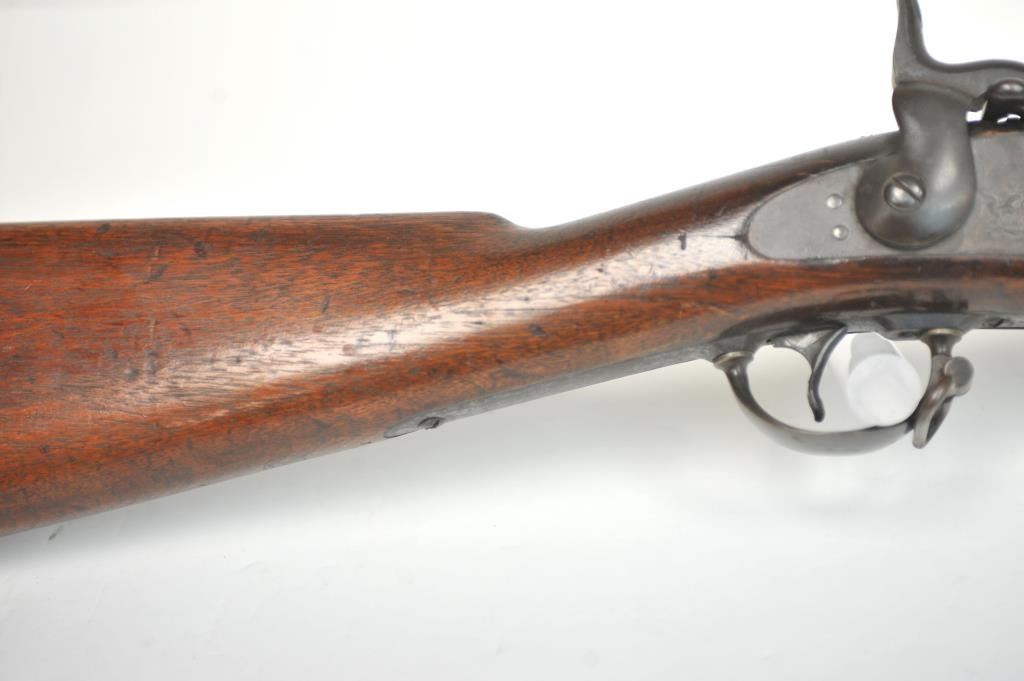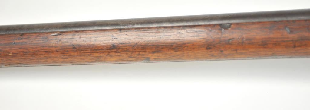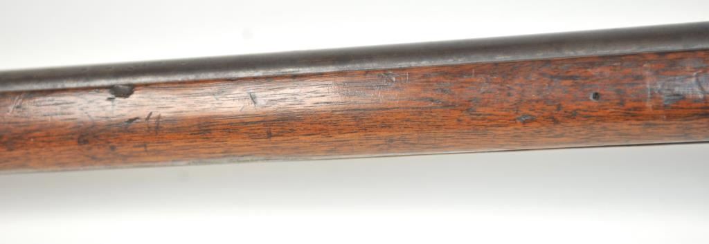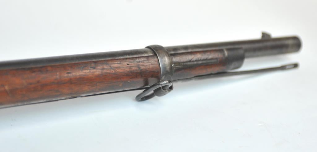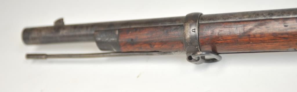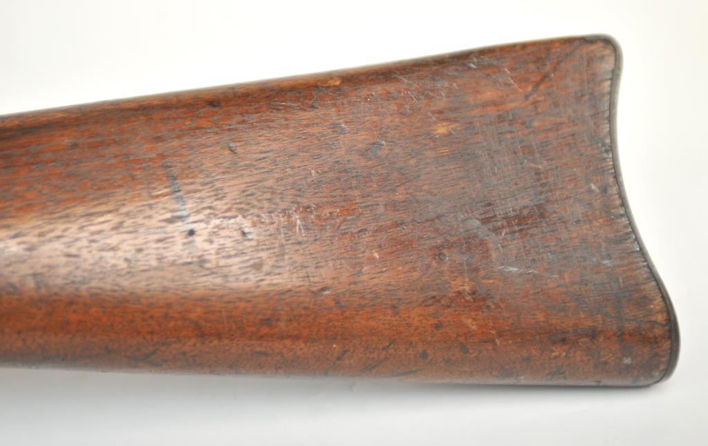 Springfield Model 1884 Trapdoor rifle in .45-70 caliber, S/N 435055 with “GA” marking above the butt plate possibly state of Georgia National Guard showing mostly visible “SVW” cartouche and 1889 date along withBuffington rear sight. Non-Springfield ramrod of the period. Traces of blue within a brown to gray patina with scattered rust and erosion which should clean well. Good eagle and lock markings. The action is tight andthe bore is good plus to very good. The stock shows dings, mars, and scratches but generally good to very good overall. (Antique) Est.: $350-$700