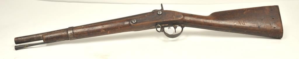 Model 1842 Musket by Springfield armoury dated 1848 and reduced to carbine length. Measures 34” overall with a 18” barrel of .69 caliber smoothbore. Brown patina with traces of original brown and case colors. Goodmarking and good to very good overall with typical dings, mars, and scratches from normal age and use. Works well. Ramrod has been shortened to match and correct style. Last sold in the Fred Slayton confederatearms collection by Little Johns in the 1990s. (Antique) Est.: $350-$700