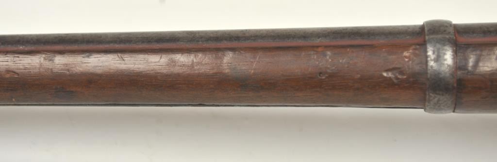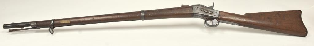 Springfield Model 1870 “U.S.N.” marked .50-70 Rolling Block rifle with under mounted stud for bayonet. Original ramrod retained and the buttock is carved at the center “FAA PUE”. The metal is good with scattered rust andlight to moderate pitting. Well marked. The rear sight has a broken leaf. The ore shows strong rifling but some pitting and erosion. Naval anchor proof at the breech possibly marine use. (Antique) Est.: $500-$1000