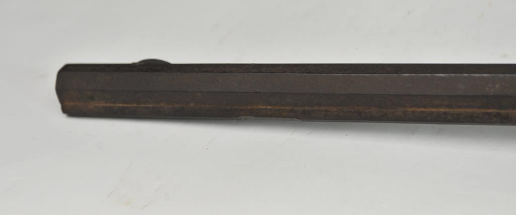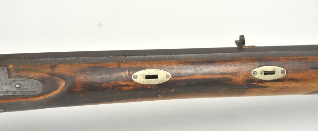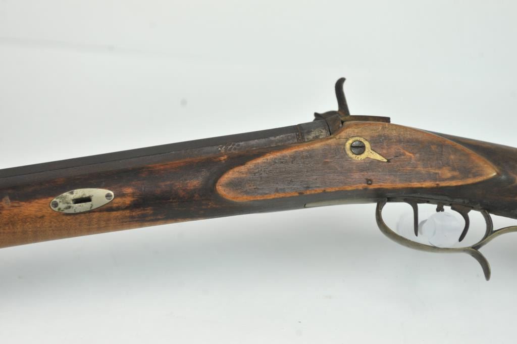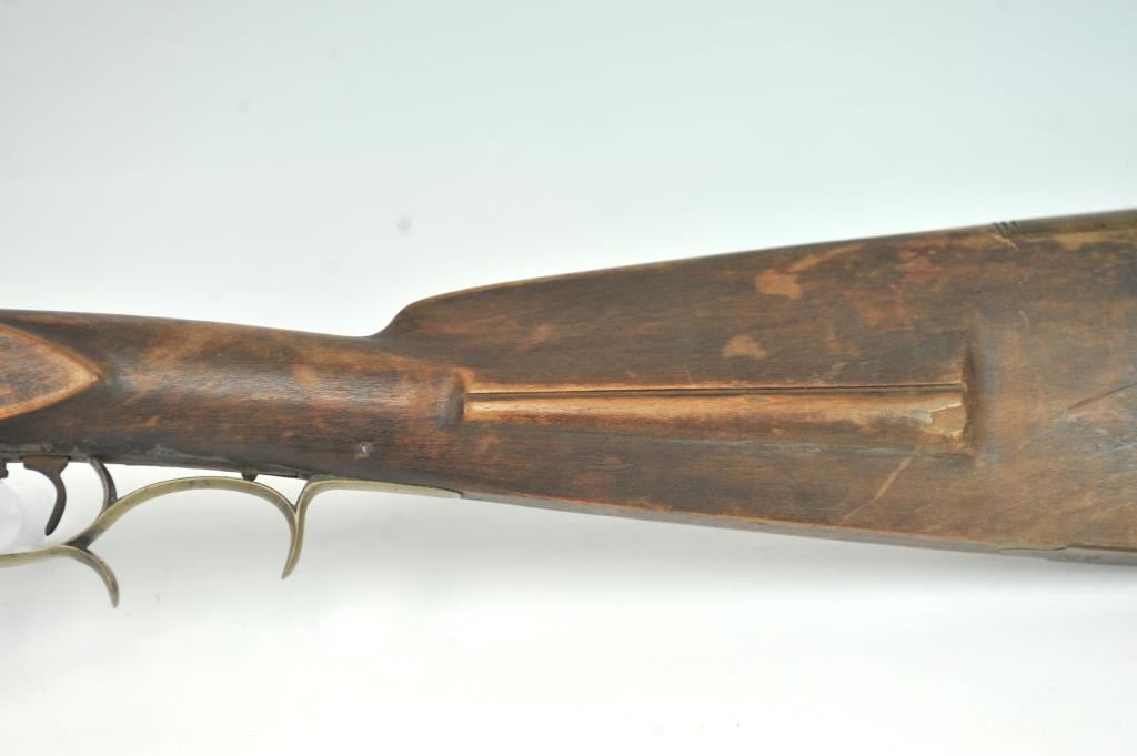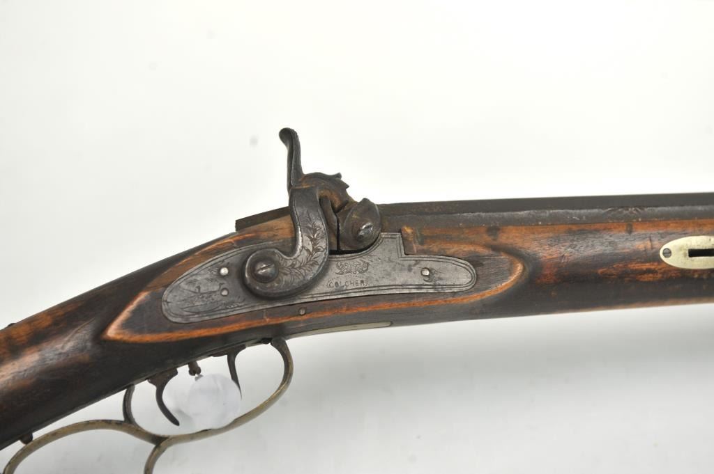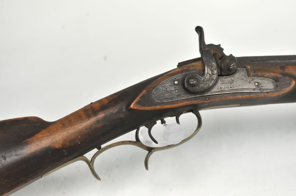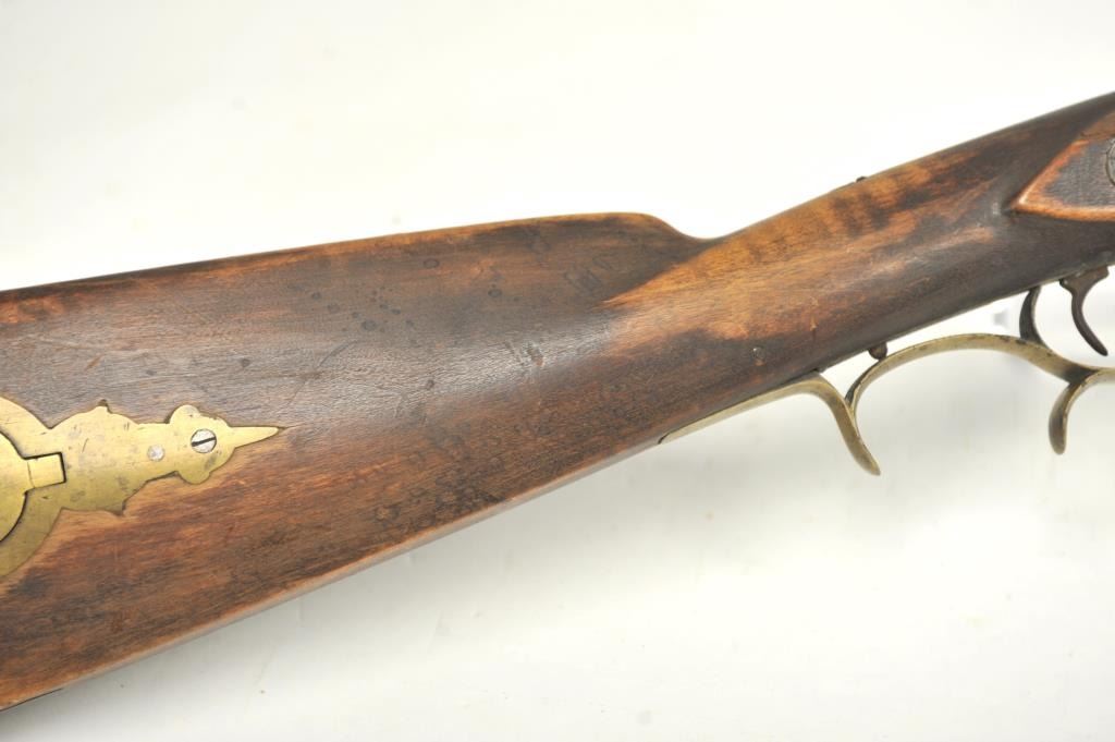 Half Stocked Percussion Plains Rifle stamped “J. Beck” engraved banner on medium weight octagon barrel secured by two keys. “Golicher” marked commercial lock. Measures 56” overall with a 40” barrel ofapproximately .36-.38 caliber rifled bore. Brass disk type patch box and plain brass mounts. Double set triggers. The metal is uncleaned and shows a dark “as found: patina. The lock cocks but doesn’t hold and hetrigger is working. The rear barrel key and ramrod are missing. The tang is broken across at the front screw. The stock is good with a small loss of wood behind the lock at the top and otherwise normal aging. The Beckfamily were significant Penn. Makers whose decedents moved west. The way Jim Gordon and frontier collectors like to find them, “Out of the attic”. Large “V” notch and blade front sight. (Antique) Est.: $500-$1000