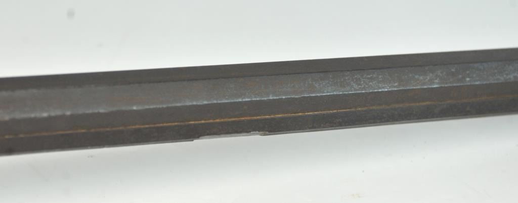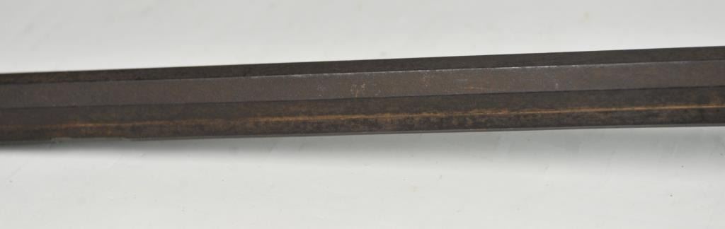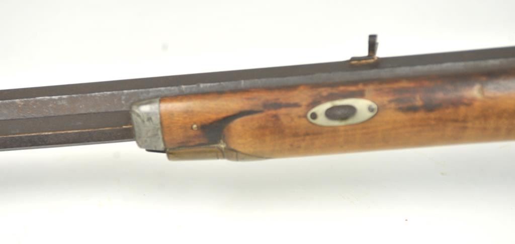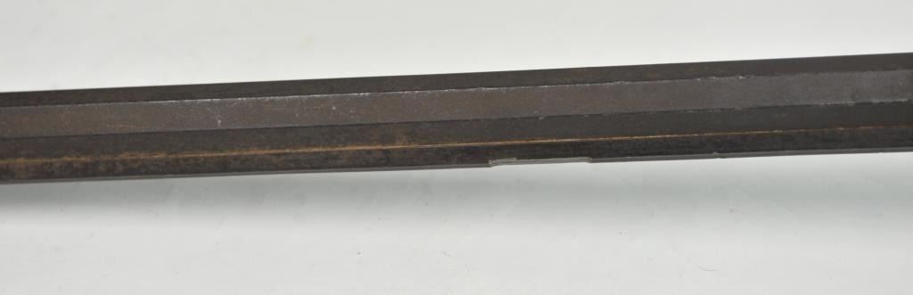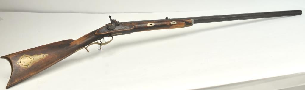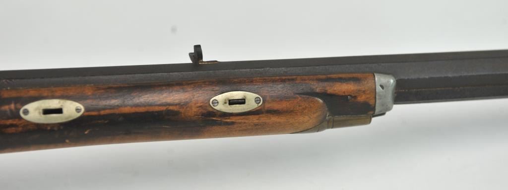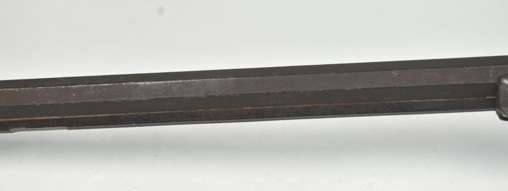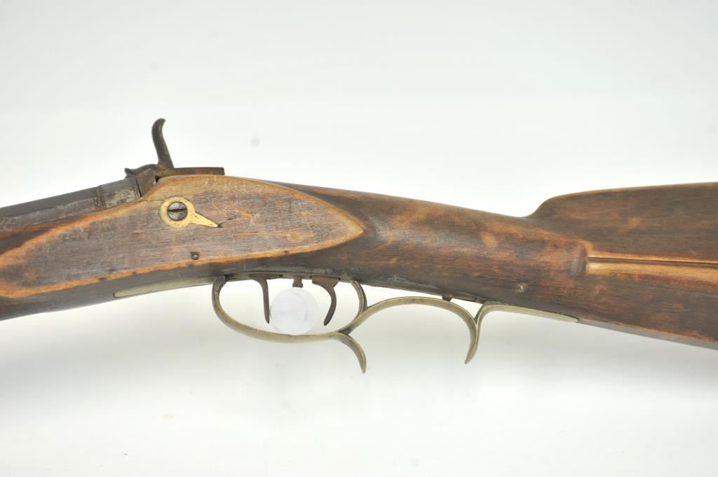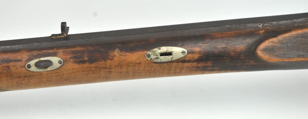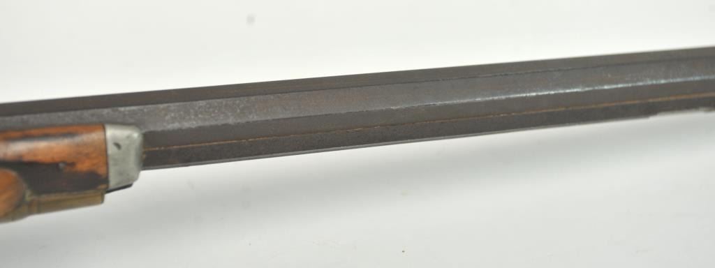 Half Stocked Percussion Plains Rifle stamped “J. Beck” engraved banner on medium weight octagon barrel secured by two keys. “Golicher” marked commercial lock. Measures 56” overall with a 40” barrel ofapproximately .36-.38 caliber rifled bore. Brass disk type patch box and plain brass mounts. Double set triggers. The metal is uncleaned and shows a dark “as found: patina. The lock cocks but doesn’t hold and hetrigger is working. The rear barrel key and ramrod are missing. The tang is broken across at the front screw. The stock is good with a small loss of wood behind the lock at the top and otherwise normal aging. The Beckfamily were significant Penn. Makers whose decedents moved west. The way Jim Gordon and frontier collectors like to find them, “Out of the attic”. Large “V” notch and blade front sight. (Antique) Est.: $500-$1000