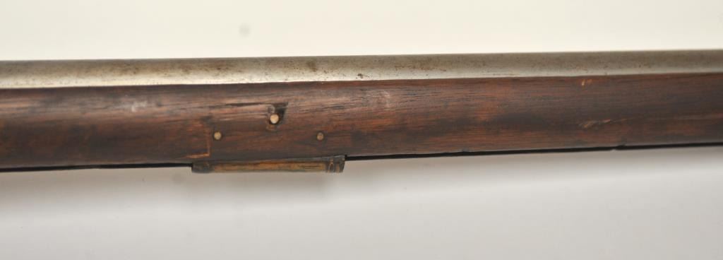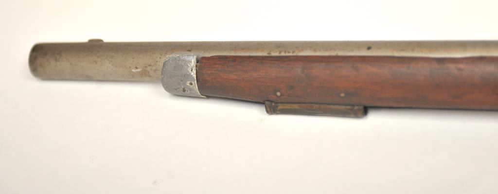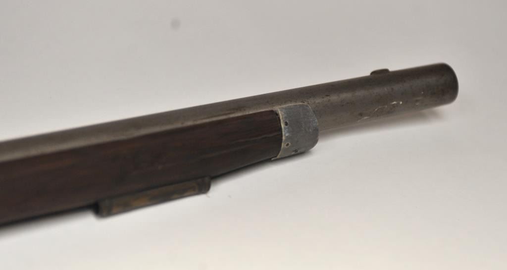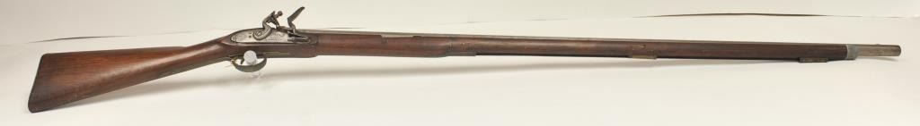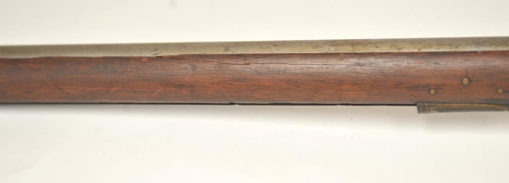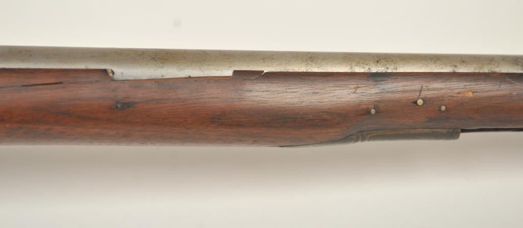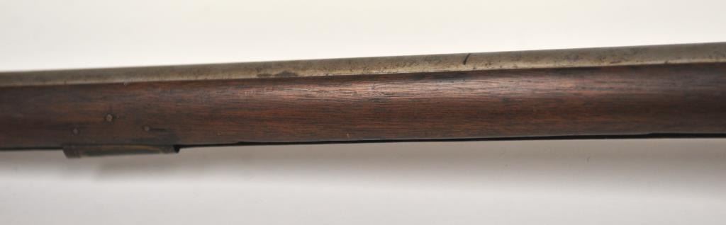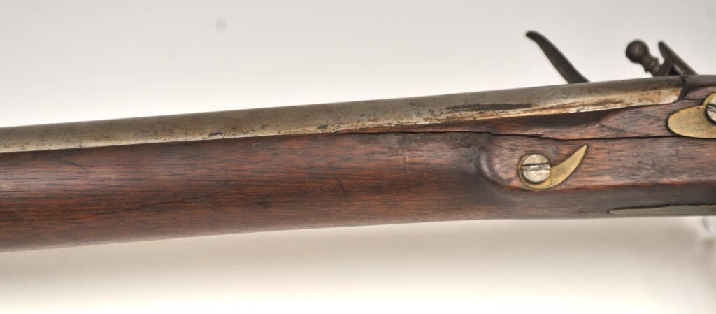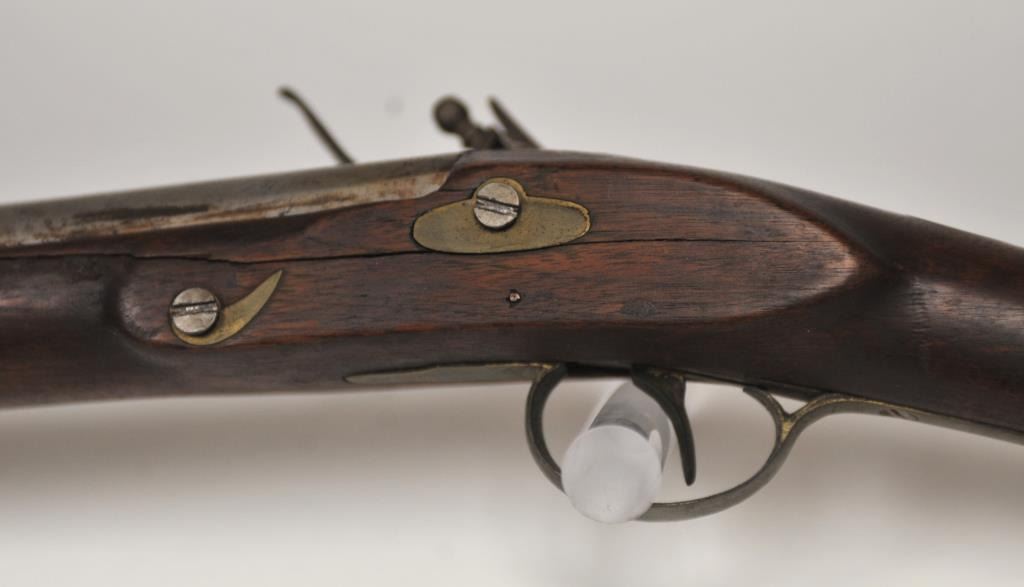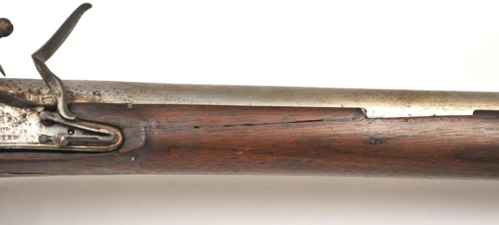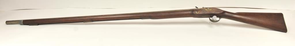 American Militia style musket with barrel marked “P M” over “L H 1831” on the left side of breech. The touch hold has been enlarged to accommodate an English replacement lock marked “London Warranted”. The lock is aclose fit but not exact with opening around the lock area and square headed nail to hold in position. Simple brass mounts and old tin sheet repair to the fore end cap area. No ramrod present. The stock shows some minorlosses, damage, light refinishing and repair. The lock works well with all correct parts and shows many years of use with this gun. Measures 57” overall with a 42” bore of .70 caliber plus smoothbore. (Antique) Est.:$350-$700