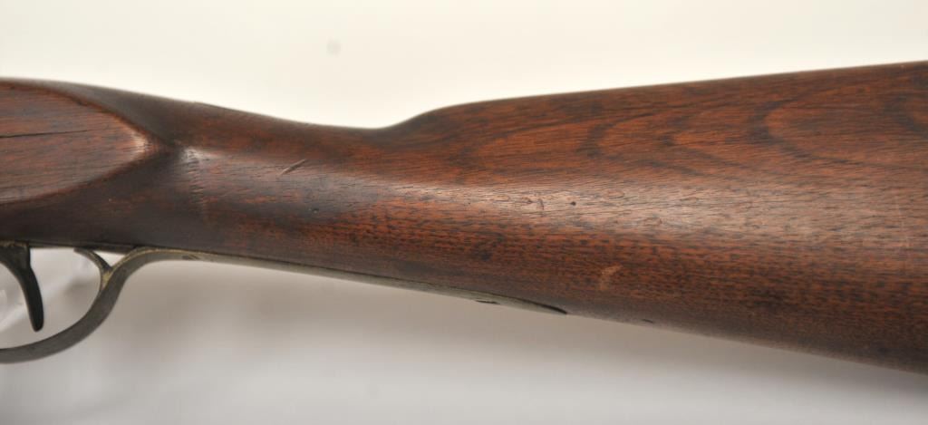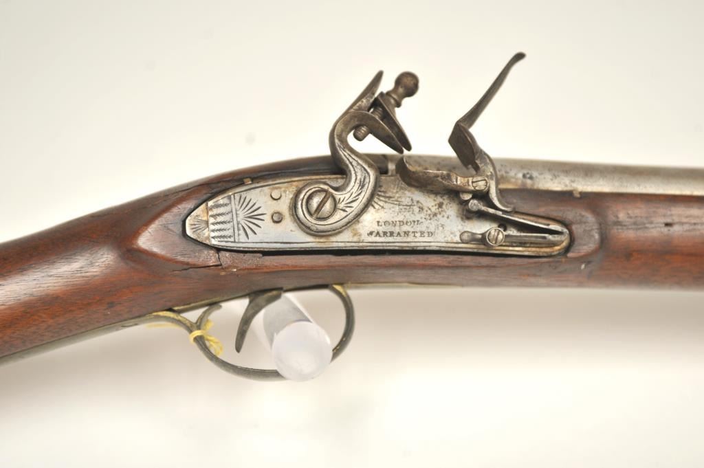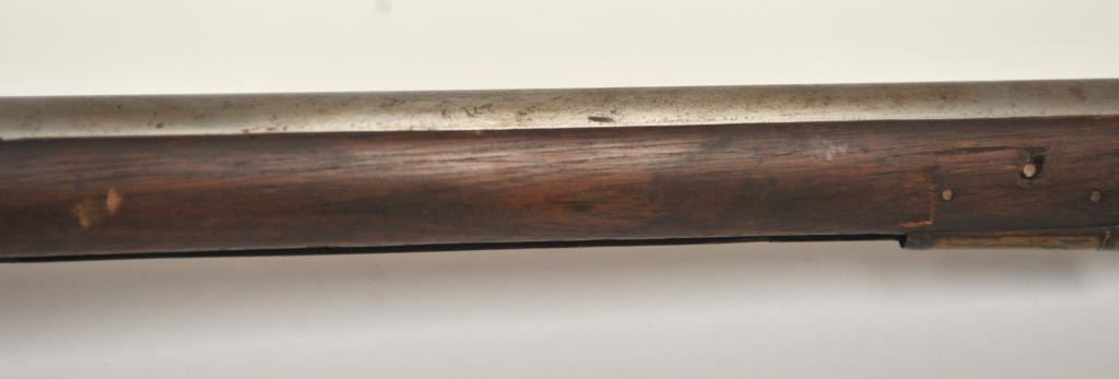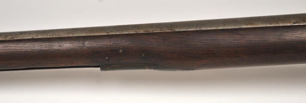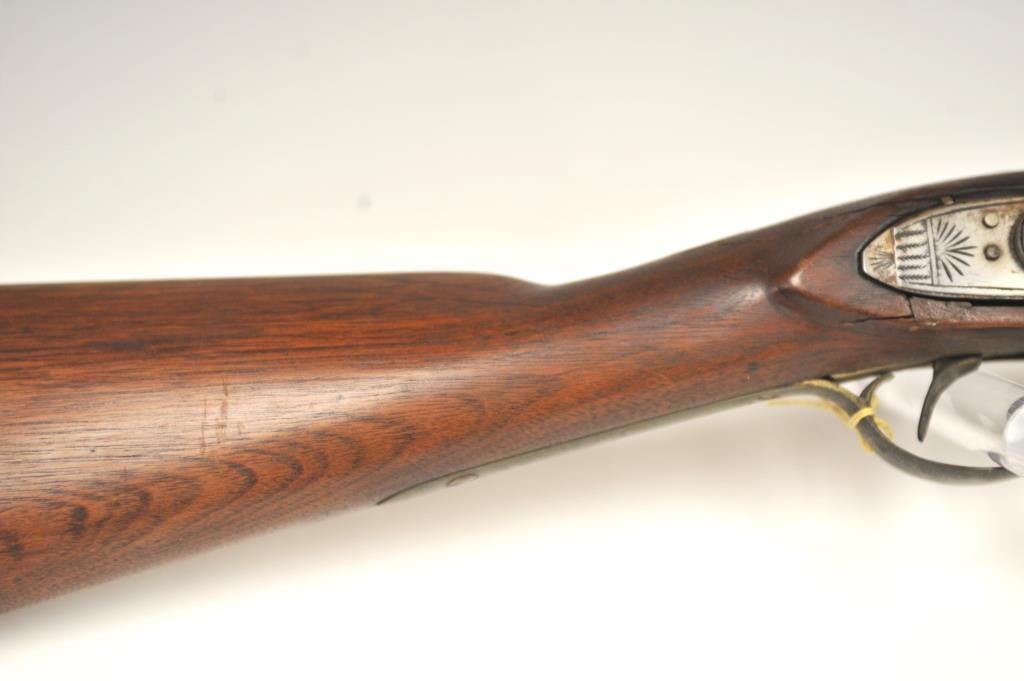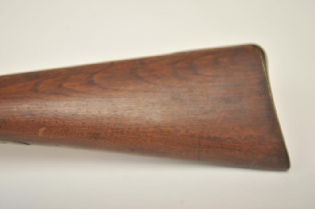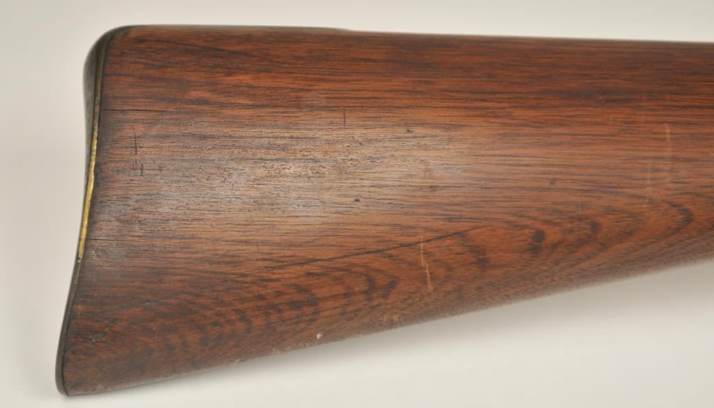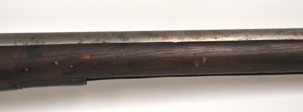 American Militia style musket with barrel marked “P M” over “L H 1831” on the left side of breech. The touch hold has been enlarged to accommodate an English replacement lock marked “London Warranted”. The lock is aclose fit but not exact with opening around the lock area and square headed nail to hold in position. Simple brass mounts and old tin sheet repair to the fore end cap area. No ramrod present. The stock shows some minorlosses, damage, light refinishing and repair. The lock works well with all correct parts and shows many years of use with this gun. Measures 57” overall with a 42” bore of .70 caliber plus smoothbore. (Antique) Est.:$350-$700