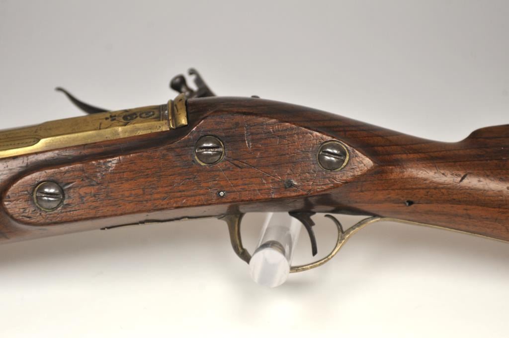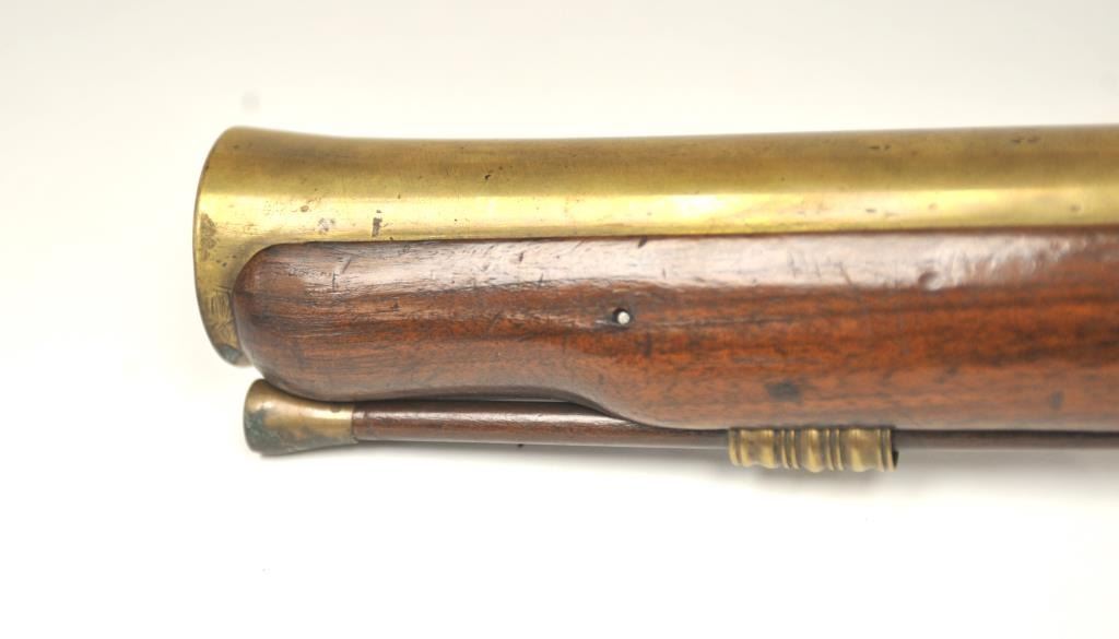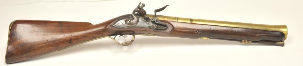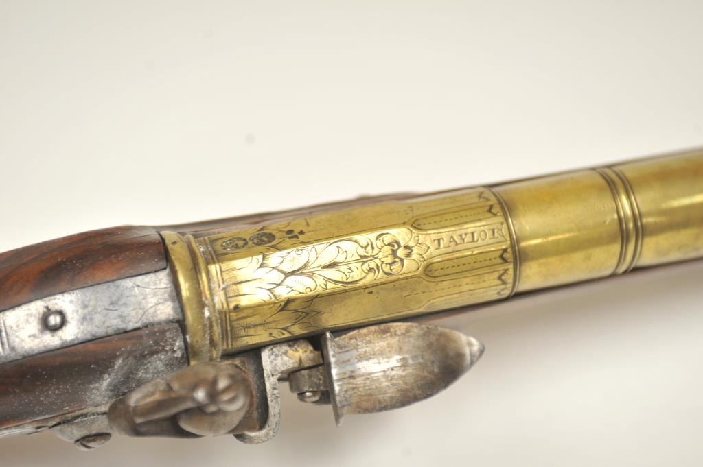 Early 18th Century flintlock blunderbuss with 3 stage brass cannon barrel signed “G. Taylor” on both the lock and barrel with British proofs circa late 17th to early 18th century who was known for his naval arms.Shows unbridled frizzen and banana shaped lock with long point rear, 3 screws to hold the lock with no escutcheons or side plate and other early features. The condition is very good plus overall with sharp engravingon the lock and barrel. The stock is also very good with some losses around 1 pin hold and just minor wear. All original flintlock parts and correct style rod which is probably the original. Works well and the barrelengraving is excellent at the rear end of the barrel. Measures 31 ½” overall with a 16 ½” heavy cannon type barrel flared at the end of approximately 1 ¼” to the inside walls of the bore. An early and quality blunderbuss by a good maker with a great barrel. (Antique) Est.: $2000-$4000