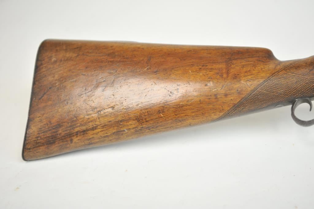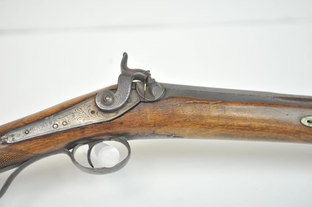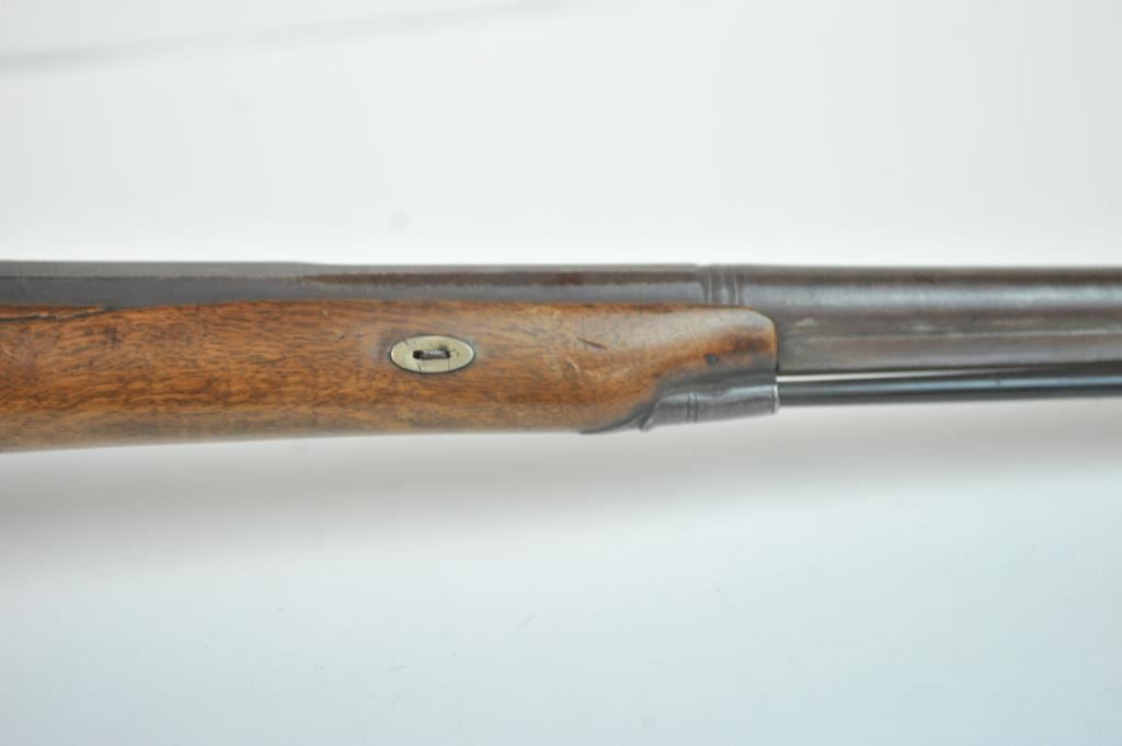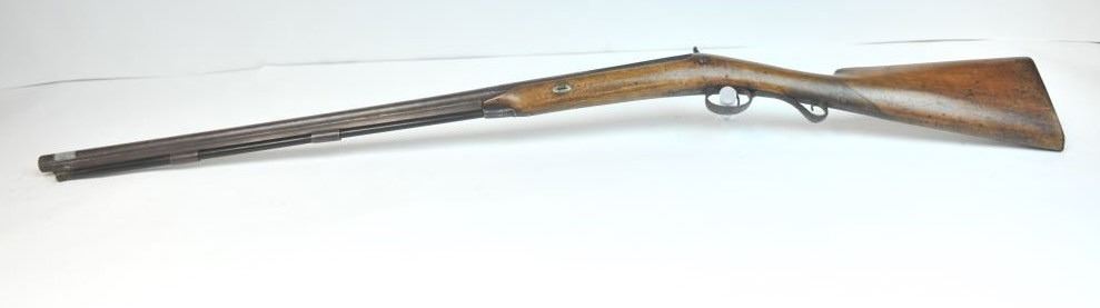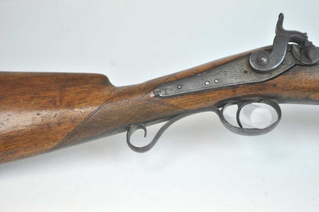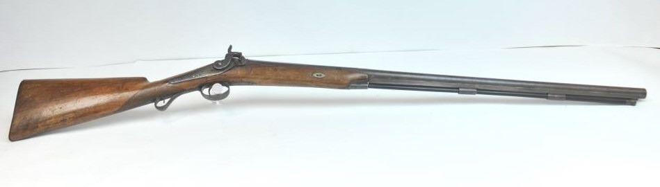 Late Percussion half stock Fowler marked “Manton” on the back action lock. Measures 46” overall with a 31” barrel in 12 gauge. Retains original period ramrod. The lock works well and the metal shows a good patinafinish with minor aging. The stocks are good with wear to the checkering, minor losses and normal aging. Last sold in Fred Slayton collection of confederate arms. Mr. Slayton obtained many arms like this English one from descendants of Confederates down South. (Antique) Est.: $250-$500